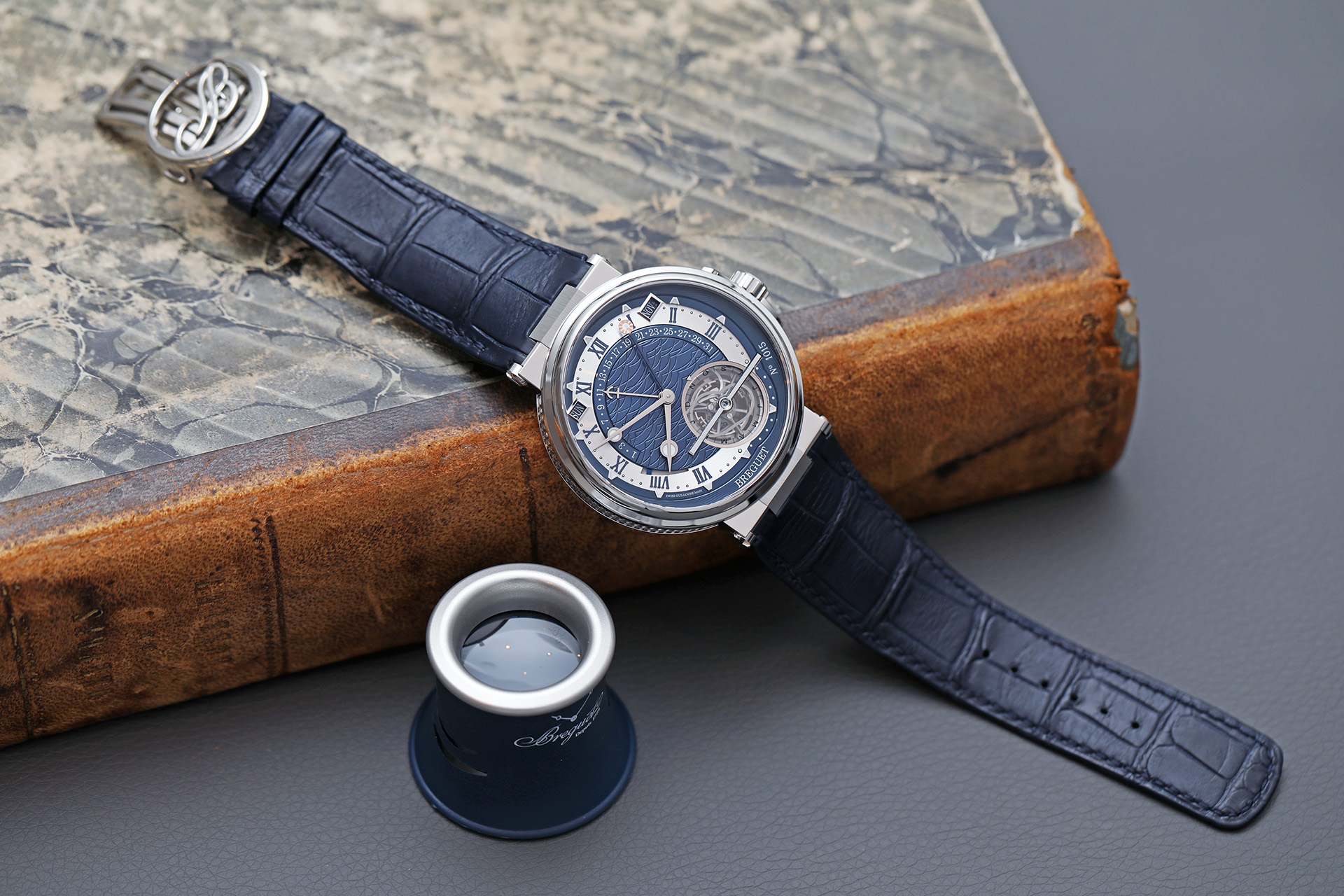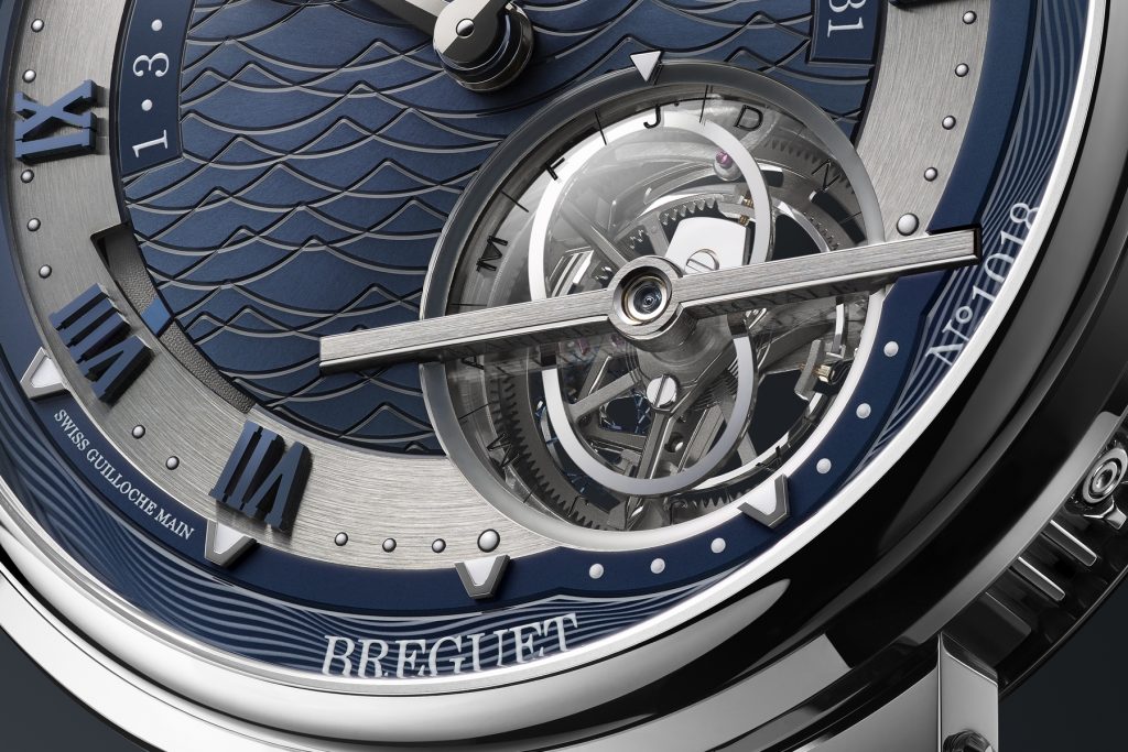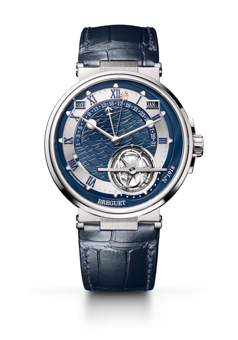 1815년 프랑스 왕립 해군의 공식 크로노미터 제작자로 임명된 아브라함 루이 브레게는, 당대 가장 정교한 균시차 시계를 만든 장인으로 기록되어 있다. 마린 에콰시옹 마샹 5887은 그 유산을 현대적으로 재해석한 플래그십 타임피스다. 이 시계는 평균태양시와 진태양시를 두 개의 독립된 핸즈로 표시하는 ‘에콰시옹 마샹(Equation Marchante)’ 방식을 채택해, 별도의 암산 없이 다이얼만 보고도 균시차를 직관적으로 읽을 수 있다. 5시 방향의 투르비옹 케이지 위에는 아날렘마 형태의 균시차 캠이 드러나 있어, 균시차 메커니즘이 실제로 어떻게 작동하는지를 시각적으로 보여준다. 퍼페추얼 캘린더와 바다를 연상시키는 조각 장식까지 더해져, 브레게의 컬플리케이션 유산과 현대적인 마린 코드가 공존한다.ᅠ