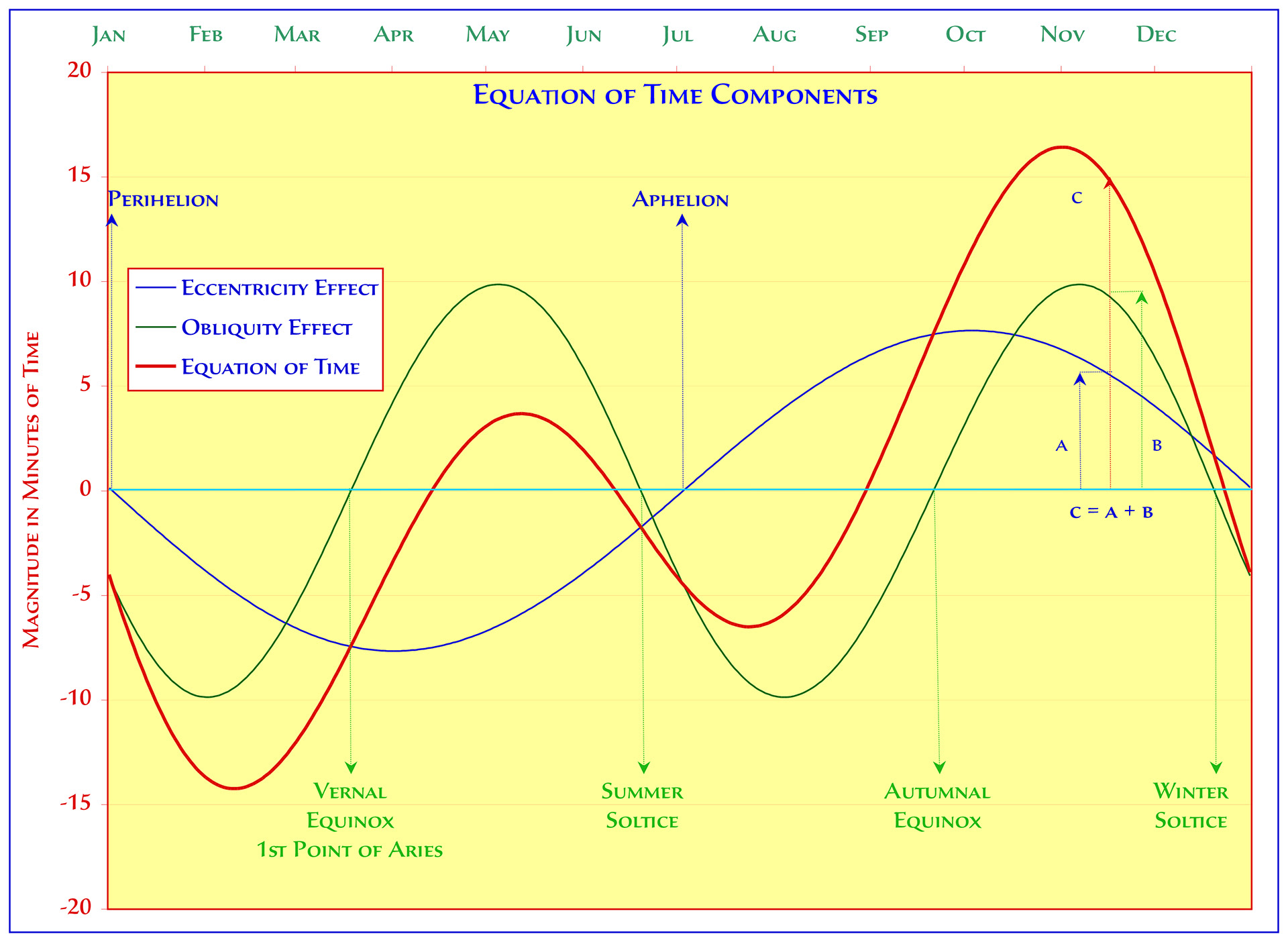 균시차는 근본적으로 지구의 자전과 공전 특성에서 비롯된다. 태양이 남중하는 시각(정오)을 기준으로 다음 남중까지 걸리는 시간을 ‘진태양일’이라 한다. 진태양시는 진태양일을 하루로 삼은 시간 체계다. 문제는 이 진태양일이 매일 조금씩 다르다는 점이다. 그 이유는 크게 두 가지다.