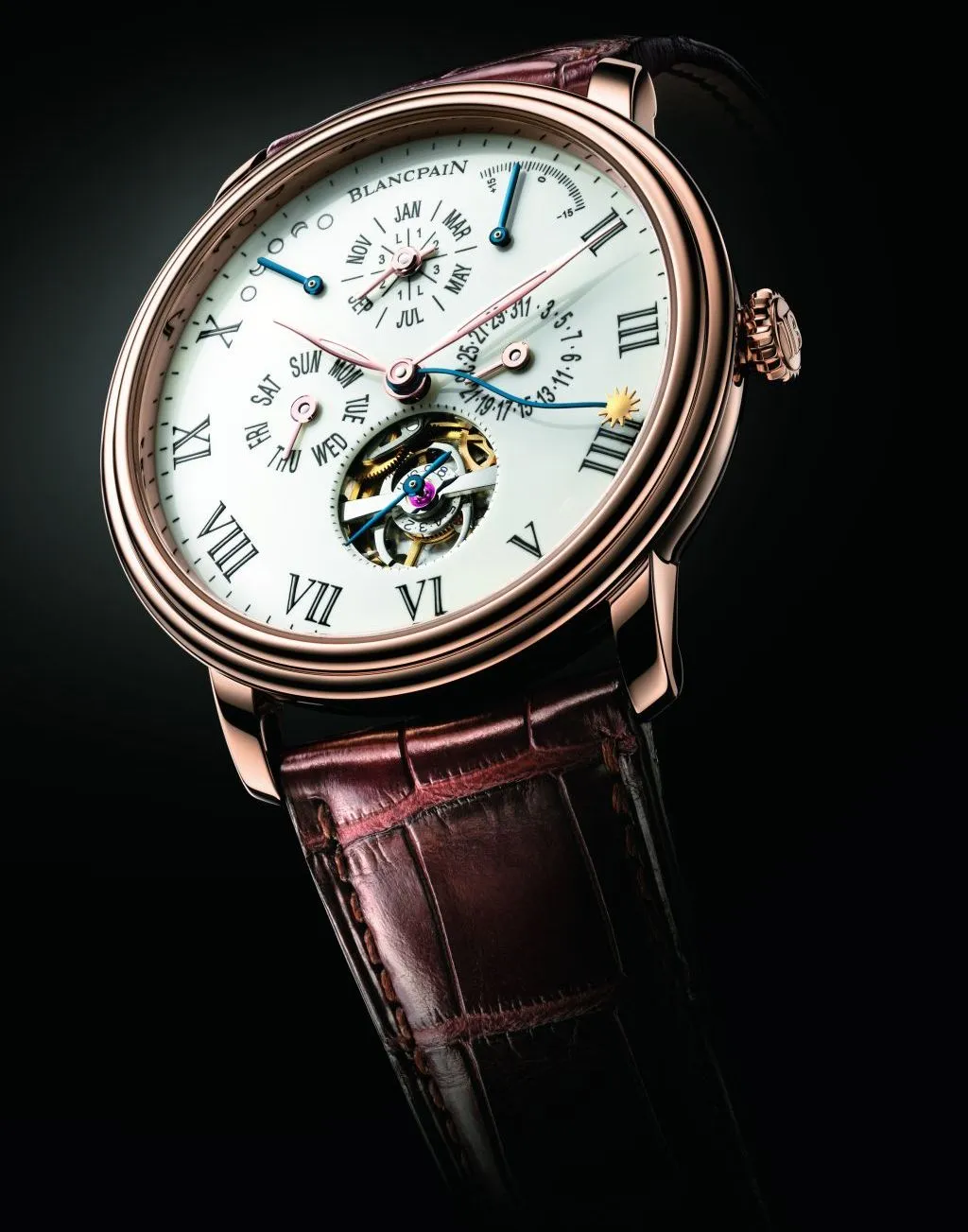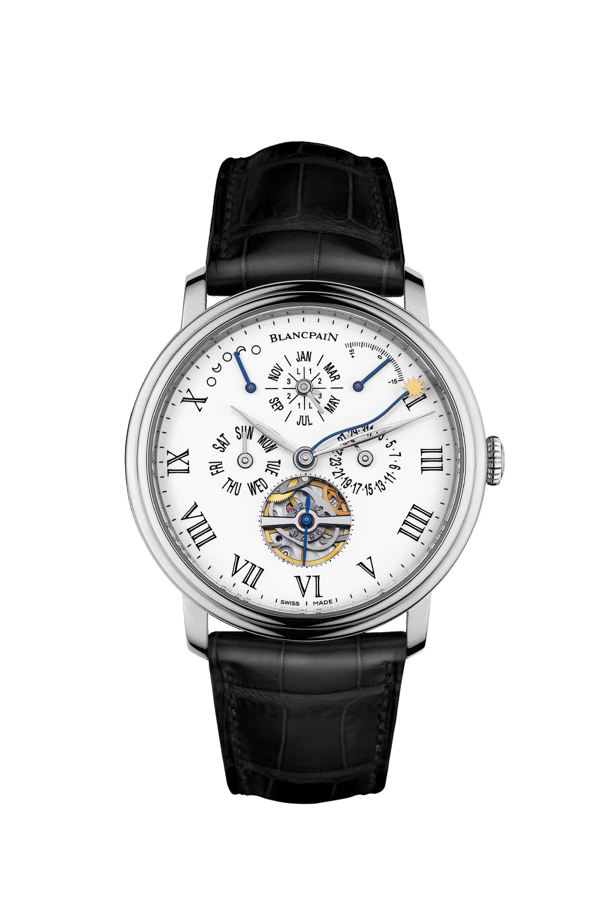 블랑팡 최초의 균시차 손목시계로, 빌레레 컬렉션 특유의 클래식한 디자인 언어 안에 복잡한 천문 컴플리케이션을 우아하게 녹여냈다. 다이얼 1시 방향에는 ± 눈금으로 균시차 값을 표시하는 인디케이터가 자리하고, 동시에 별도의 태양시 핸즈를 추가해 진태양시를 직관적으로 읽을 수 있게 했다. 태양시 핸즈는 빌레레 특유의 구불구불한 서펀타인(Serpentine) 형태를 취해, 태양의 유기적인 궤적을 유머러스하게 형상화한다. 6시 방향의 둥근 창을 통해서는 균시차를 구현하는 아날렘마 캠이 보이는데, 순수한 기계 장치를 통해 자연의 시간을 프로그래밍해 놓았다는 사실을 실감할 수 있다. 세 개의 서브 다이얼로 구성된 퍼페추얼 캘린더와 11시 방향 레트로그레이드 문페이즈는 다이얼의 좌우 균형을 섬세하게 맞춰준다.