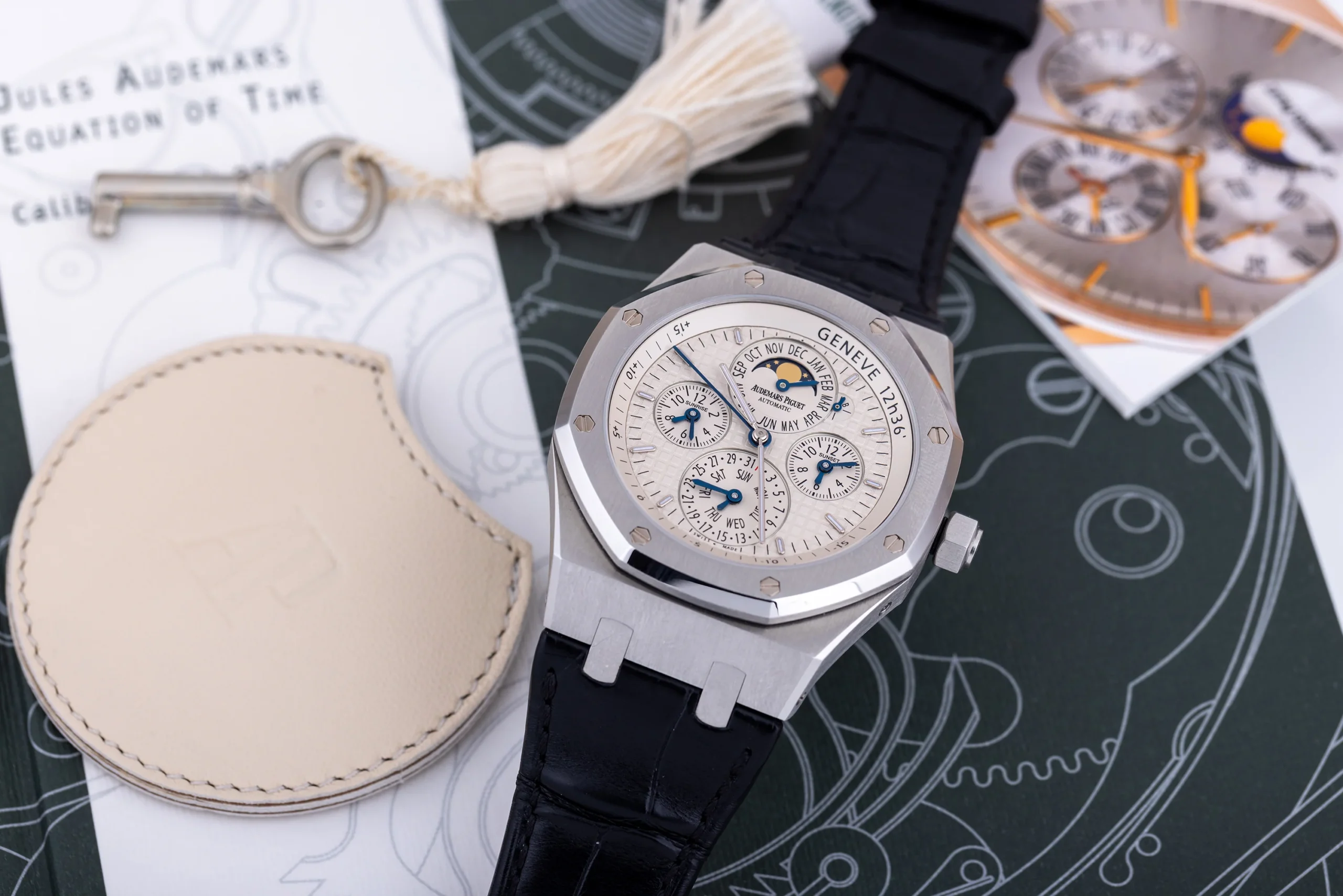 오데마 피게가 1990년대 후반 선보인 로열 오크 이퀘이션 오브 타임은, 스포츠 럭셔리 아이콘인 로열 오크의 육각 베젤과 기하학적 케이스 안에 균시차(EoT), 일출·일몰 시간, 퍼페추얼 캘린더를 통합한 하이 컴플리케이션 모델이다. 다이얼 외곽의 플랜지에 균시차를 위한 인덱스를 별도로 프린팅했고 파란색 중앙 바톤 핸즈로 표시한다. 보통 균시차 시계는 클래식한 라운드 케이스의 드레스 워치에서 발견되는데, AP는 이를 스포츠 워치 로열 오크 안에 녹여냈다. 선박 창문에서 영감을 받은 팔각 베젤과 항해에서 활용하던 균시차 기능이 어우러지면서 어쩐지 바다가 자연스럽게 연상되기도 한다.