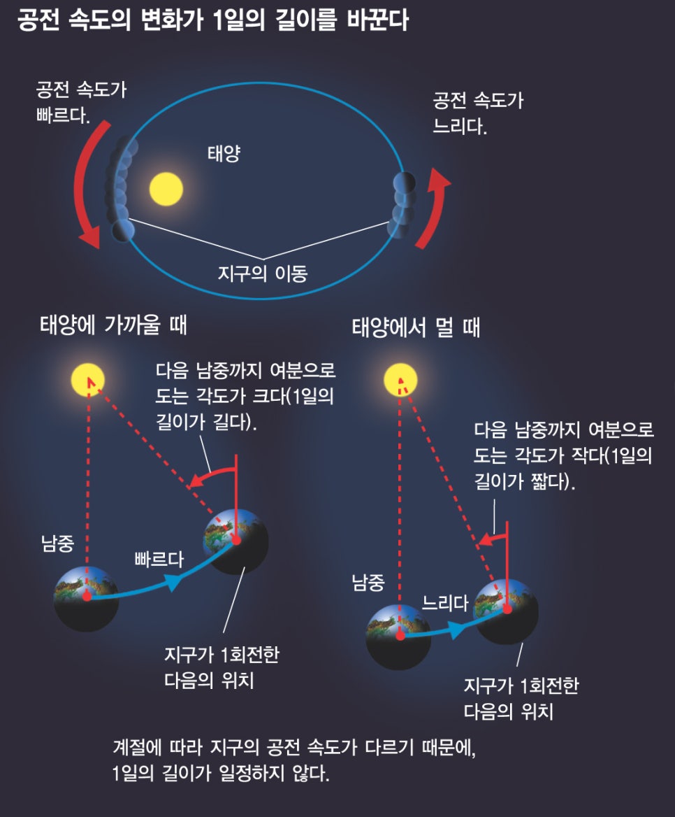 첫 번째 이유는 지구의 공전 궤도가 완전한 원이 아니라 타원이라는 점이다. 지구는 자전하면서 동시에 타원 궤도를 따라 태양을 공전하는데, 태양과의 거리와 공전 속도는 계절에 따라 달라진다. 공전 속도가 빠를수록 같은 양의 자전을 해도 태양이 하늘에서 같은 위치에 이르기까지 더 많은 각도가 필요하다. 그만큼 진태양일은 길어진다.