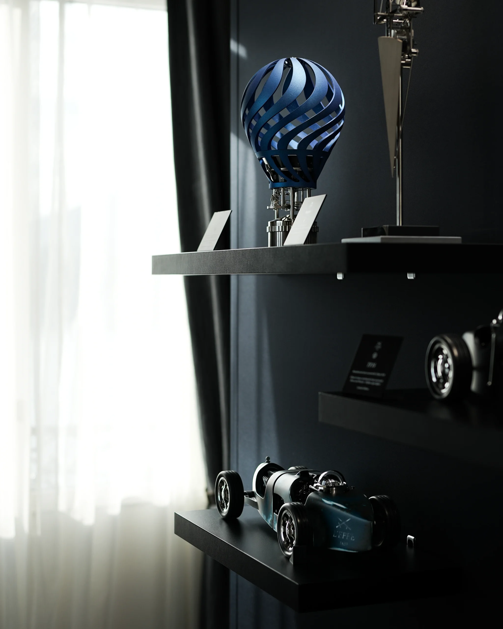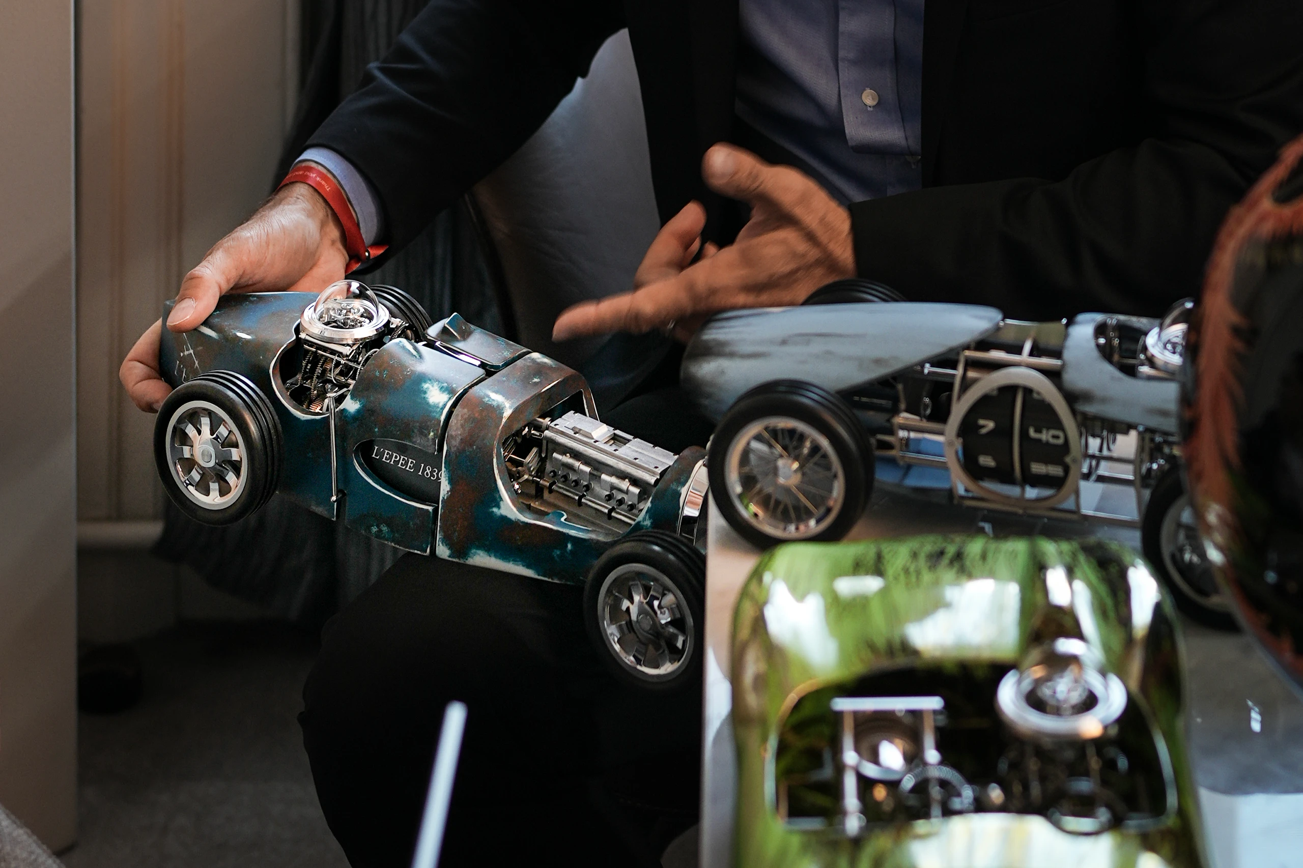레페의 거의 모든 제품은 아티스트와 함께 만든다. 플라잉 투르비용이 있는 피닉스도 그 중 하나다. 전체를 손으로 페인팅한 작품이다. 여기 있는 이 파란색 자동차(타임 패스트 D8)도 PVD 코팅이 아닌 핸드 페인팅으로 제작했다. 표면을 자세히 보면 얼마나 균일하게 칠했는지 알 수 있다. 그게 바로 아티스트의 비밀이다. 빛에 따라 밝은 파란색 혹은 보라색으로 보인다.