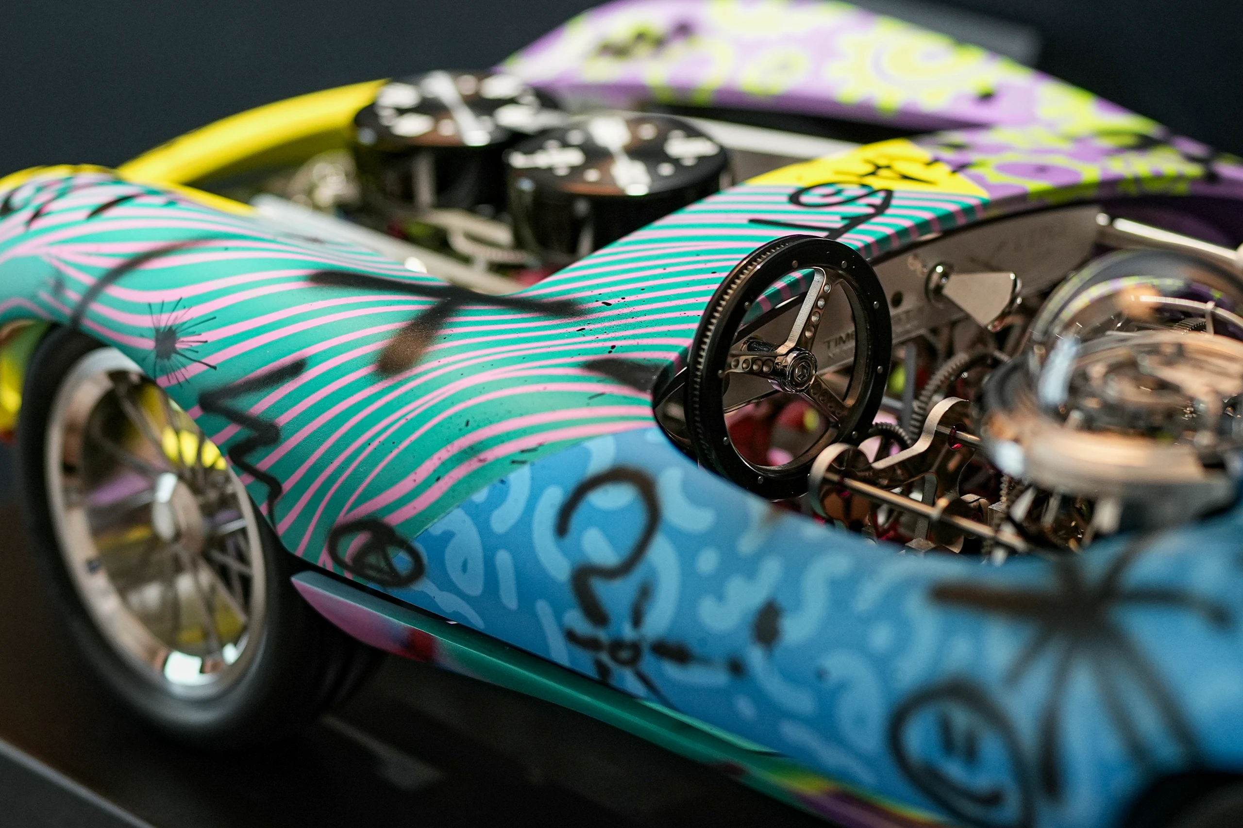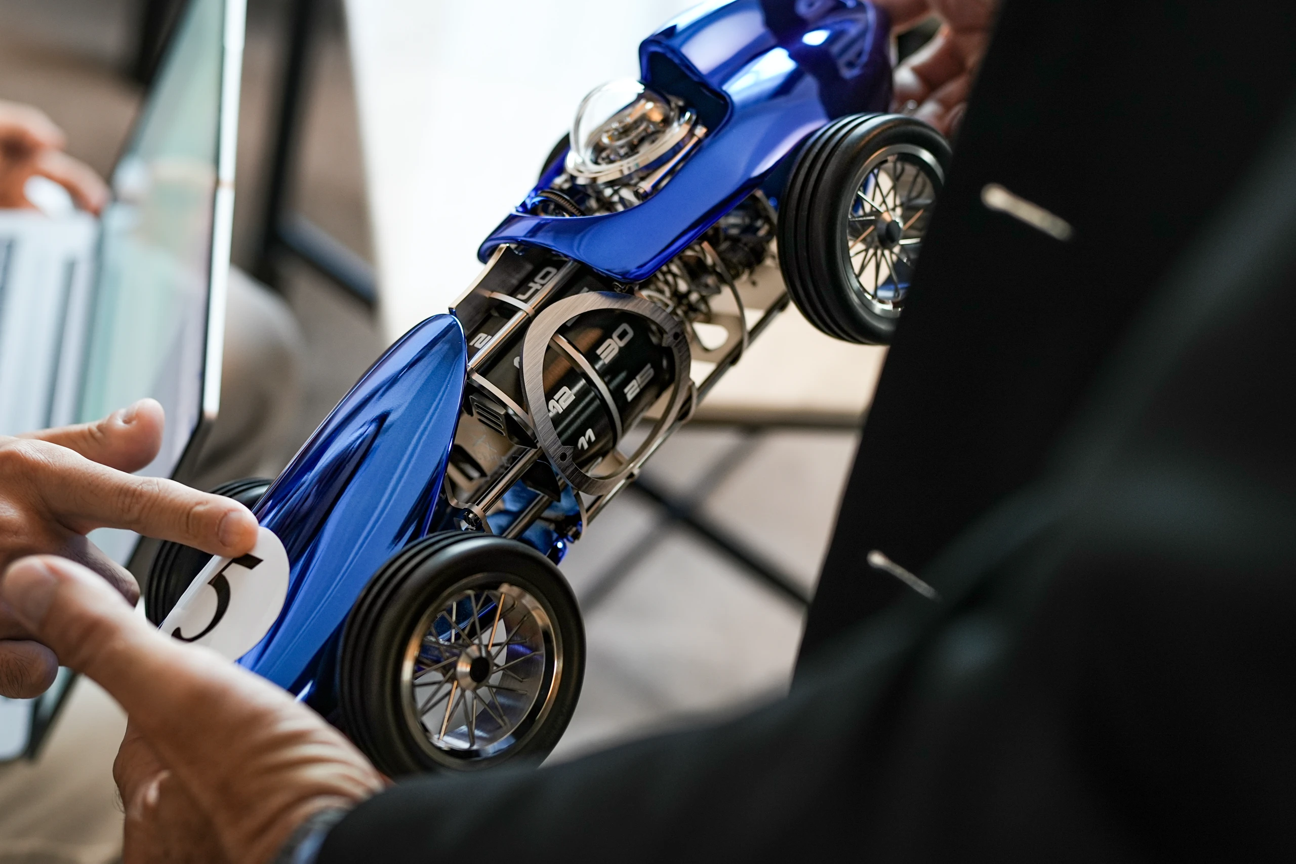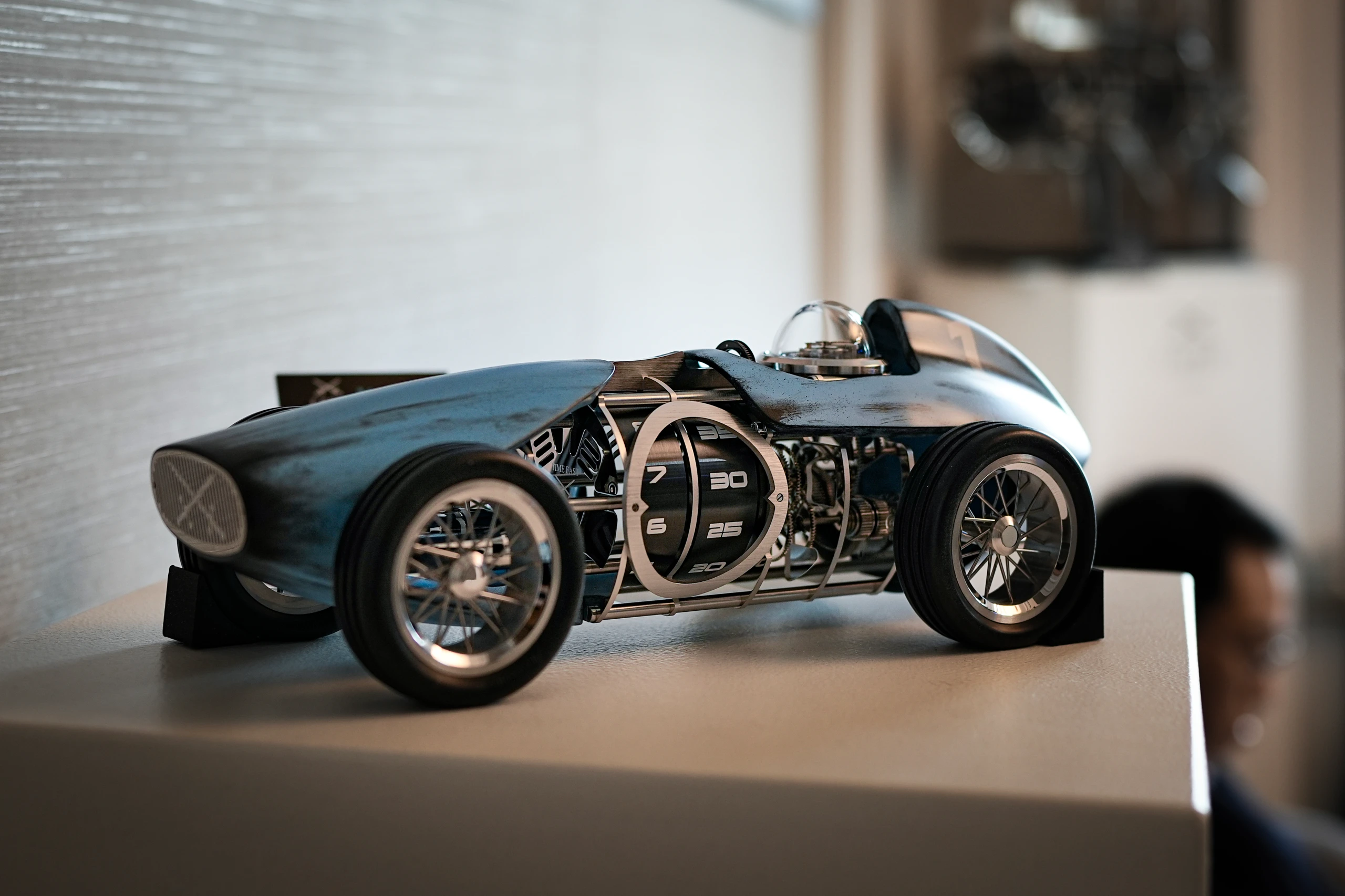 대시보드에는 열쇠가 있다. 요즘은 스마트 버튼이 대세지만 예전에는 시동을 걸려면 열쇠를 꼽고 돌려야 했다. 시동을 걸면 V8 엔진이 팬과 함께 돌아가기 시작한다. 운전석 옆에는 기어박스가 있는데 주행, 중립, 후진 모드가 있다. 주행 모드에서 자동차를 뒤로 굴리면 오토마타(V8 엔진) 태엽을 감을 수 있다. 중립 모드에서는 바퀴에 토크가 걸리지 않는다. 후진 모드에서는 시간 계측에 필요한 태엽을 감을 수 있다. 두 개의 배럴과 두 개의 기어트레인이 분리되어 있기 때문에 시간 계측에 영향을 주지 않고 자동차를 가지고 놀 수 있다. 차체는 알루미늄으로 만들었다. 가볍기 때문이기도 하지만 과거의 경주용 자동차에서 알루미늄은 오늘날의 카본 파이버 같은 소재였다. 알루미늄은 약간 끈적거리는 성질이 있어서 굴곡진 형태로 가공하는 것이 쉽지 않지만 역사적 고증을 위해서는 알루미늄을 쓰는 게 옳다고 생각했다.