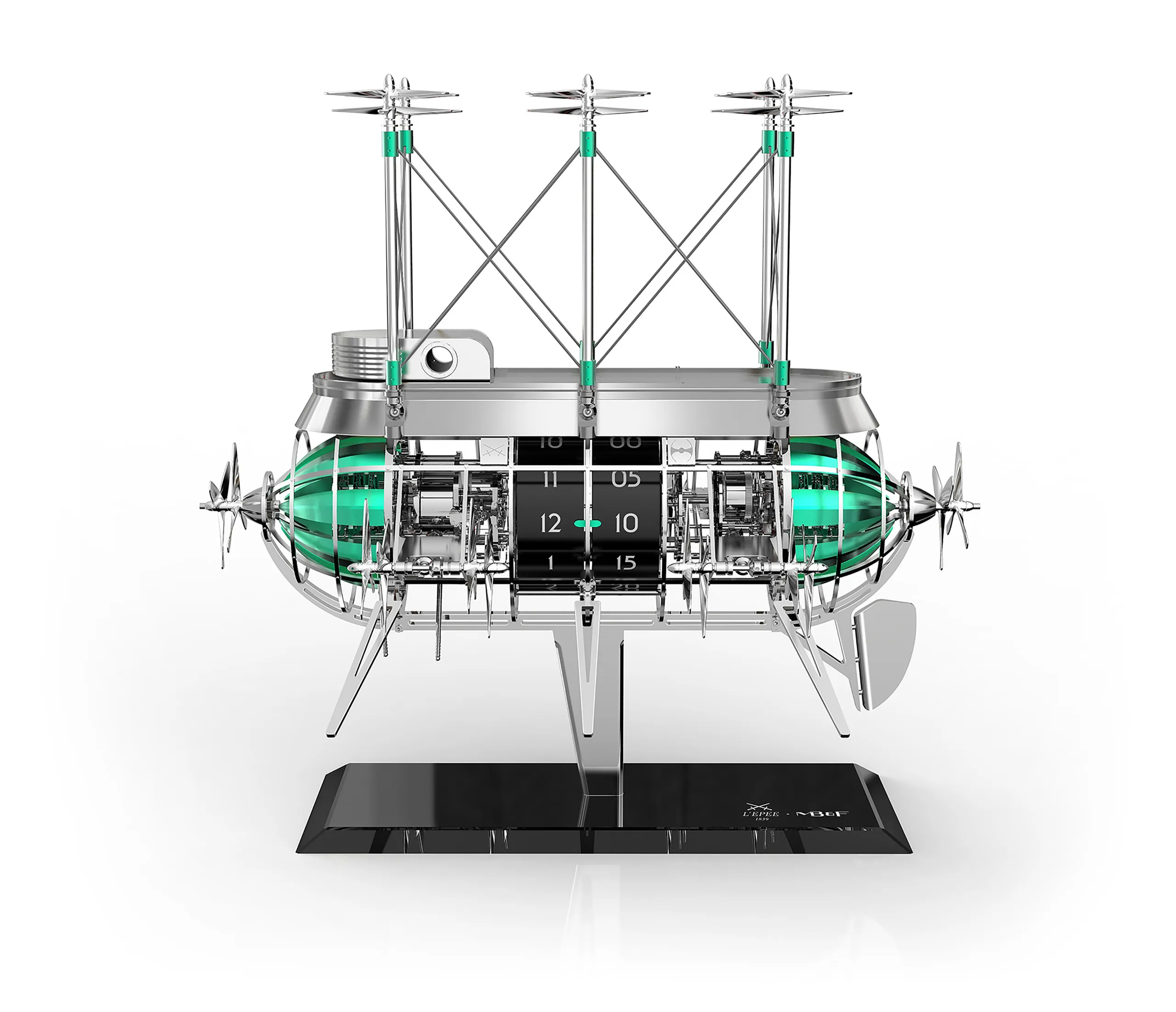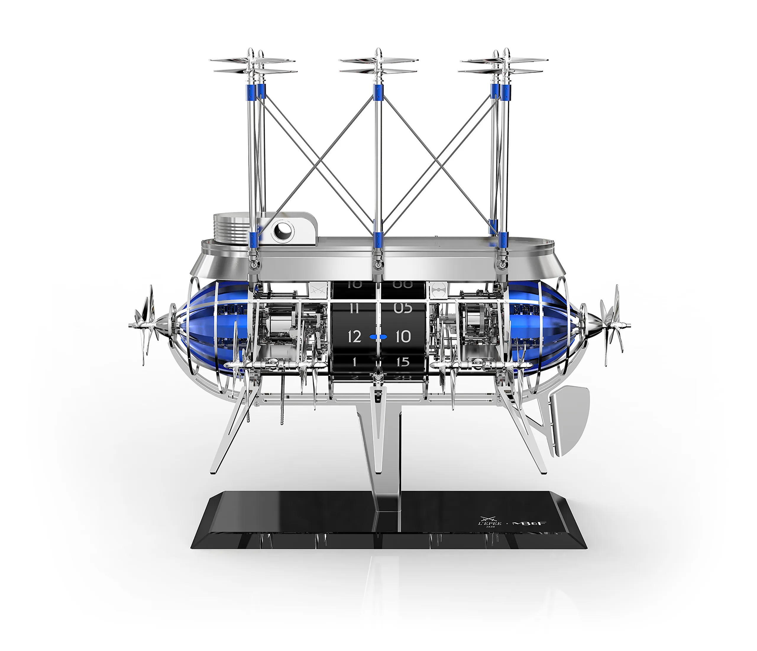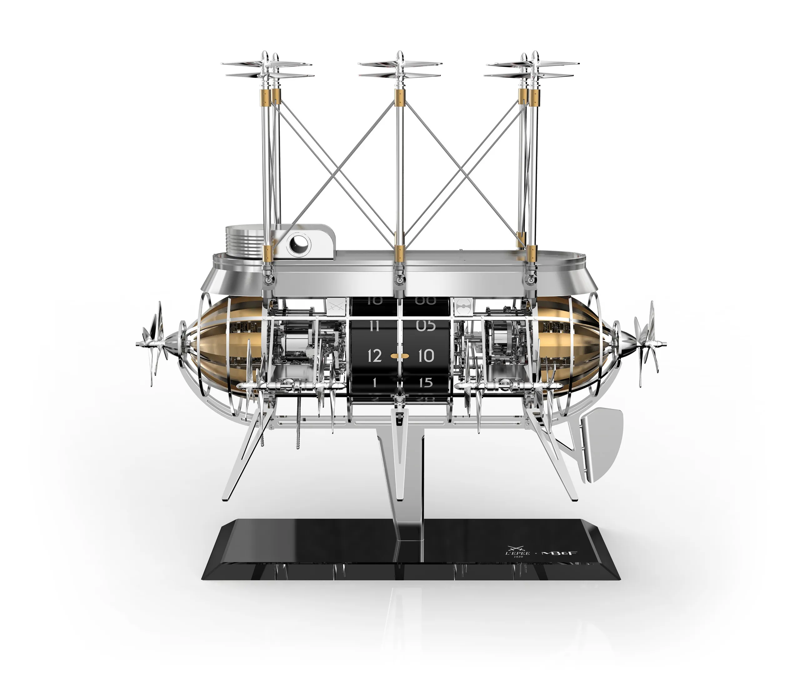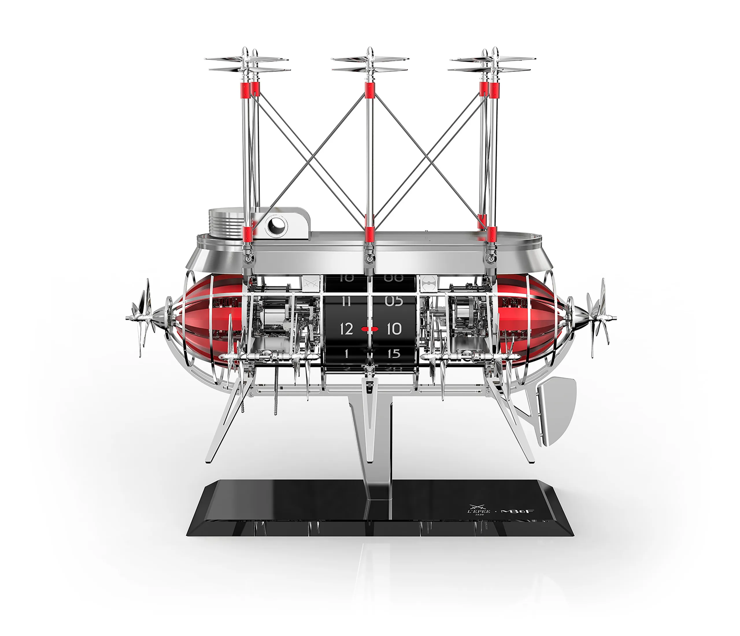 거대한 금속 비행선 내부에는 두 개의 무브먼트가 들어 있으며, 각 무브먼트에는 별도의 와인딩 시스템이 마련돼 있다. 하나의 무브먼트는 더블 배럴을 통해 시간과 차임 기능에 동력을 공급하고, 다른 하나의 무브먼트는 세 번째 배럴을 통해 프로펠러 작동 메커니즘을 구동한다.