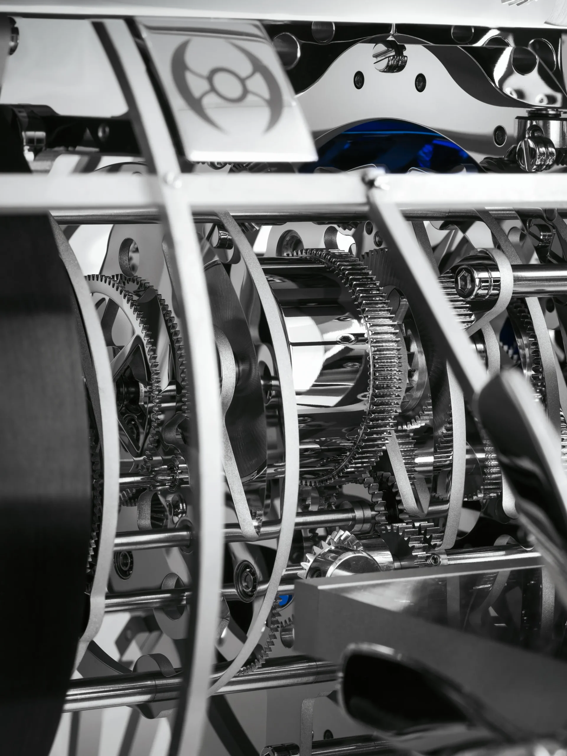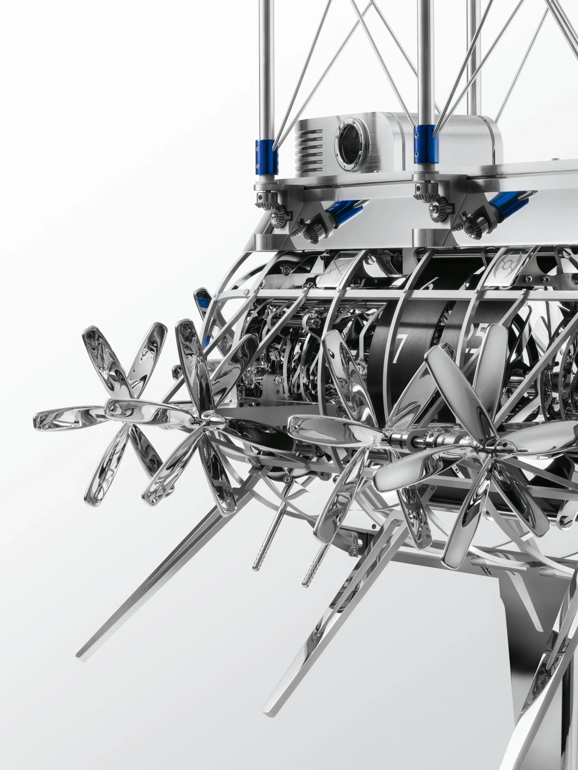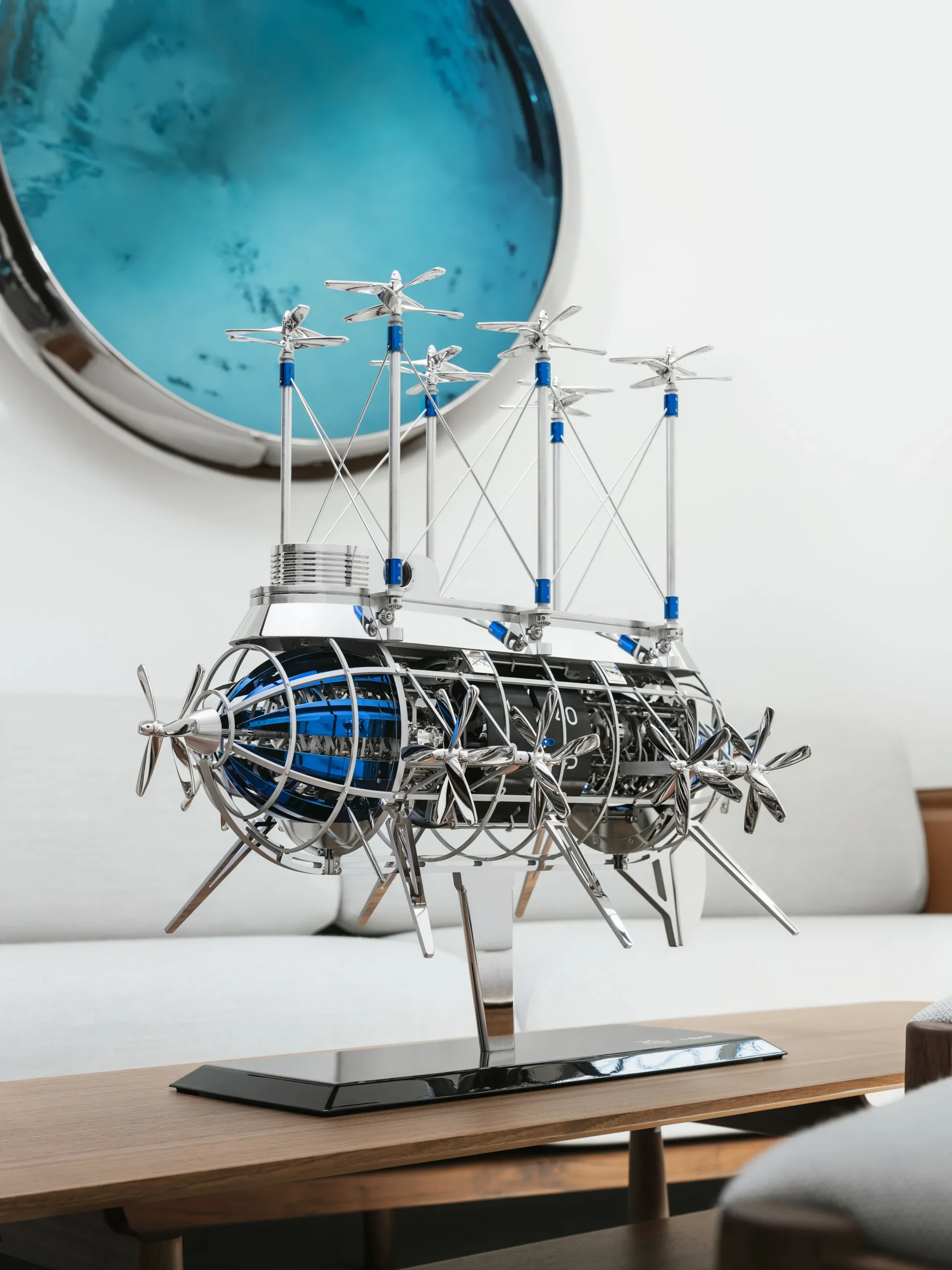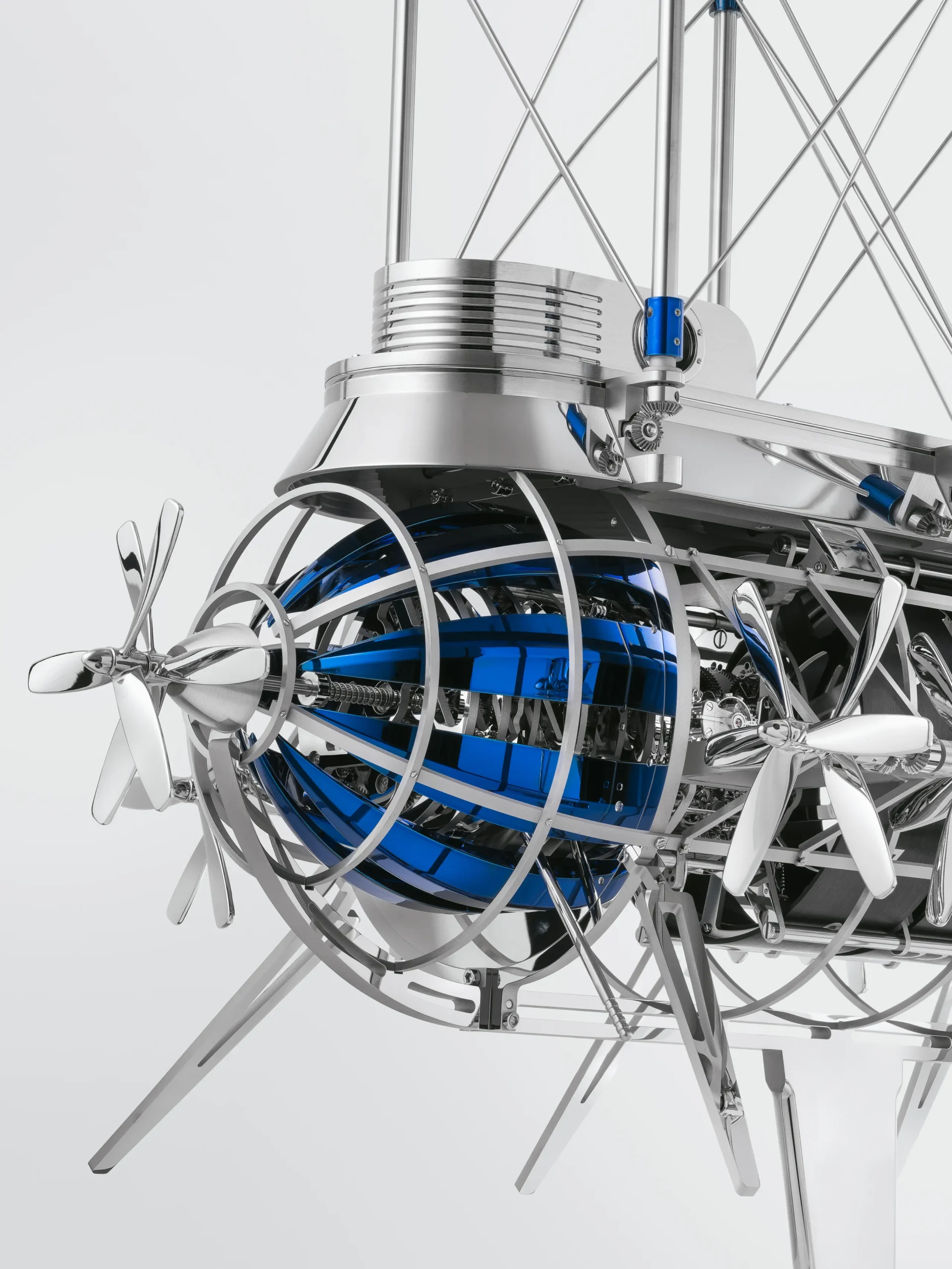 거대한 금속 비행선 내부에는 두 개의 무브먼트가 들어 있으며, 각 무브먼트에는 별도의 와인딩 시스템이 마련돼 있다. 하나의 무브먼트는 더블 배럴을 통해 시간과 차임 기능에 동력을 공급하고, 다른 하나의 무브먼트는 세 번째 배럴을 통해 프로펠러 작동 메커니즘을 구동한다.