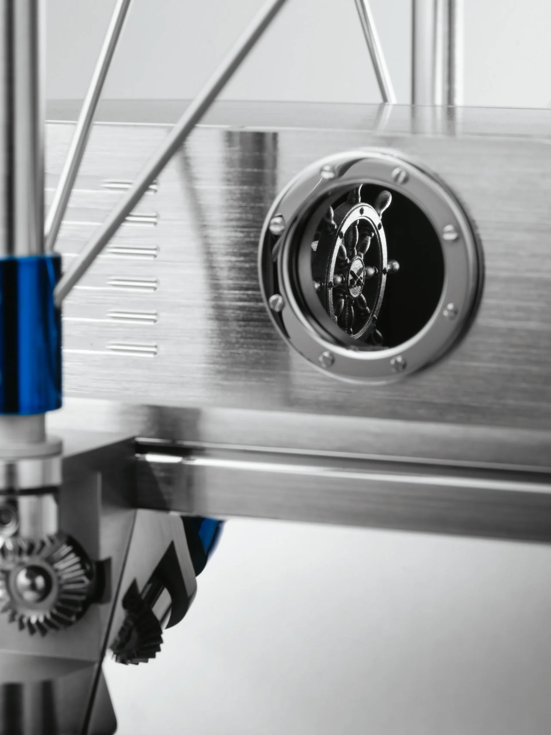 플래그십 모델답게 외형도 남다르다. 무게 17kg, 길이 60cm, 높이 60cm, 너비 35cm로 상당한 볼륨을 자랑한다. 정시마다 차임이 울림과 동시에 32개의 프로펠러가 약 7초 동안 돌아가며 ‘이륙’을 준비한다. 작동 중 프로펠러를 만져도 무브먼트가 손상되지 않도록 안전장치를 적용했고, 비행선 내부의 대시보드와 선체 휠 주변에는 미니어처 조종석도 구현했다. 시간을 확인하면서 곳곳의 디테일을 감상하는 재미가 쏠쏠한 작품이다.