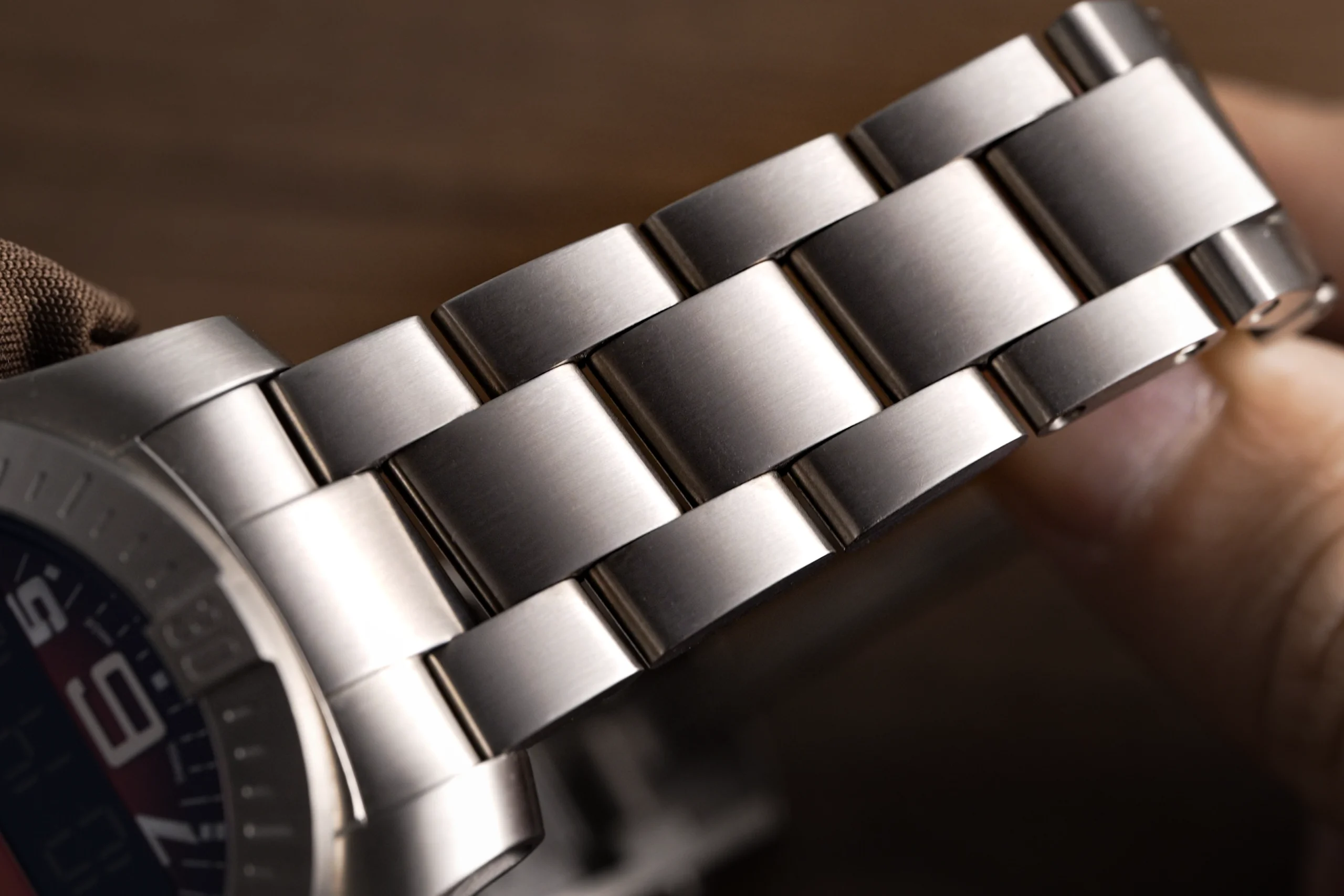 한 가지 덧붙이자면 에어로스페이스 B70 오비터는 내가 소장한 시계 중에서 유일한 쿼츠 시계이자 메탈 브레이슬릿 시계다. 무게 때문에 메탈 브레이슬릿 워치를 선호하지 않지만 이 시계는 티타늄 소재와 쿼츠 무브먼트의 조합으로 착용할 때 부담감이 없다. 특히 브라이틀링의 독특한 3피스 브레이슬릿은 각 파츠를 사선 형태로 디자인하여 손목에 기분 좋게 감긴다. 비대칭의 공격적인 디자인도 멋지다. 디 버클 안쪽의 길이 조절 장치는 완성도가 꽤 높아서 하루 중 손목 변화에 빠르고 편리하게 대응할 수 있다. 러버 스트랩 디 버클 옵션도 제공하며, 안그래도 가벼운 무게가 더 가벼워진다. 시계 분위기도 꽤 달라지기 때문에 여유가 되면 추가하고 싶은 옵션.
