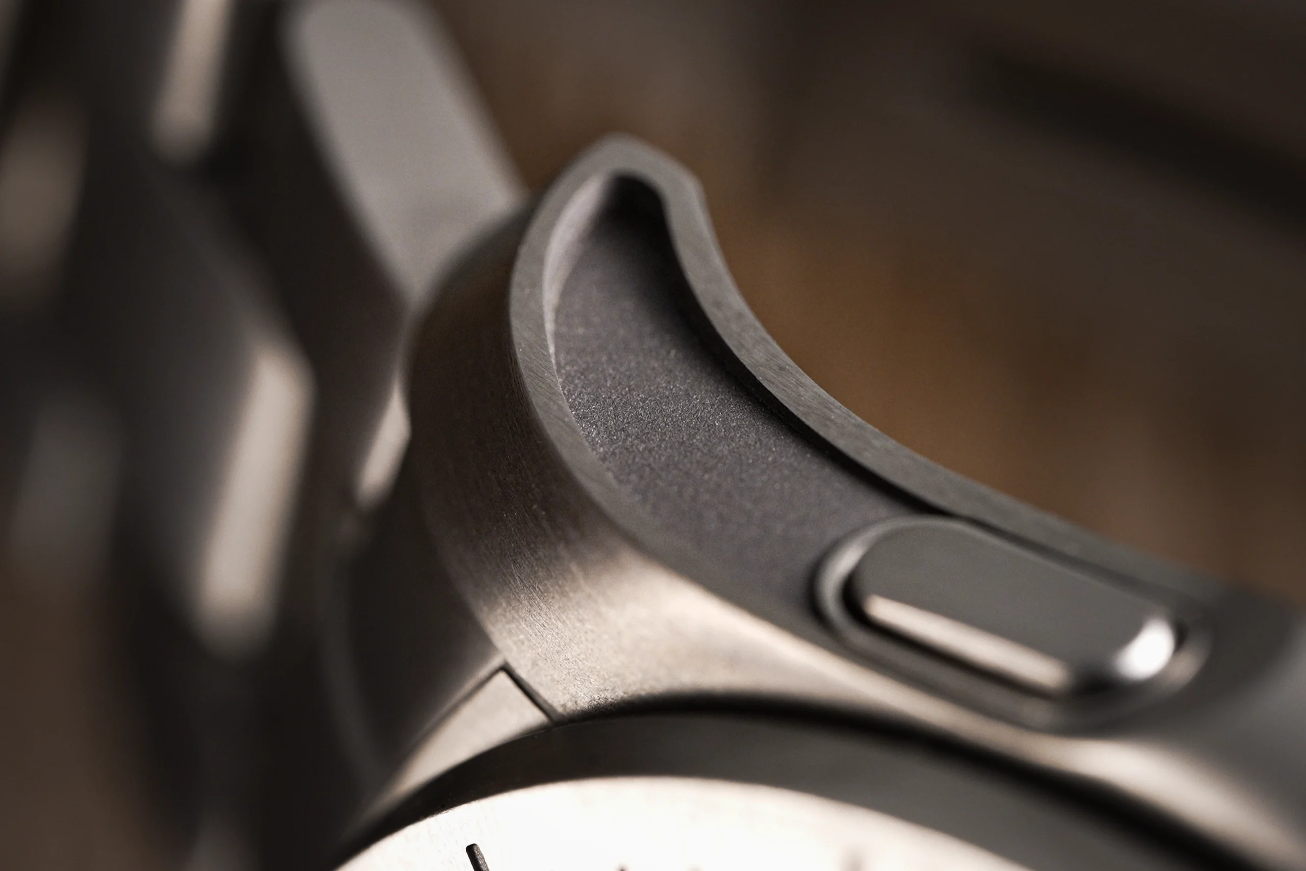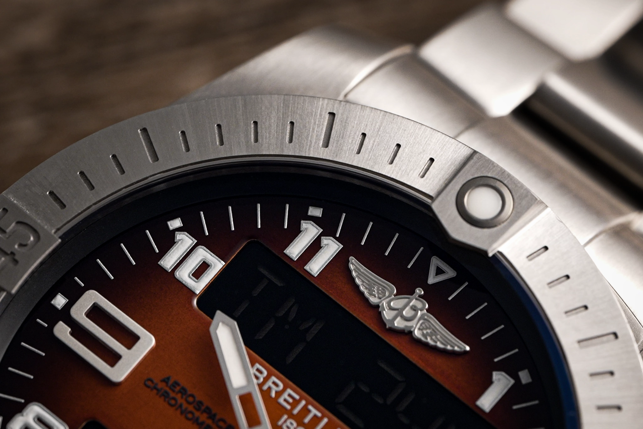 빌드 퀄리티와 케이스 피니싱은 브라이틀링답게 완벽에 가깝다. 모험을 위한 툴 워치 성격에 맞게 전체를 새틴 브러싱 마감했는데, 어지간한 스크래치는 거의 눈에 띄지 않을 것 같다. 티타늄의 독특한 색감과도 잘 어울린다. 케이스 디자인은 전작에 비해 상당 부분 바뀌었다. 특히 좌우 측면에 음각 샌드 블라스트 마감이 추가되면서 형태감이 한층 좋아졌다. 크라운은 푸셔 방식으로 변경되었고, 여기에 2개의 조작 푸셔가 추가되어 마치 크로노그래프 워치 같은 스포티한 분위기도 느낄 수 있다.