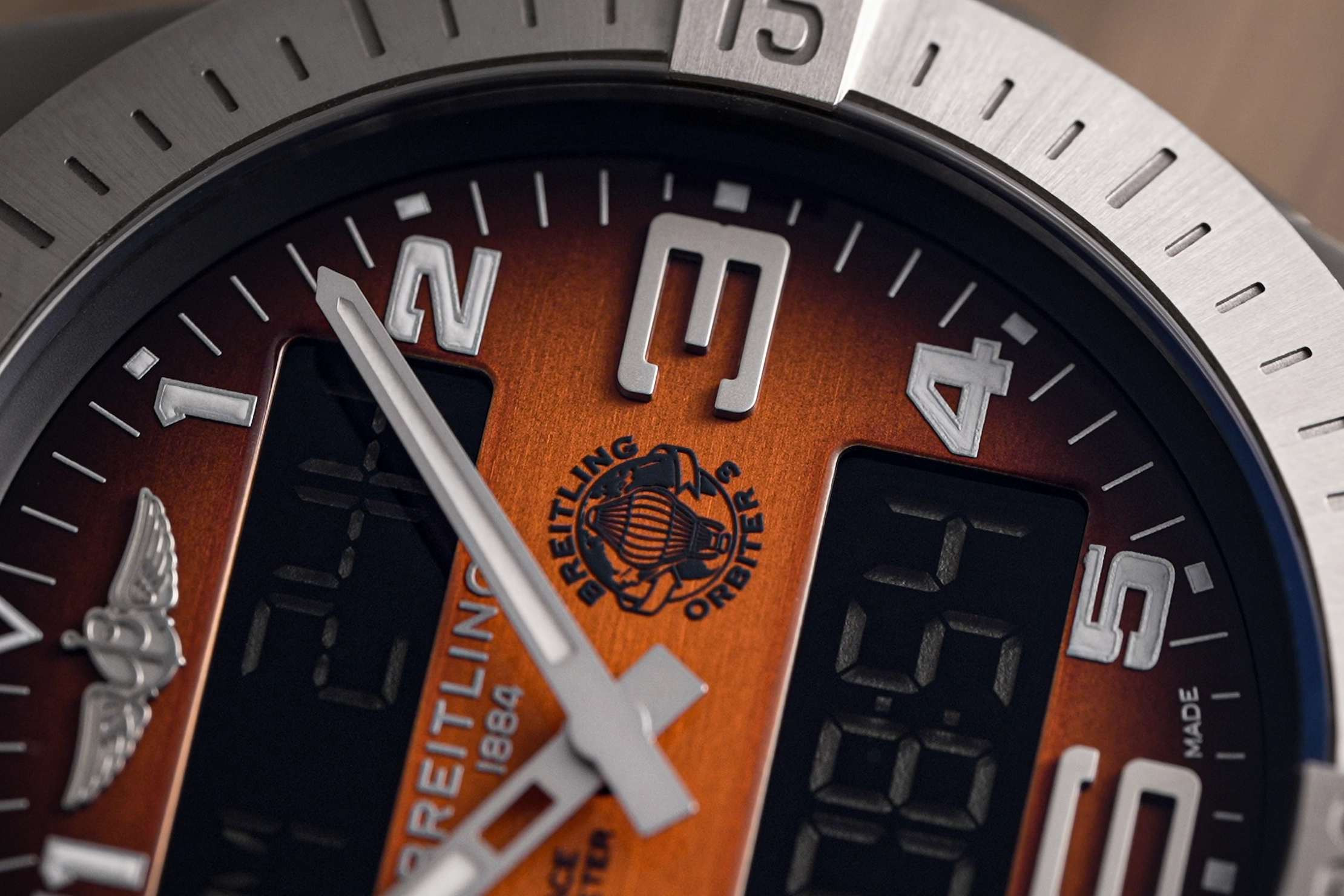 깊은 오렌지 다이얼은 오비터 3의 캡슐 컬러를 반영한 것이다. 다이버 워치에 흔히 사용하는 밝은 컬러가 아니라 어두운 톤이라서 묵직한 느낌이 들며, 티타늄 케이스의 색감과도 잘 어우러진다. 다이얼에는 그러데이션 처리를 해서 바깥쪽으로 갈수록 어두워지고, 표면에서 고급스런 광택도 느낄 수 있다. 어지간한 기계식 시계보다 좋은 질감이다.