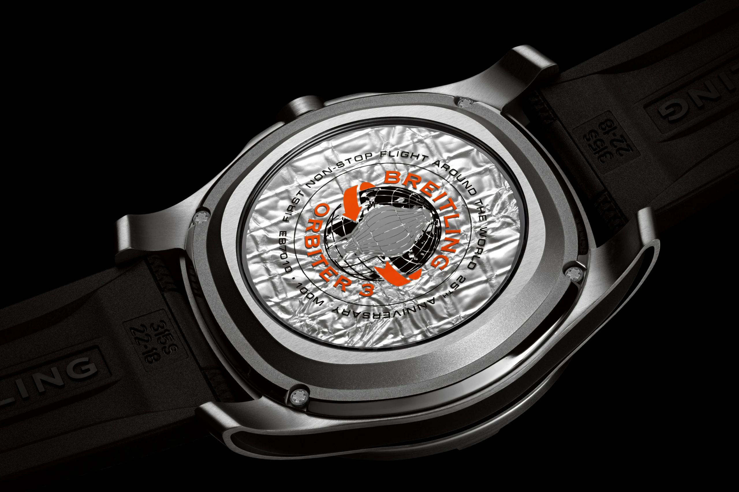 케이스 지름은 43mm로 전작과 동일하지만, 두께는 12.95m로 꽤 증가했다. 사파이어 케이스백 안에 오비터 3의 풍선 조각을 넣다보니 어쩔 수 없이 늘어난 것으로 보인다. 향후 솔리드 케이스백의 일반 모델은 이보다 두께가 줄어들 것으로 예상된다. 사파이어 글라스백에는 오비터 3의 로고를 실루엣 형태로 프린팅했는데, 아래 쪽에 실제 풍선 조각이 겹쳐지면서 꽤 멋진 모양새가 연출된다. 실제 역사의 한 조각을 소장할 수 있는 나만의 박물관 쇼케이스로, 기계식 무브먼트를 볼 수 없다는 아쉬움을 달래주기엔 충분하다.