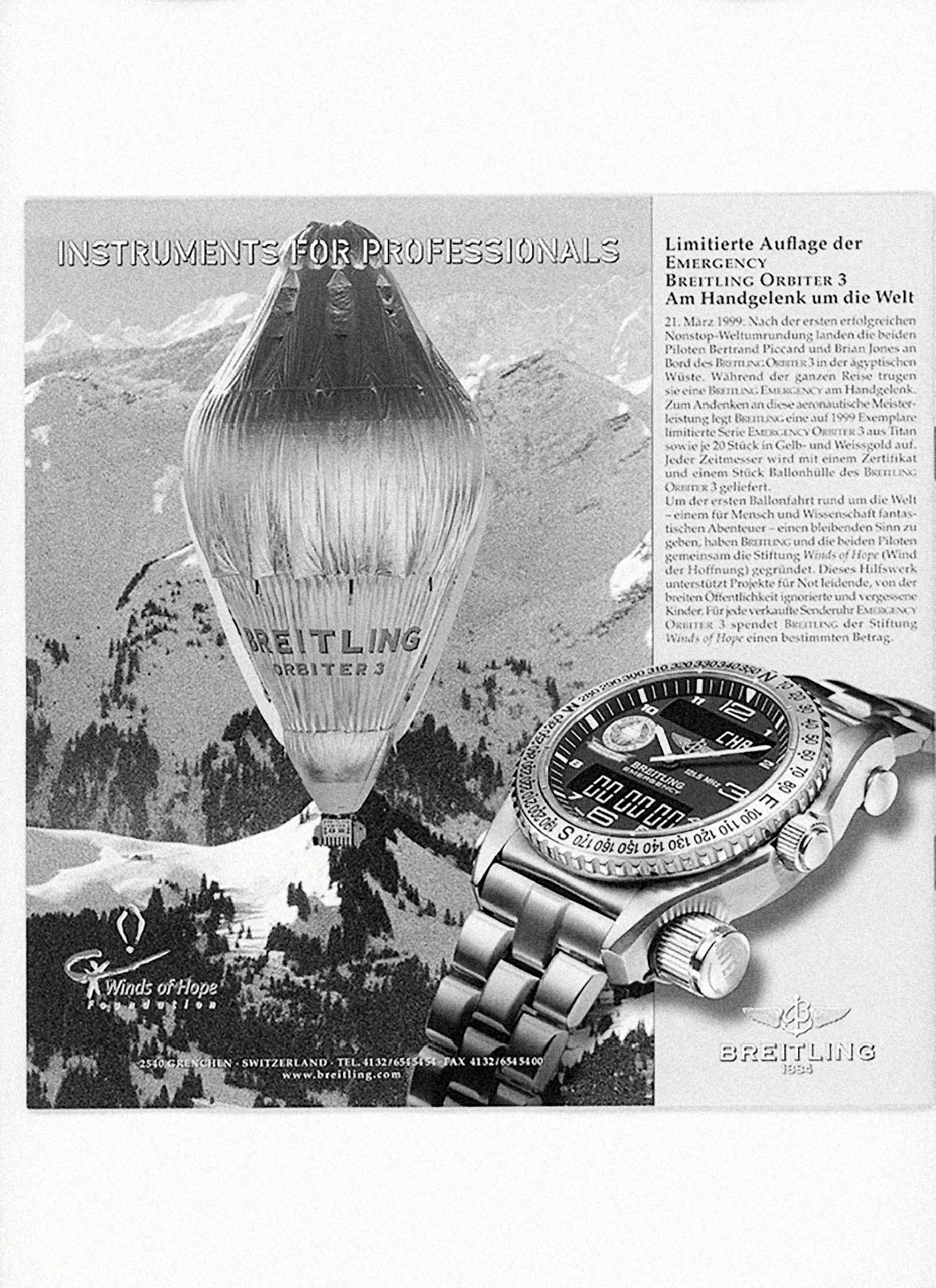 그리고 1999년 3월 1일, 스위스 샤토데(Château-d’Oex)에서 ‘브라이틀링 오비터 3’가 출발했다. 열기구에는 베르트랑 피카르와 브라이언 존스가 탑승했으며, 두 사람의 손목에는 긴급 구조 송신기를 탑재한 브라이틀링 이머전시(Emergency) 워치가 함께했다. 전 세계 언론이 이 대장정을 따라갔고, 마침내 19일 21시간 47분 만에 오비터 3가 이집트 사막에 착륙했다. 총 비행거리는 45,633km. 그렇게 새로운 역사가 쓰여졌다. 당시 브라이틀링은 이를 기념해 오비터 로고가 새겨진 250피스 한정판 이머전시를 제작하기도 했다. 현재 오비터 3 캡슐은 미국 워싱턴 D.C.의 스미스소니언 국립항공우주박물관에 전시되어 있다.