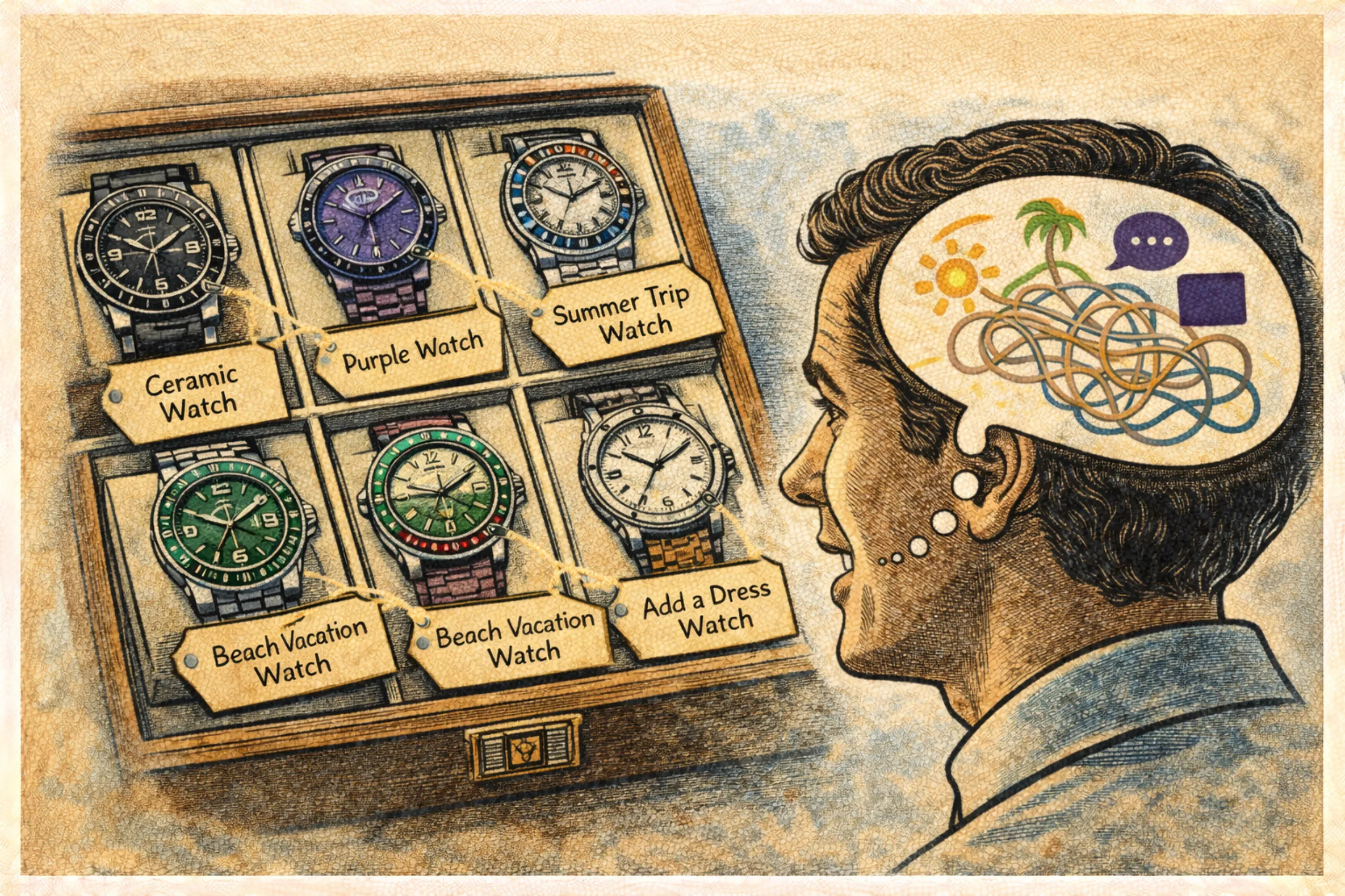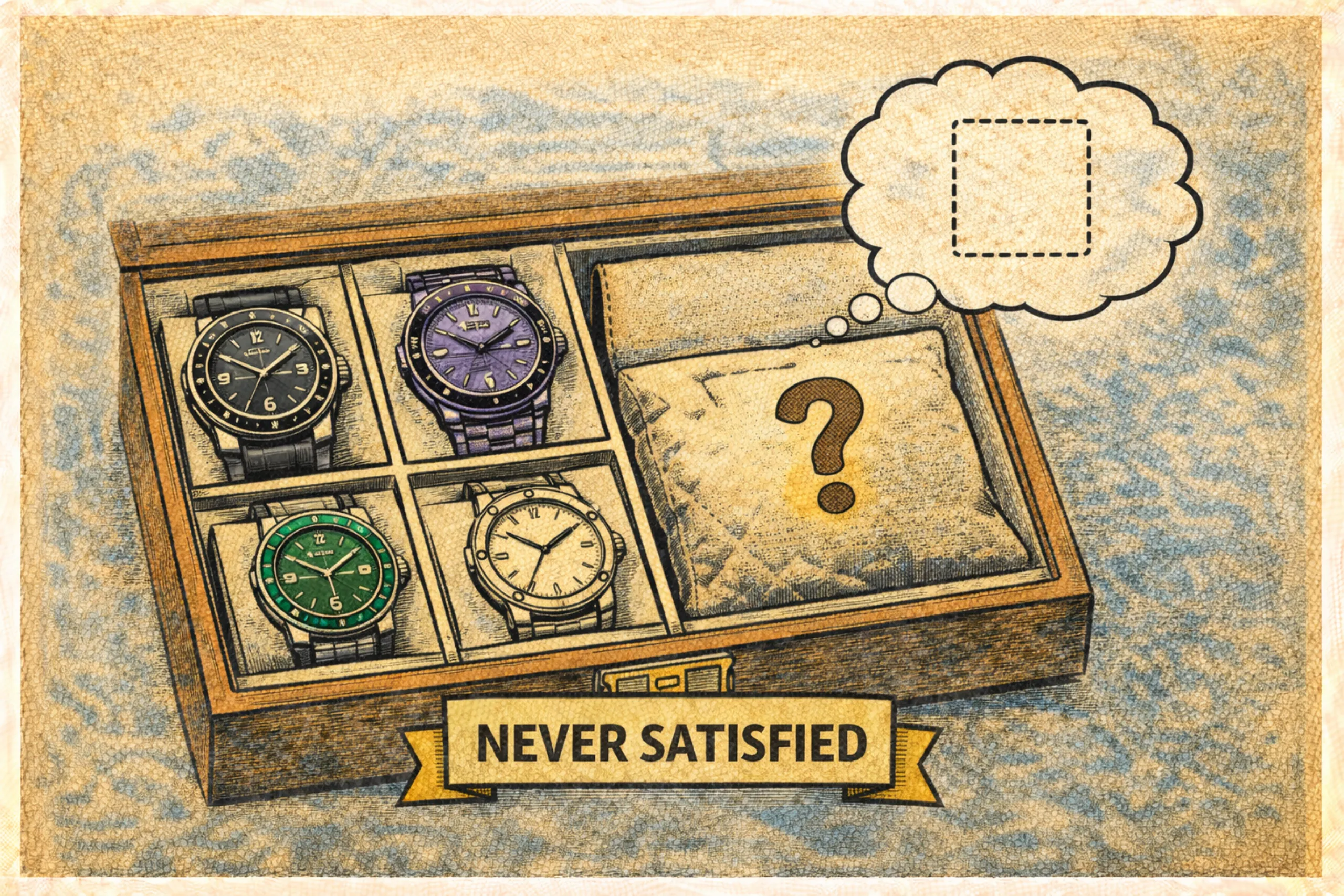 하지만 이렇게 고심 끝에 컬렉션을 완성하더라도 거기에 만족하기란 쉽지 않다. 10구 내외의 보관함으로(심지어 100구라고 할지라도) 이 세상 모든 시계의 요소들을 모두 조합할 수는 없다. 마음의 빈칸은 언제나 있기 마련이고, 심지어 완벽하게 채워졌다고 생각하는 순간(구입하는 바로 그 순간), 새로운 빈칸이 만들어진다. 생존을 위해 우리의 뇌가 원래부터 그렇게 설계되어 있는 까닭이다. 우리는 빈 칸을 보면 채우고 싶고, 채워지는 순간 또 다른 여백을 만들어낸다.