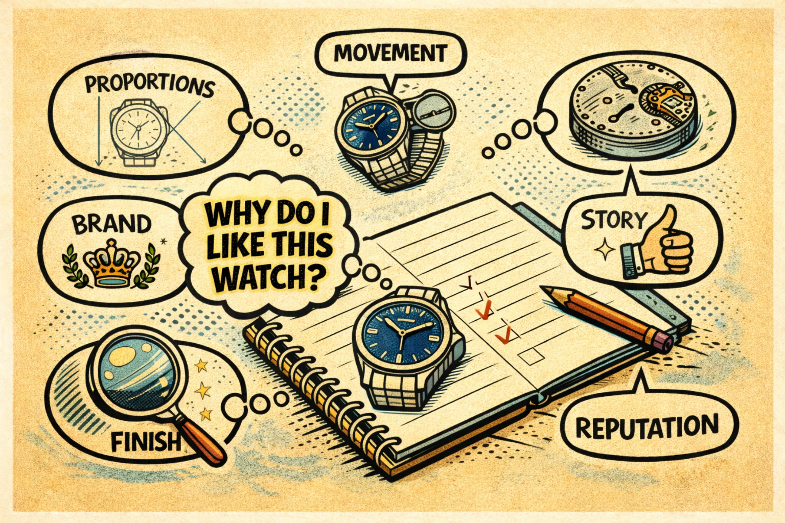 대부분 사람들은 이렇게 말한다. ‘그냥 좋았어!’, ‘느낌이 딱 왔어!’ (물론 이런 직감의 영역이 매우 중요한 순간도 있다. 이에 대해서는 뒤에 다시 언급할 것이다.) 하지만 이건 구매의 출발점일 뿐 도착점이 될 수는 없다. 좋다고 느꼈다면 그것이 왜 좋았는지 한 번 더 살펴봐야 한다. 시계의 비율, 크기, 무게 같은 시계의 형태 때문인가? 무브먼트, 컴플리케이션 같은 기계적인 특성 때문인가? 다이얼의 마감, 컬러 같은 미적인 요소 때문인가? 시계 안에 담긴 특별한 서사 때문인가? 브랜드, 주변의 평판 같은 사회적인 가치 때문인가? 이런 여러 이유들을 글로 정리하면 그 시계를 왜 좋아하는지는 물론, 자신이 어떤 것에 더 호감을 느끼는지 명확하게 이해할 수 있다. 꼭 그 시계를 구입하지 않더라도 이런 기록들은 훗날 잘못된 선택을 할 확률을 크게 줄여준다.