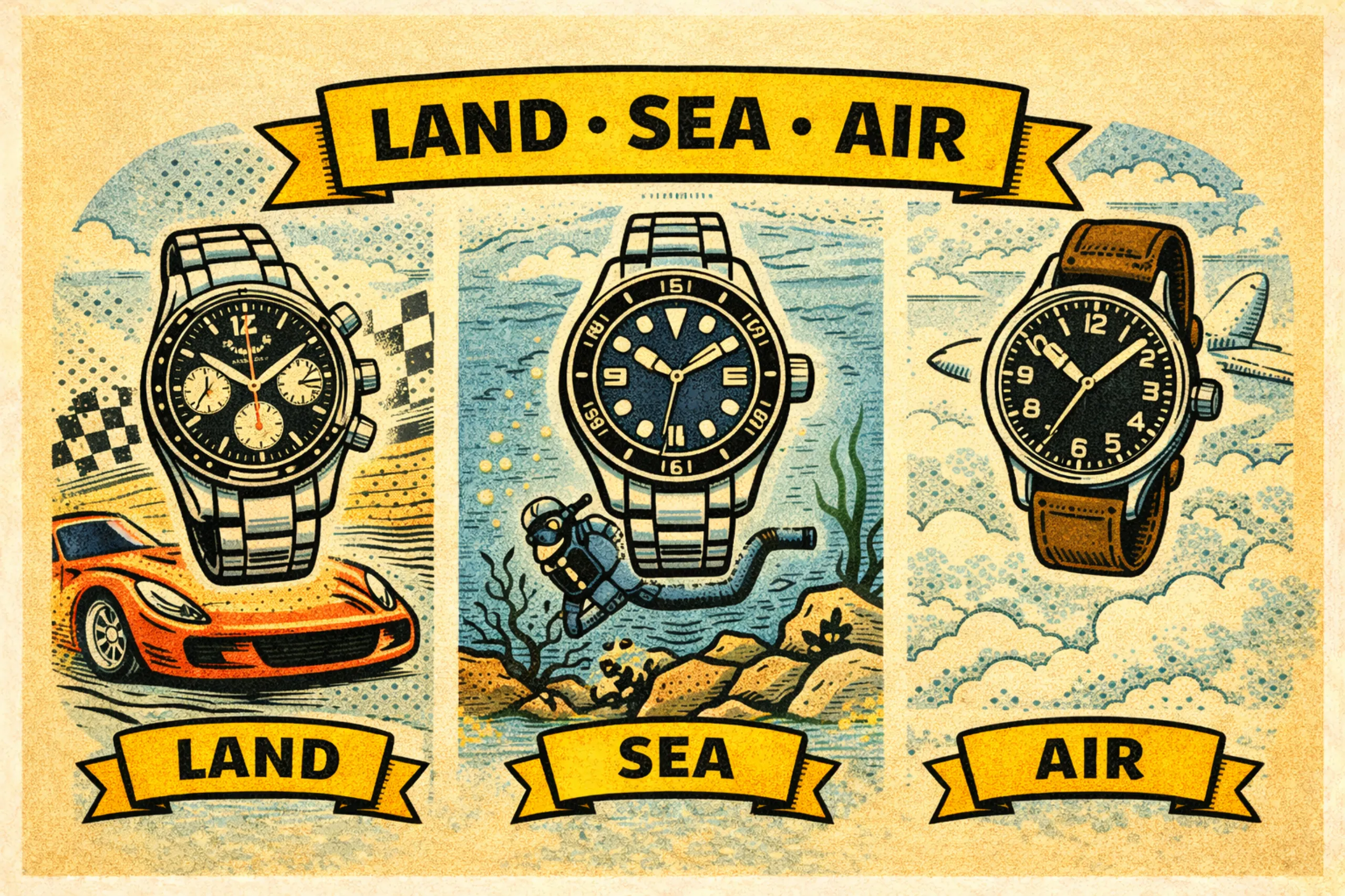 ‘땅’, ‘바다’, ‘하늘’이라는 서사에 집중한 컬렉션으로, 시계 마니아들 사이에서 유행하는 컬렉션 방법 중 하나다. 흔히 다이버 워치(바다), 파일럿 워치(하늘)를 하나씩 선택하고 여기에 땅을 상징하는 레이싱 크로노그래프 워치나 필드 워치를 추가하는 식이다. ‘육해공’이라는 수사에 집중함으로써 컬렉션에 의미부여를 할 수 있으며, 장르 분류를 통해 컬렉션의 다양성도 어느 정도 확보할 수 있다. 다만 이 방법은 ‘육해공’이라는 단일 개념에 의존하기 때문에 자칫 컬렉션이 평범해질 수 있다. 그리고 지나치게 툴 워치 중심의 컬렉션이 될 수밖에 없는 것도 한계점이다. ‘육해공’이라는 개념 자체가 예외를 허용하지 않기 때문에 자기 취향이 아닌 시계를 억지로 끼워넣을 확률도 높다. 가장 대중적이지만 어쩌면 가장 위험할 수 있는 컬렉션 방법.