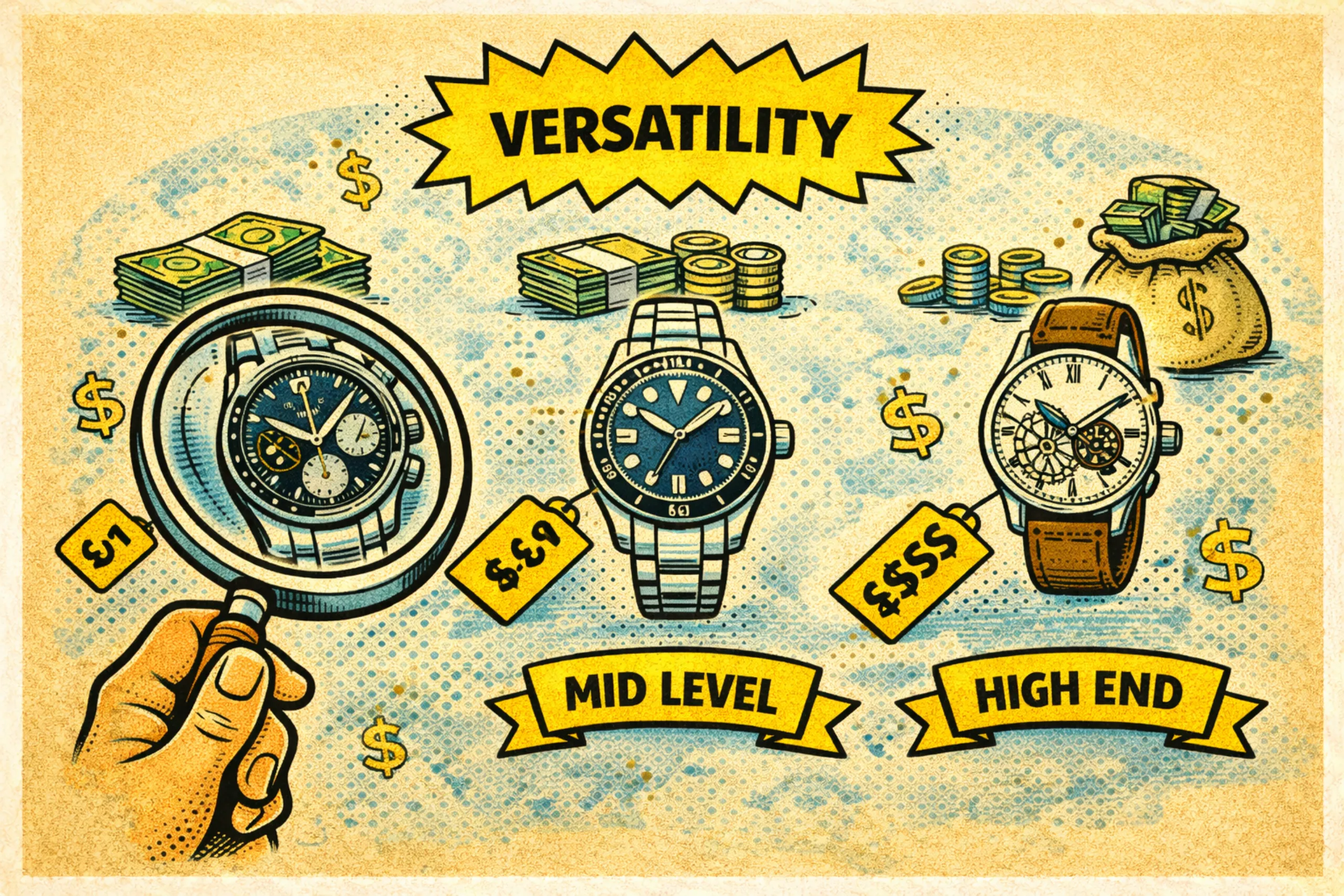 일부 애호가들은 가급적 비슷한 가격대에서 시계를 수집하라고 조언한다. 가격 차이는 일반적으로 품질의 차이로 이어지고, 품질이 떨어지는 시계는 상대적으로 방치될 수 있기 때문이다. 하지만 의도적으로 가격에 차이를 두는 수집 방법도 있다. 이 조합은 서로 다른 가격대의 시계를 하나씩 구성하는 방식으로, 보다 열린 자세로 시계를 컬렉팅하는 방법이다. 각 가격대에서 제조사들이 제한된 자원으로 어떻게 최고의 결과물을 만들어내는지 살펴보고, 그에 따라 의사결정을 하는 것이다. 이렇게 컬렉팅을 하면 가격과 무관하게 좋은 시계를 구분하는 안목을 자연스럽게 기를 수 있다. 또한 예산이 한정된 상황에서 하나 정도는 고가 시계에 투입함으로써 전반적인 구매 만족도를 높일 수도 있다. 하지만 고가 시계만 집중적으로 착용하게 될 위험 역시 늘 도사리고 있다. 시계의 절대적 품질 차이가 발생하기 때문에 각 시계의 미학적인 일관성도 다소 떨어질 수 있다. 예산이 제한적인 사람들은 고가 시계에 아예 접근조차 할 수 없다는 것도 문제다.