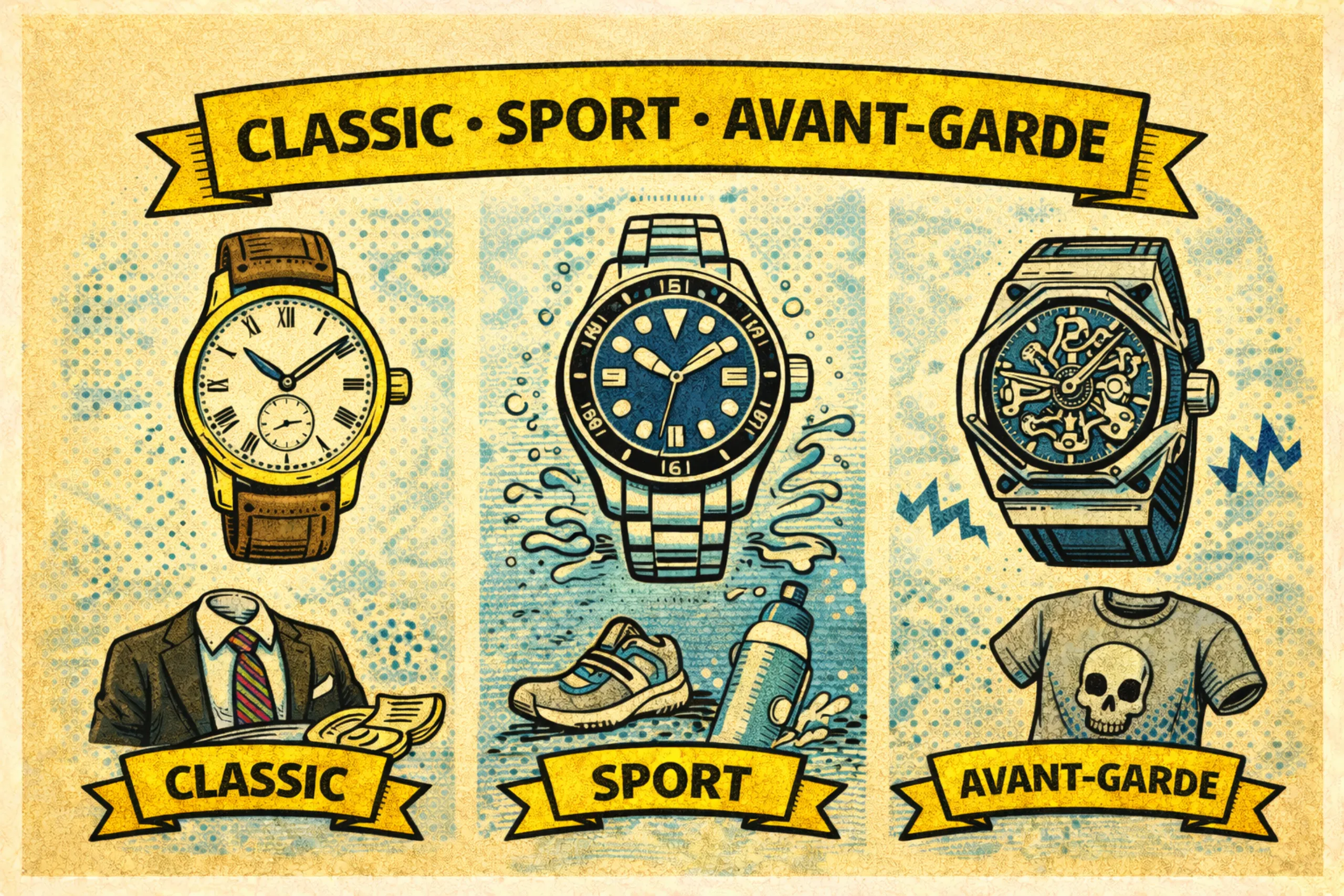 클로카 칼럼에서 2025년 기자들의 최애 시계를 선정할 때 구분했던 방법이다. ‘육해공’으로 한정 짓지 않고 시계의 범위를 넓혀서 보다 다양한 상황에 대응할 수 있는 구성이다. 일체형 브레이슬릿 스포츠 워치나 다이버 워치로 기본 일상적인 상황을 두루 커버하고, 여기에 클래식한 드레스 워치를 더해 포멀한 정장은 물론 캐주얼 정장까지 소화한다. 그리고 아방가르드한 디자인을 추가하면서 극단적인 캐주얼 상황까지 대응할 수 있다. 이론적으로 가장 균형잡힌 구성이며, 여러 시계 유형을 골고루 경험할 수 있는 조합이기도 하다. 다만 현실적으로 실제 착용 빈도는 스포츠 워치에 과도하게 쏠릴 가능성이 높다. 드레스 워치와 아방가르드 워치는 이론상 이상적이지만 실제로는 여러 제약으로 인해 잘 안차게 될 수도 있다. 아방가르드 시계는 선택의 폭이 좁고, 대체로 가격이 높게 형성되어 있기 때문에 이 조합을 원한다면 독립시계 쪽으로 눈을 돌려보는 것도 좋다.