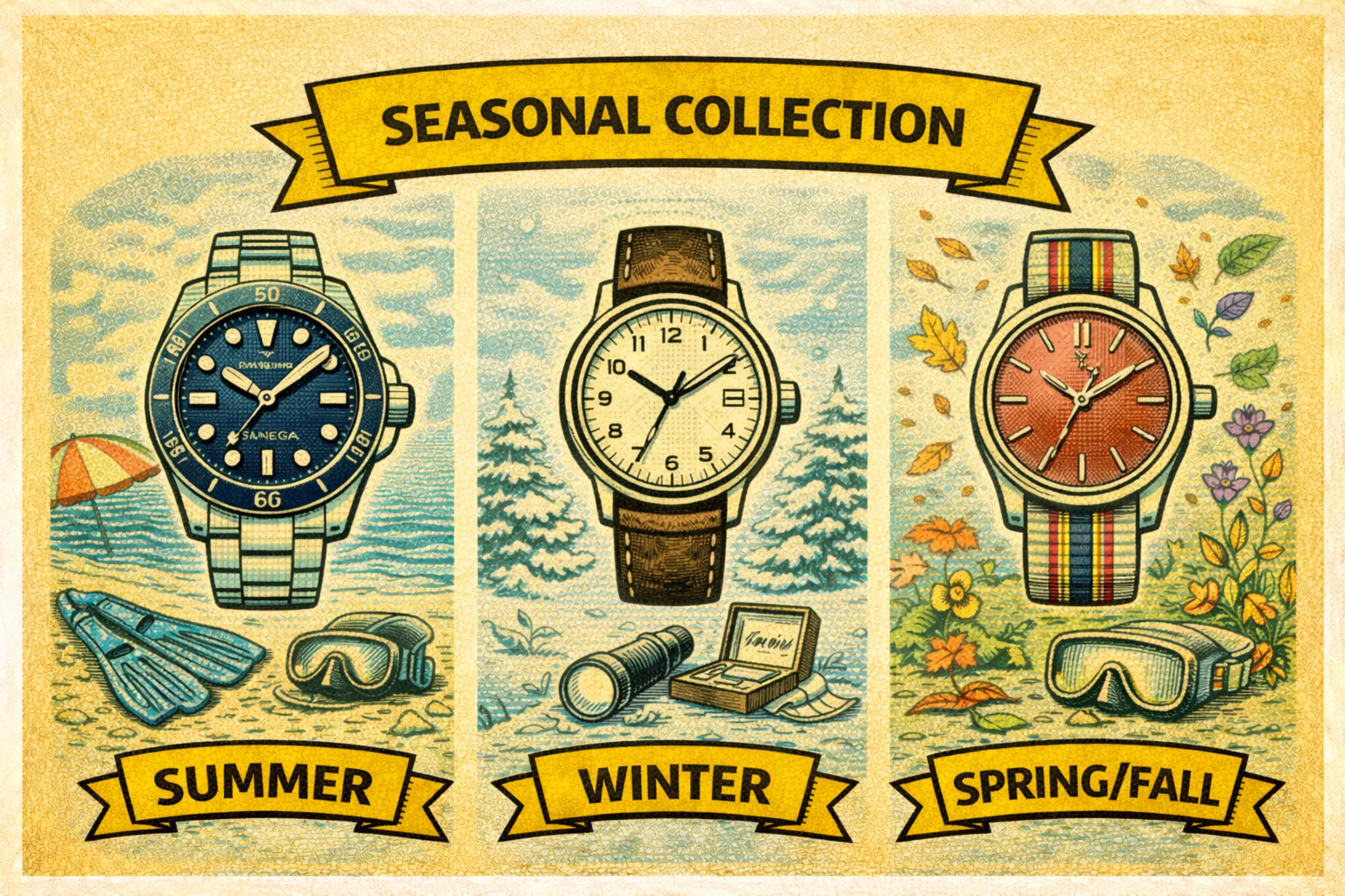 기능이나 외관이 아니라 계절에 따른 사용 환경에 맞춰 컬렉션을 구성하는 방법이다. 예를 들어 여름에 주로 사용할 강력한 방수 성능의 다이버 워치, 겨울철 소매 안에서도 불편하지 않는 슬림한 필드 워치, 그리고 봄과 가을 시즌에 의상에 맞춰 포인트를 활용할 수 있는 컬러풀한 시계를 갖추는 것이다. 계절에 맞춰서 구분하면 해당 기간 동안 만족도를 크게 높일 수 있고, 예산도 그에 맞게 배분할 수 있다. 예를 들어 겨울철에는 시계를 바깥에 드러낼 일이 많지 않기 때문에 슬림한 쿼츠 워치를 고르고, 전체 패션에서 시계가 차지하는 비중이 높은 여름철 시계에 보다 높은 비용을 쓰는 것. 다만 현실적으로 특정 시즌에 하나의 시계만 계속 착용한다는 건 생각보다 어려운 일이다. 이 조합을 의미 있게 구현하려면 봄/가을 시즌 시계를 4계절 모두 활용할 수 있는 전천후 시계로 골라야 할 것 같다.