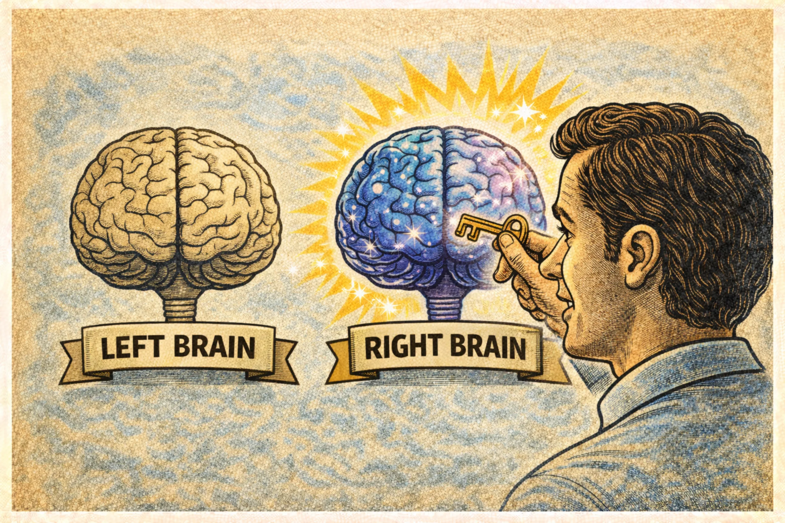 그렇다면 좌뇌가 주도하는 편향적 컬렉팅에서 벗어나려면 어떻게 해야 할까? 이미 당신은 그 해결책을 좌뇌 바로 옆에 갖추고 있다. 바로 우뇌를 깨워서 활성화시키는 것이다. 안타깝게도 일상에서 우리는 우뇌에 직접 접근할 수 없다. 분명 존재하고 있고 기능하고 있지만 의식하거나 말을 할 수 없다. 언어를 갖지 못한 우뇌는 주로 무의식의 차원에서 활동한다. 우리가 아무 생각 없이 저절로 하는 것들, 두 발로 걷거나 멀리 떨어진 물건을 잡는 활동들은 사실 우뇌의 복잡한 처리 프로세스를 거쳐 ‘단번에’ 수행하는 것들이다. 또한 우뇌가 하는 역할은 주로 직관의 영역이다. 공간을 지각하고, 전체를 단번에 파악한다. 감정이나 느낌 역시 우뇌가 담당한다. 우리가 흔히 ‘직감’이라고 부르는 것, 무언가를 알아냈지만 그걸 말로 설명할 수 없는 것 또한 우뇌의 활동 결과다. 물론 좌뇌가 의식과 언어를 장악하고 있는 상황에서 우뇌는 존재를 드러내지 않는다. 하지만 앞서 분리뇌 환자의 사례에서 봤듯이 우뇌는 아무런 선입견 없이 대상을 관찰하고 있으며, 그것은 좌뇌의 스토리텔링이 제거된, 당신이 진짜 원하는 것일 확률이 높다.