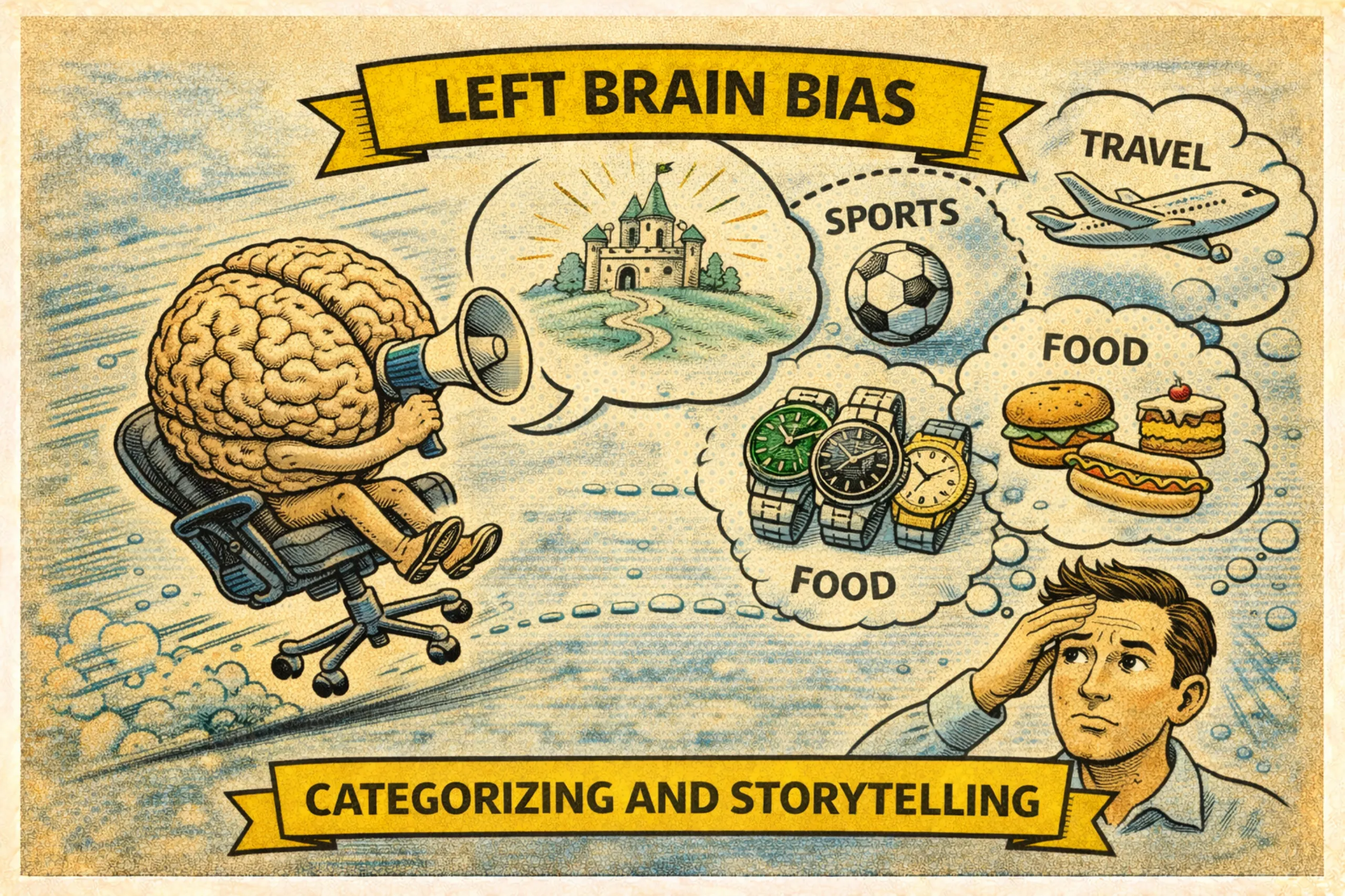 그밖에도 책에서는 우리의 좌뇌가 어떻게 그럴싸한 이야기를 만들어내고, 상황을 자의적으로 해석하는지, 그리고 이미 일어난 일을 정당화하는지 다양한 사례를 보여준다. 우리가 좌뇌를 갖고 살아가는 한, 세상을 그 자체로 있는 그대로 파악할 수 없다는 얘기다. 우리는 언제나 세상이나 현상을 해석하고, 분류하고, 구조화한다. 좌뇌가 담당하는 ‘언어’라는 것이 바로 그런 활동의 대표적인 사례이며, 우리가 ‘자아’라고 찰떡같이 믿는 것 역시 어쩌면 좌뇌가 만들어낸 신기루일 수 있는 것이다.