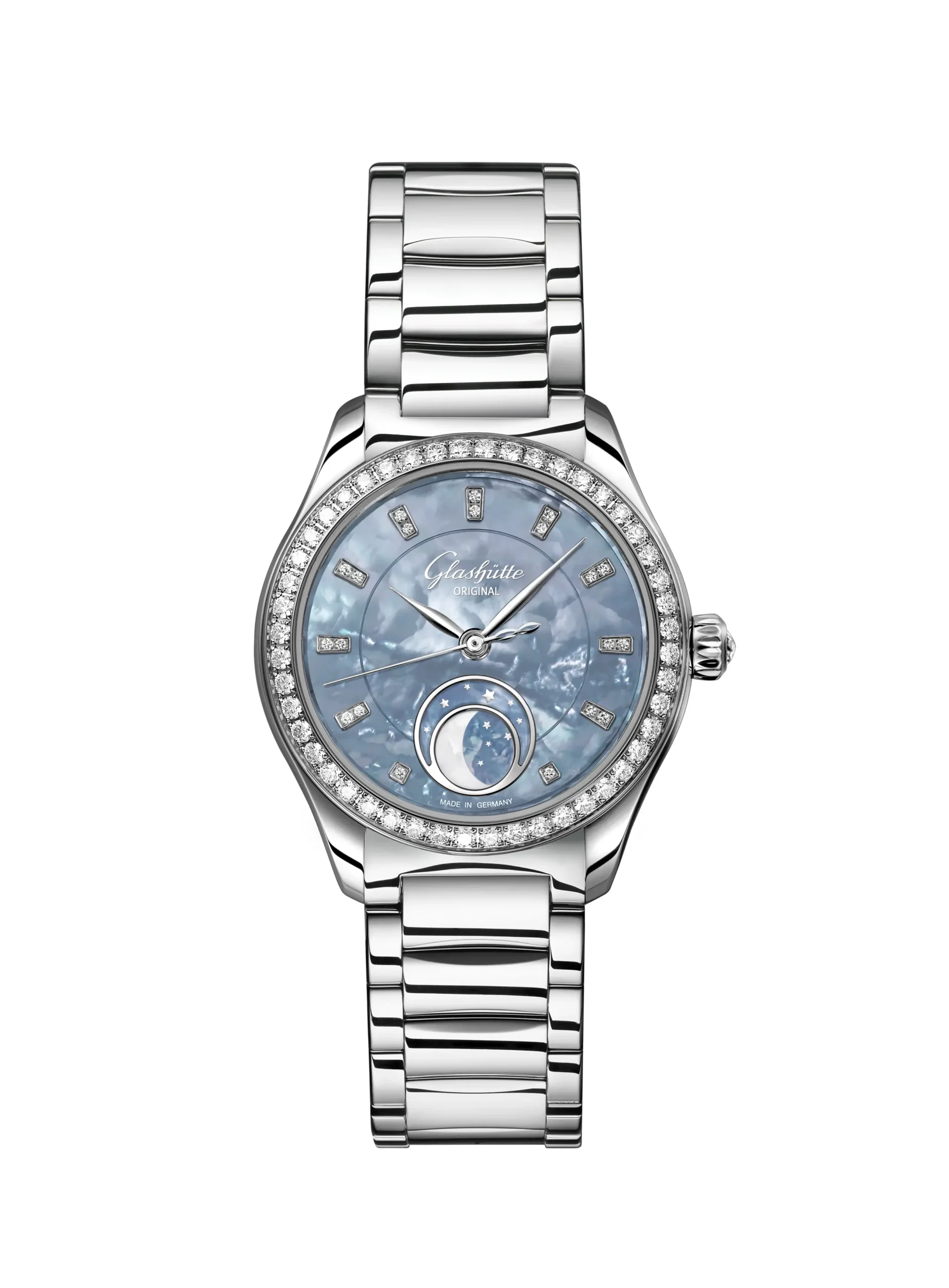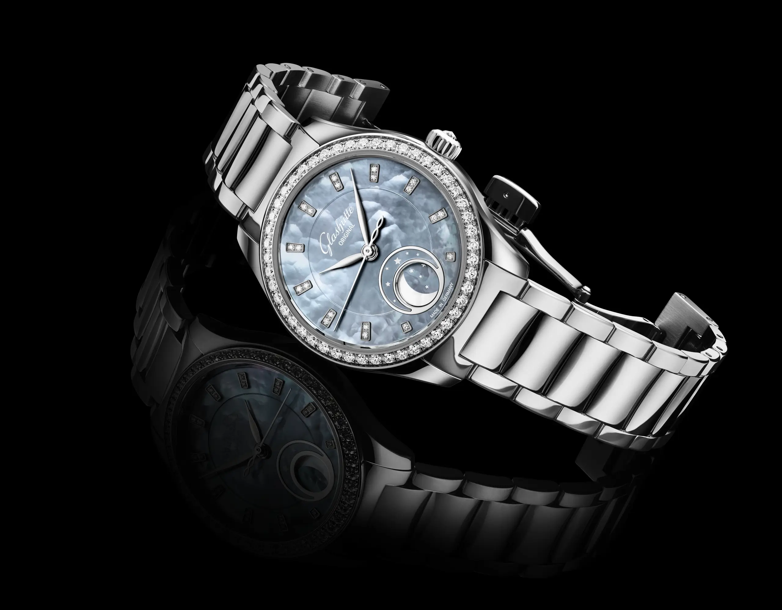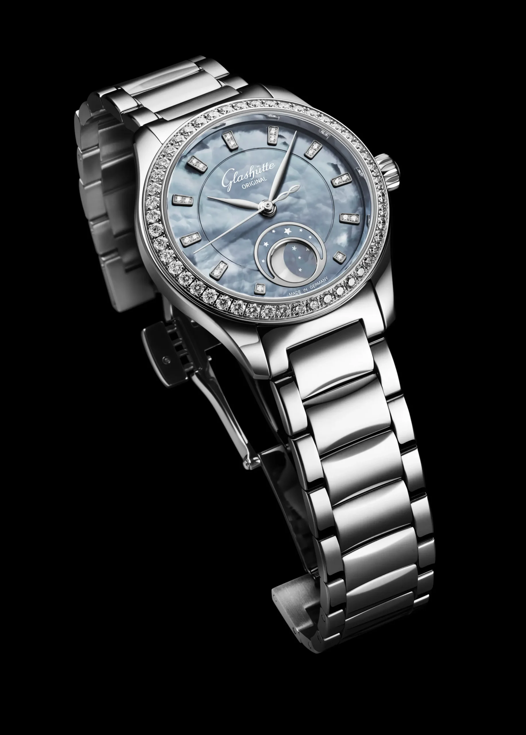 ‘세레나데 루나’는 글라슈테 오리지널이 2024년 선보인 여성용 컬렉션으로 이름에서부터 로맨틱하면서도 시적인 분위기가 느껴지는 문페이즈 워치다. 이번에 선보인 신작은 전작들과 마찬가지로 지름 32.5mm, 두께 8.9mm의 스테인리스 스틸 케이스로 제작했다. 베젤에는 48개의 브릴리언트 컷 다이아몬드를 촘촘히 세팅했으며, 인덱스와 크라운에도 다이아몬드 장식을 더해 눈부신 반짝임을 연출했다.