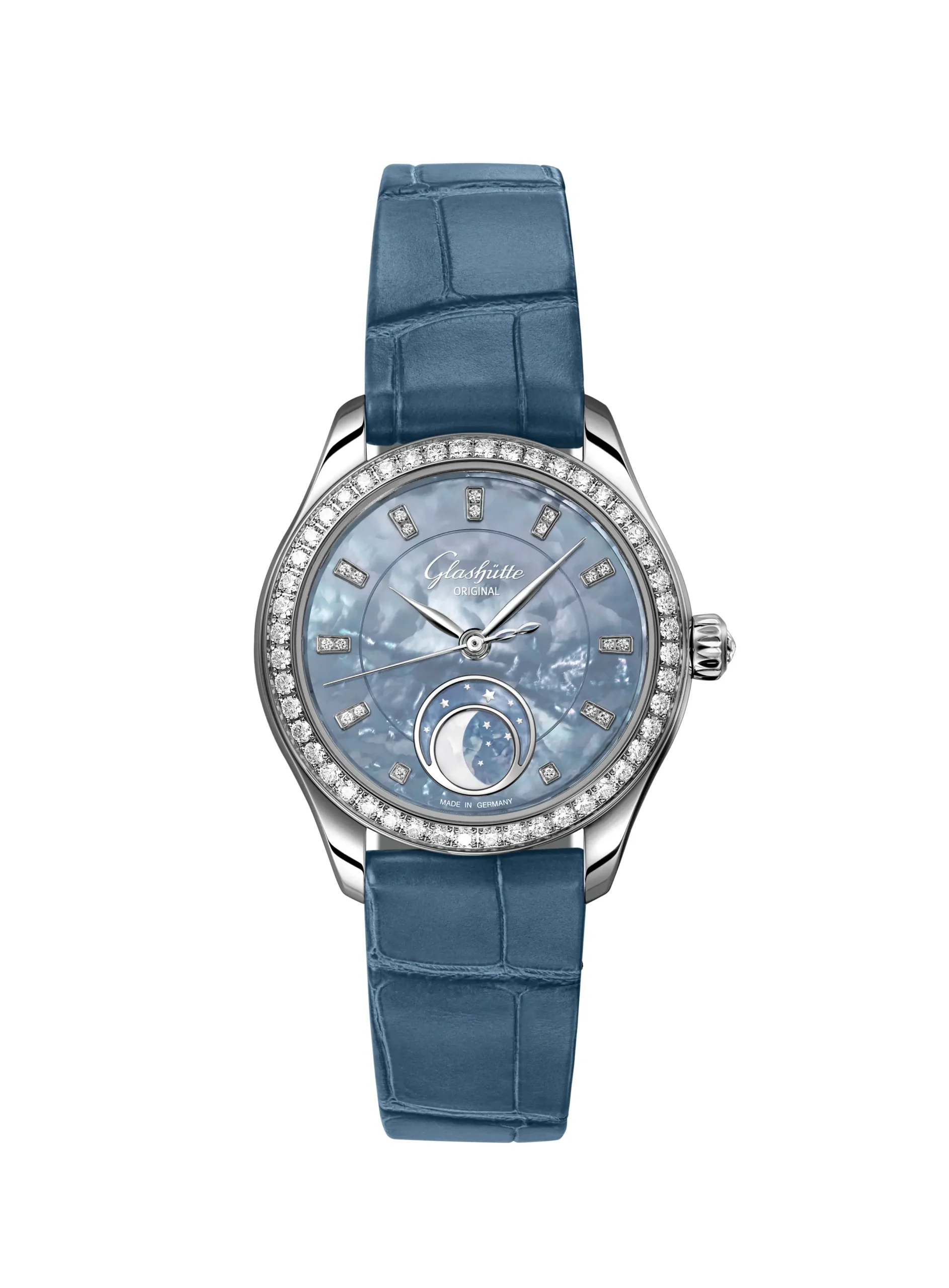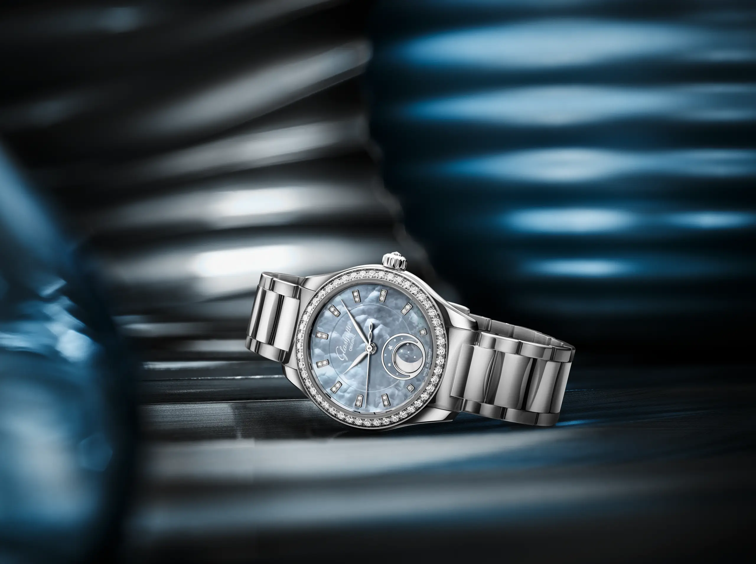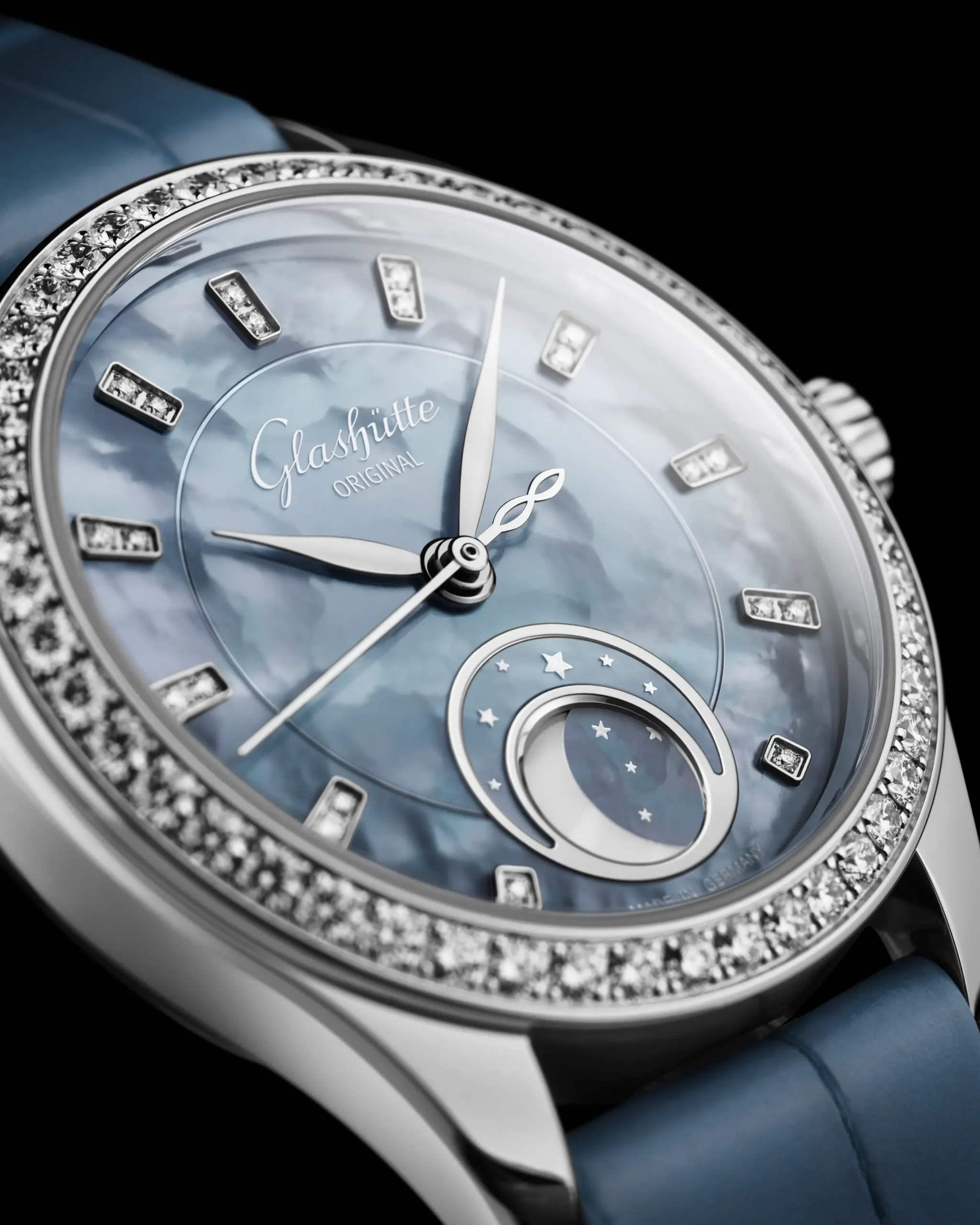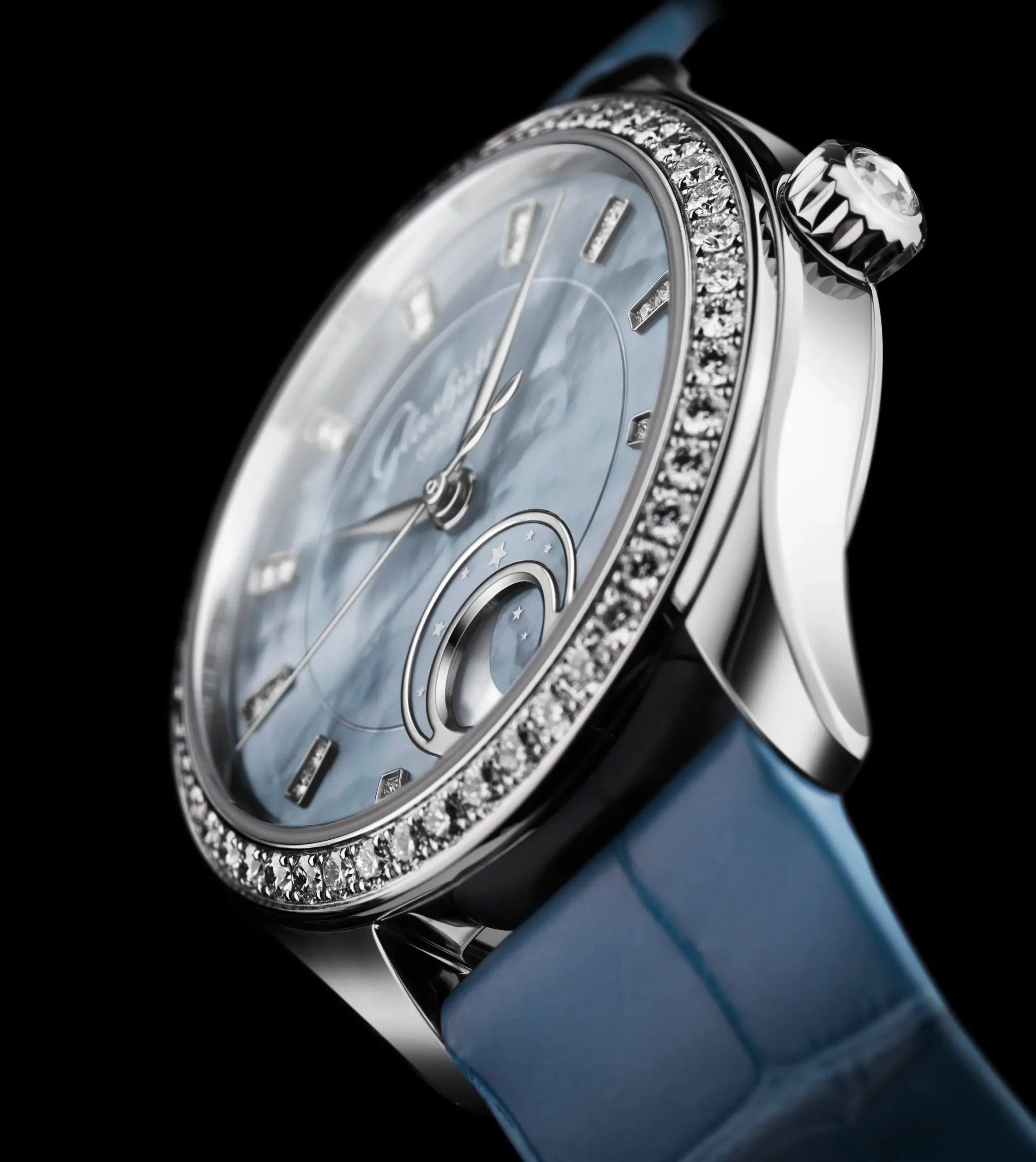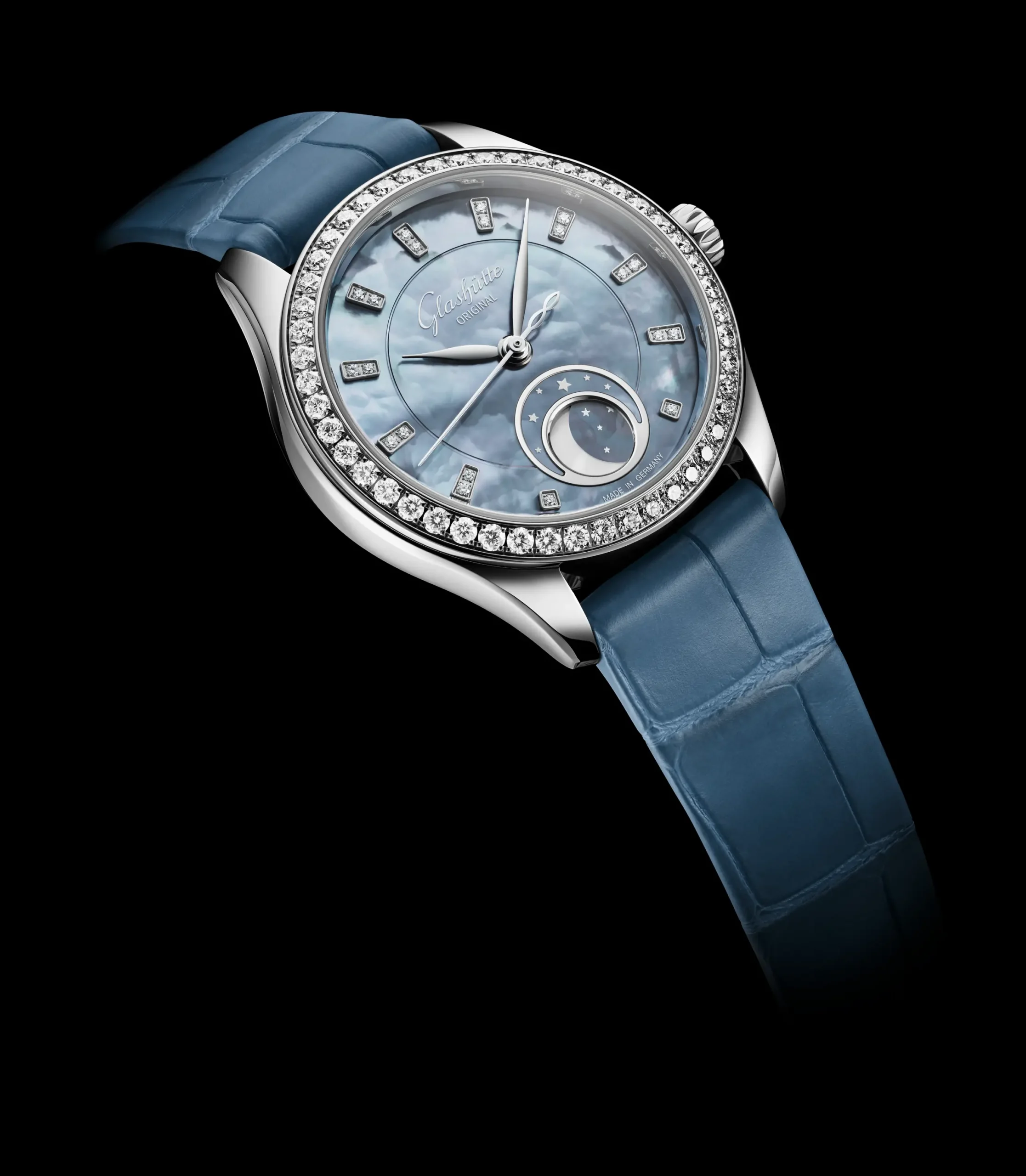 글라슈테 오리지널(Glashütte Original)의 여성용 문페이즈 모델 ‘세레나데 루나(Serenade Luna)’가 화창한 하늘을 떠올리게 하는 ‘스카이라인 블루(Skyline Blue)’ 컬러의 자개 다이얼 버전으로 등장했다. 자개 다이얼 특성상 빛에 따라 색조가 달라지며 은은한 실버부터 화사한 블루까지 다양한 분위기를 즐길 수 있다.