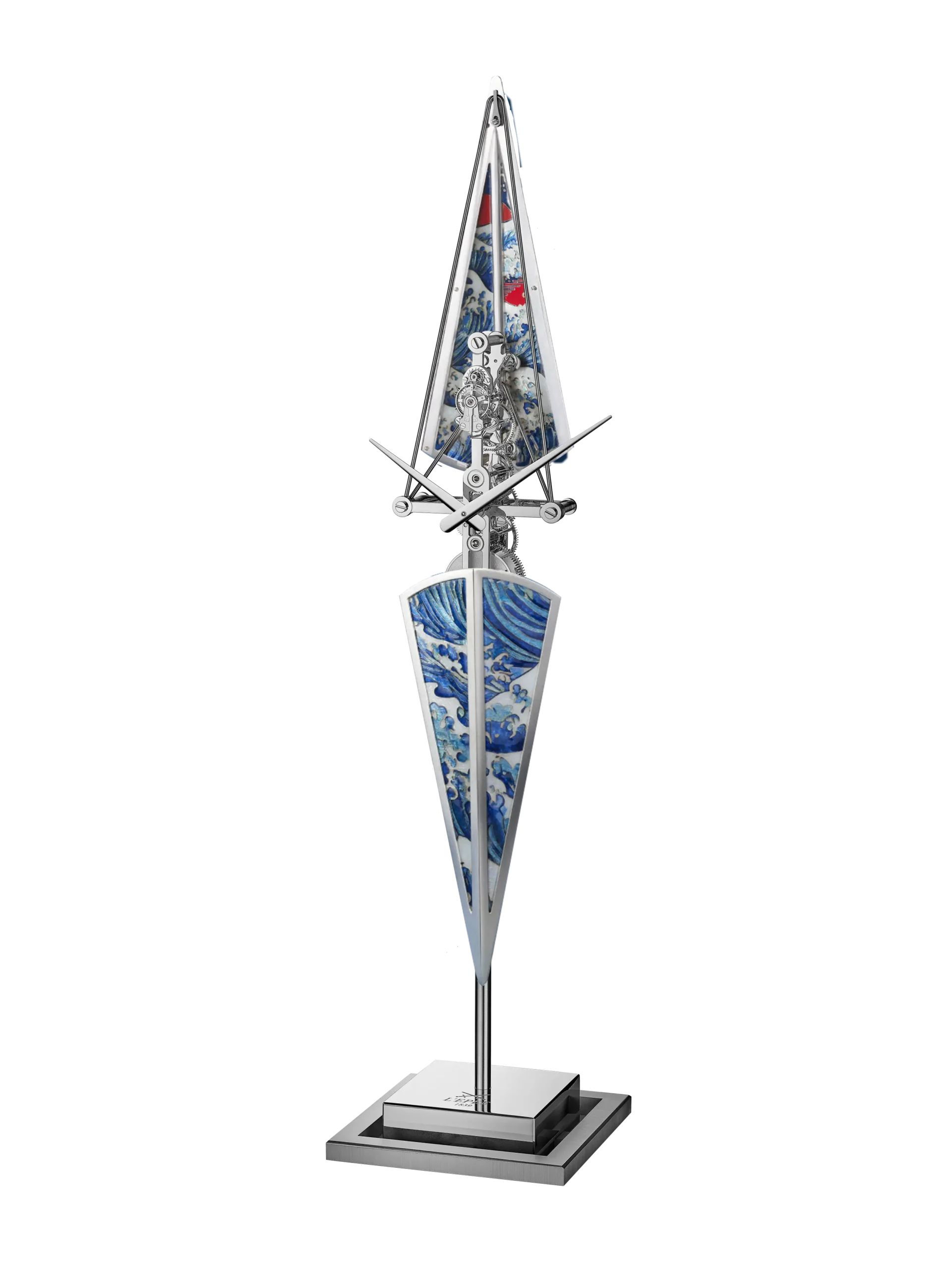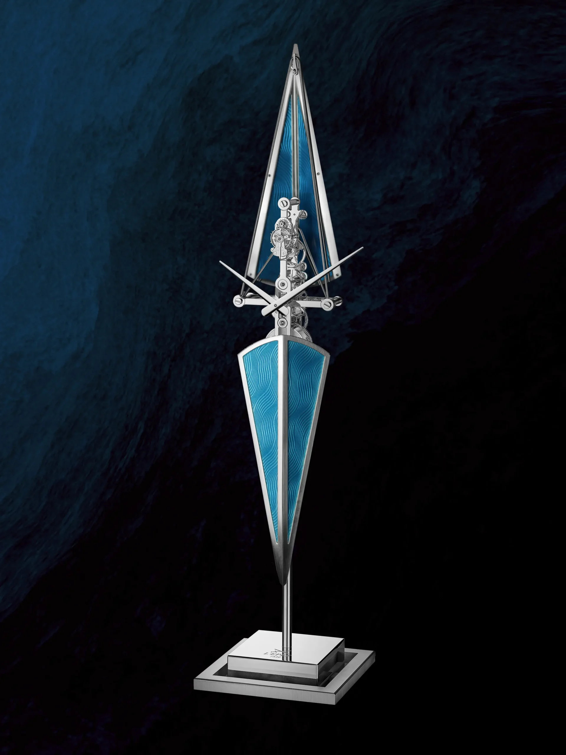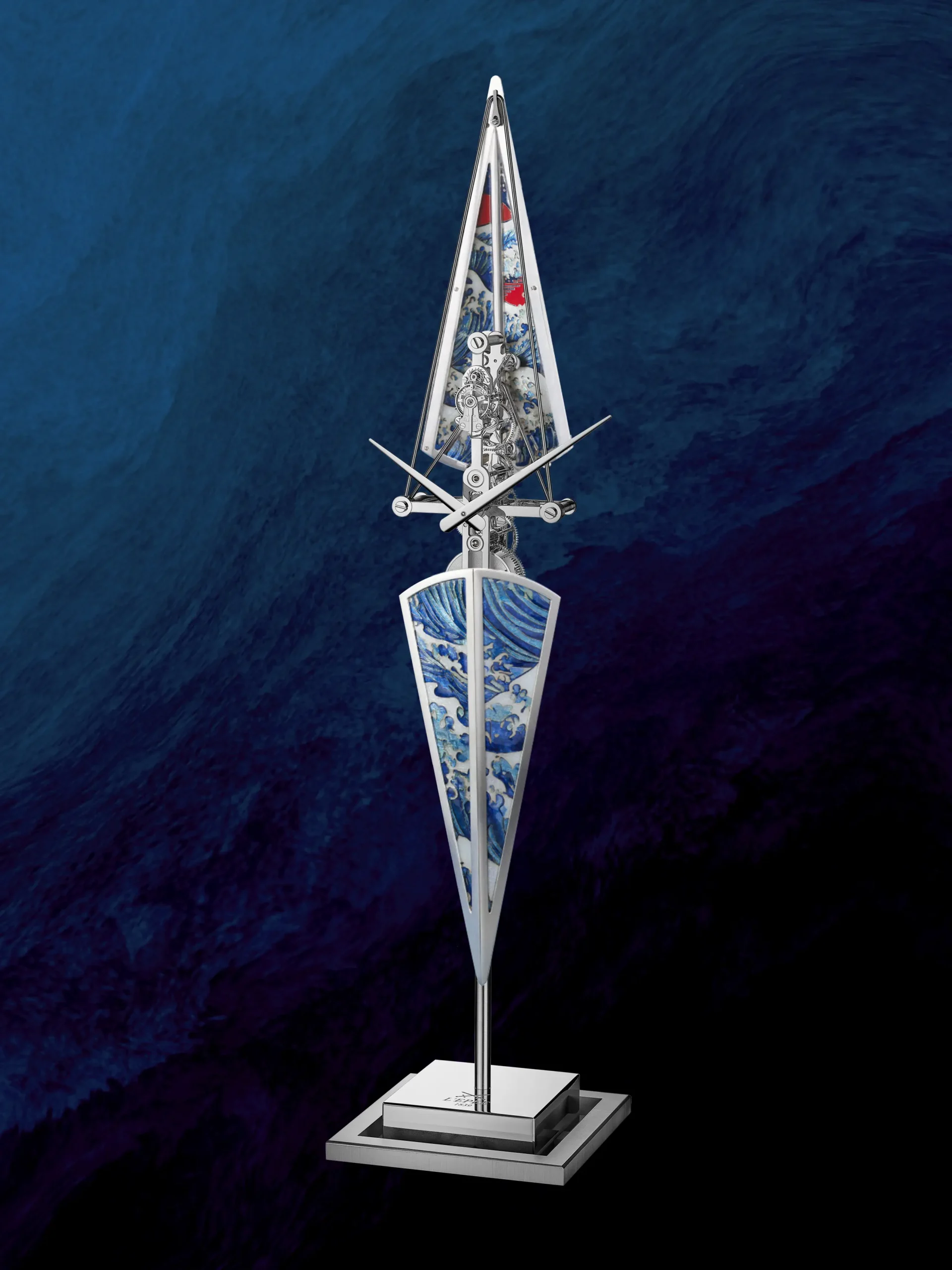 세 모델 모두 고요한 물살을 가르는 경주용 보트를 모티프로 삼아 길쭉하고 날렵한 실루엣을 드러낸다. 높이 518mm, 하단 지지대 120mm로 제작했으며, 오브제 전면에서 보이는 날렵한 핸즈로 시와 분을 표시한다. 모든 기어 장치를 하나의 수직 축을 따라 정렬한 인하우스 무브먼트를 탑재했다. 여기에 충격 흡수를 위한 잉카블록을 적용해 내구성을 강화했다. 시간당 진동수는 18,000vph(2.5Hz), 파워리저브는 8일이다. 베이스와 무브먼트는 스테인리스 스틸과 팔라듐 도금한 황동, 알루미늄으로 제작했으며, 선체 부분은 에나멜과 은박, 구리, 순금 와이어로 완성했다.