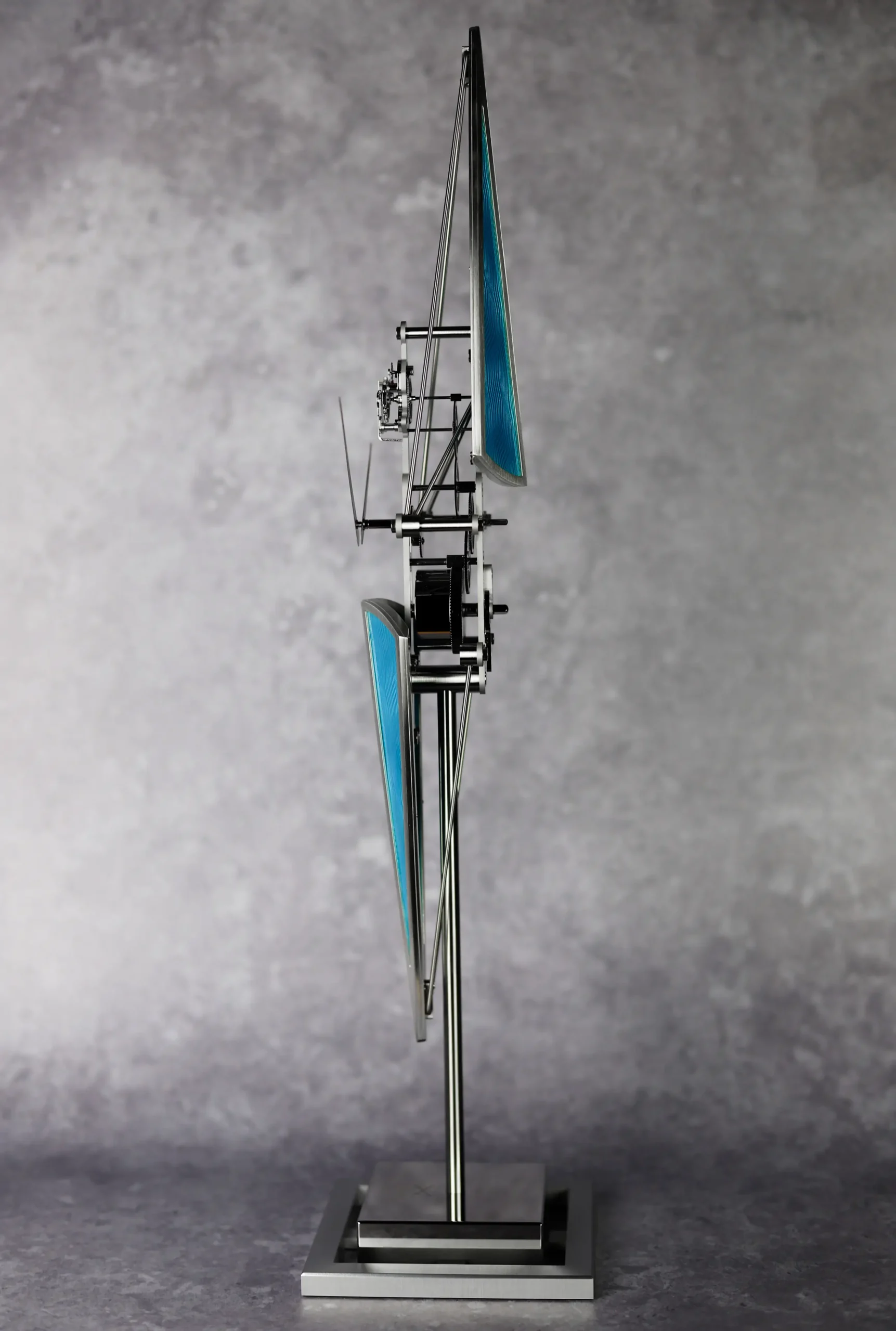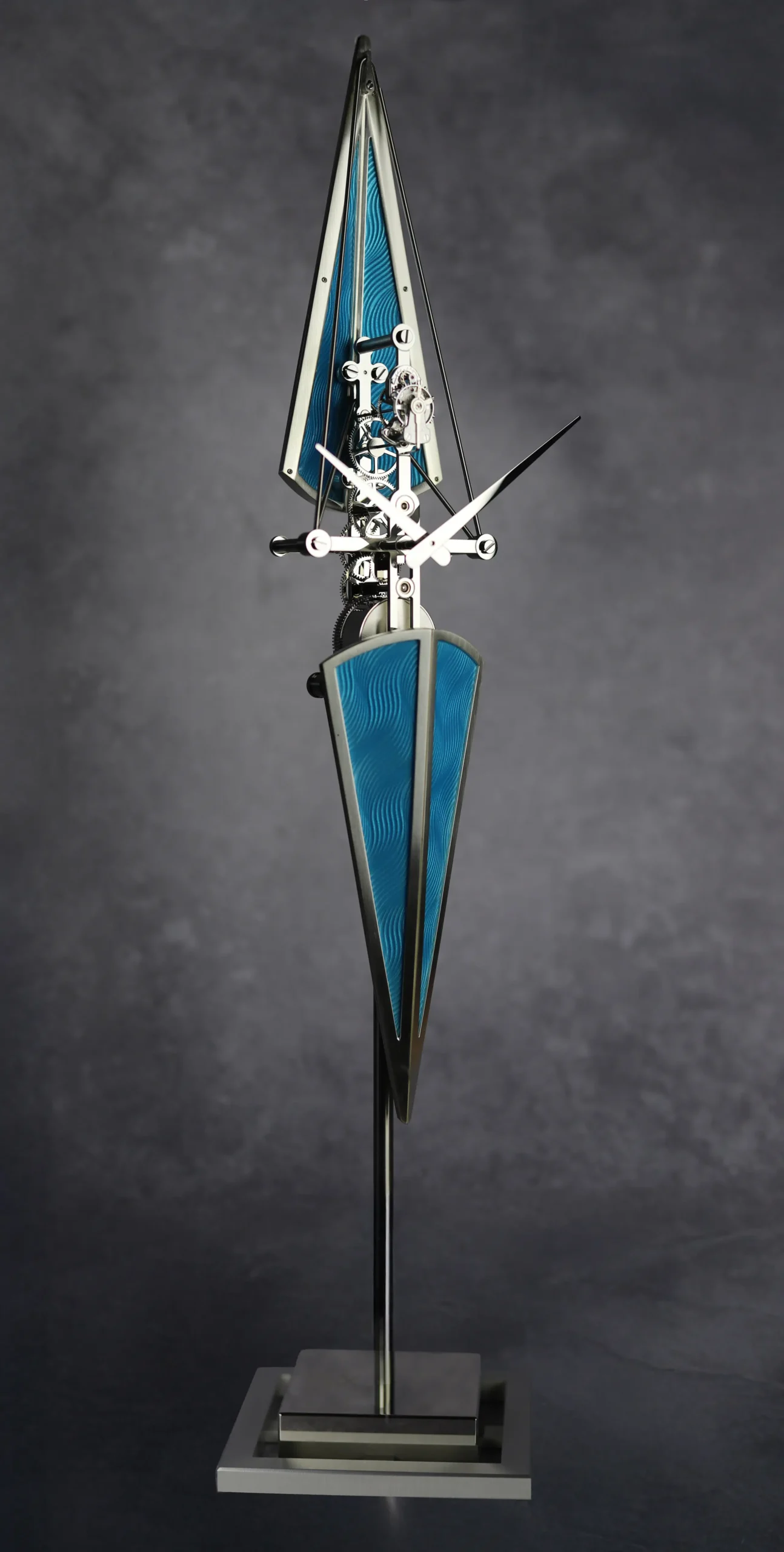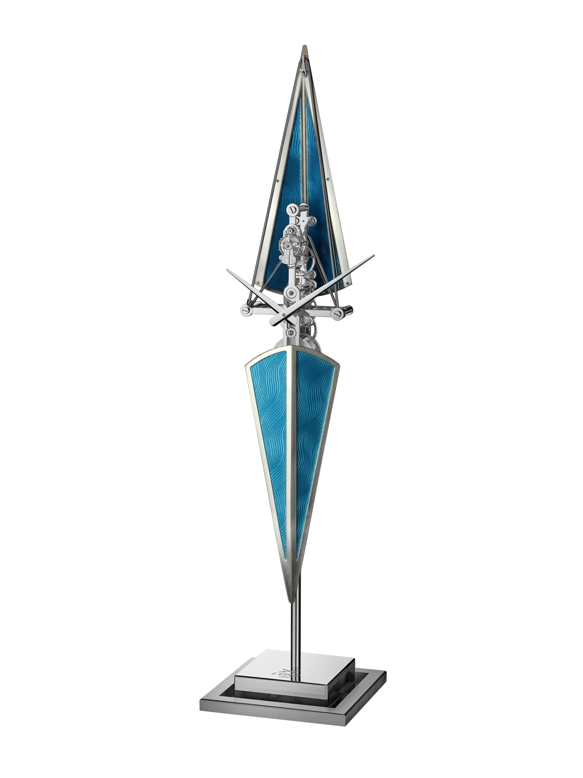 세 모델 모두 고요한 물살을 가르는 경주용 보트를 모티프로 삼아 길쭉하고 날렵한 실루엣을 드러낸다. 높이 518mm, 하단 지지대 120mm로 제작했으며, 오브제 전면에서 보이는 날렵한 핸즈로 시와 분을 표시한다. 모든 기어 장치를 하나의 수직 축을 따라 정렬한 인하우스 무브먼트를 탑재했다. 여기에 충격 흡수를 위한 잉카블록을 적용해 내구성을 강화했다. 시간당 진동수는 18,000vph(2.5Hz), 파워리저브는 8일이다. 베이스와 무브먼트는 스테인리스 스틸과 팔라듐 도금한 황동, 알루미늄으로 제작했으며, 선체 부분은 에나멜과 은박, 구리, 순금 와이어로 완성했다.