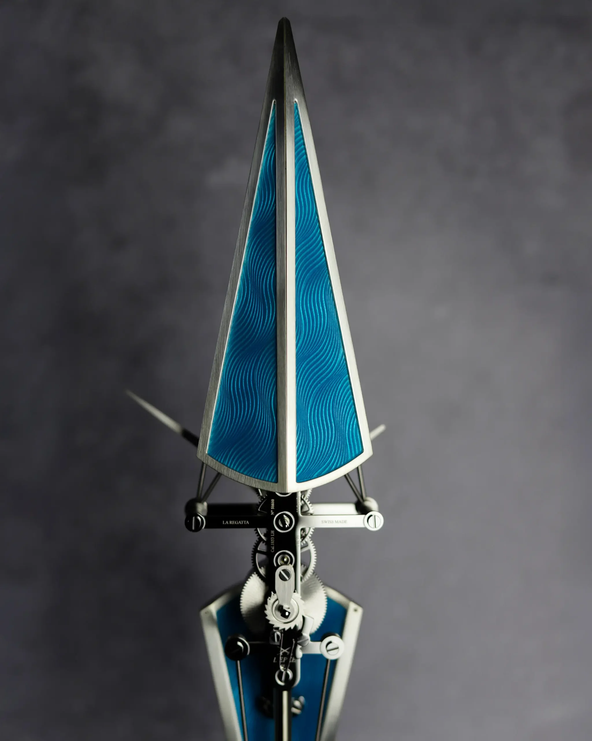‘라 레가타 블루 호라이즌(La Regatta Blue Horizon)’은 기요셰 위에 에나멜을 입히는 플린케(Flinqué) 기법을 적용해 바다를 연상시키는 깊고 푸른 블루 컬러를 구현했다. 플린케 에나멜링은 정교하게 조각한 기요셰 패턴 위에 반투명 에나멜을 여러 겹 입히는 공예 기법으로,하부 장식이 그대로 드러나도록 해 표면에 깊이감과 풍부한 광택을 더한다. ‘라 레가타 블루 호라이즌’의 표면은 푸른빛 색감 위로 배가 물길을 가르며 남긴 잔물결의 흔적을 떠올리게 하는 무늬를 드러내며, 빛의 각도에 따라 미묘하게 변화해 시각적인 움직임을 연출한다.