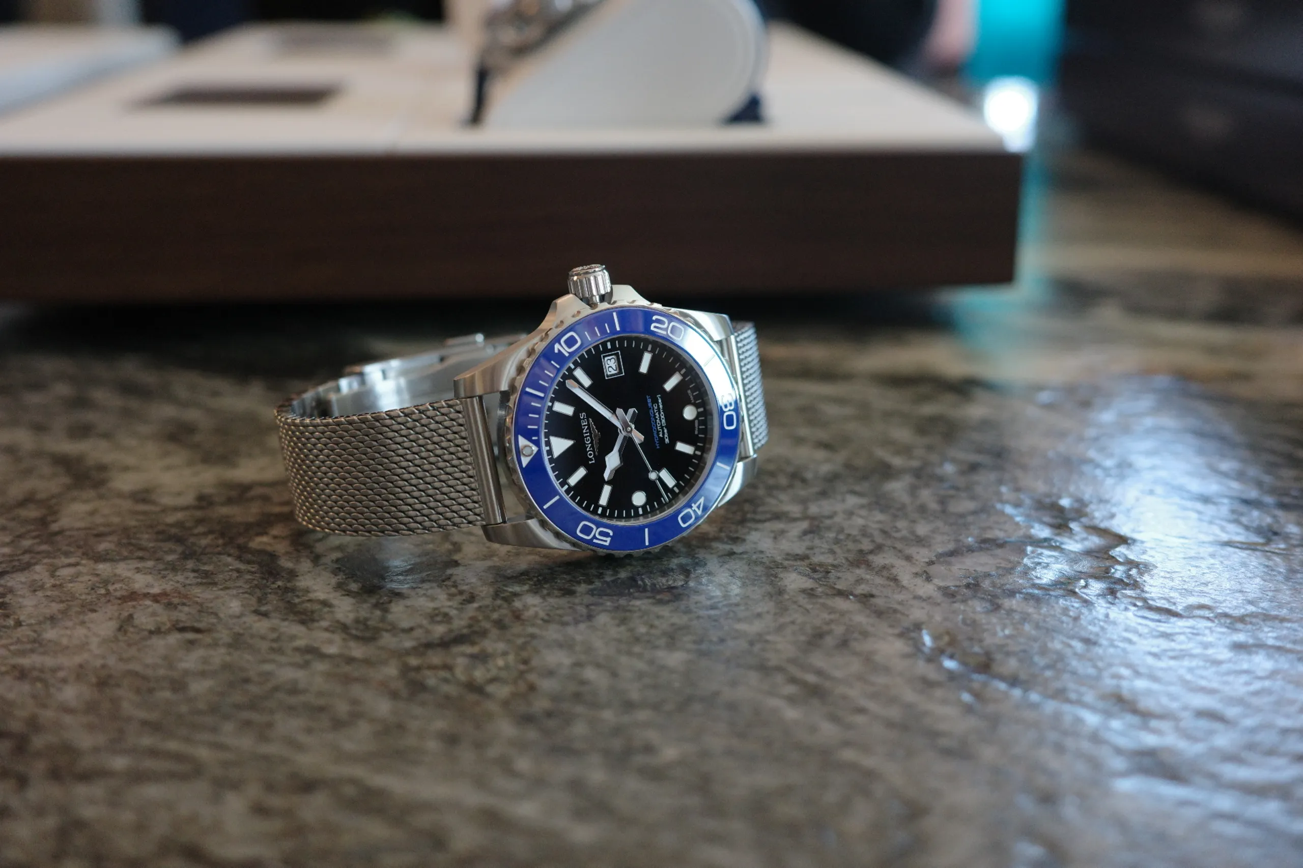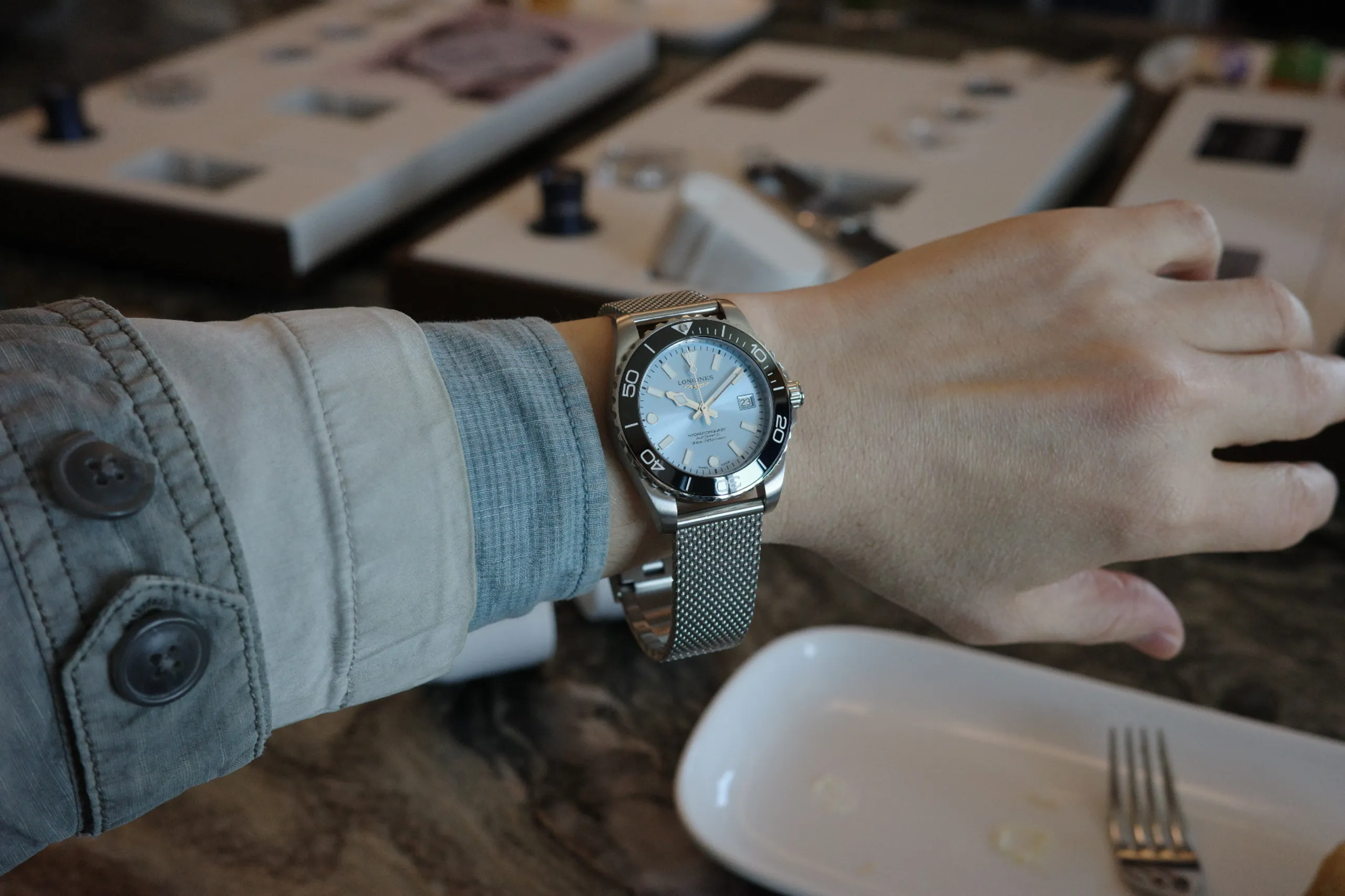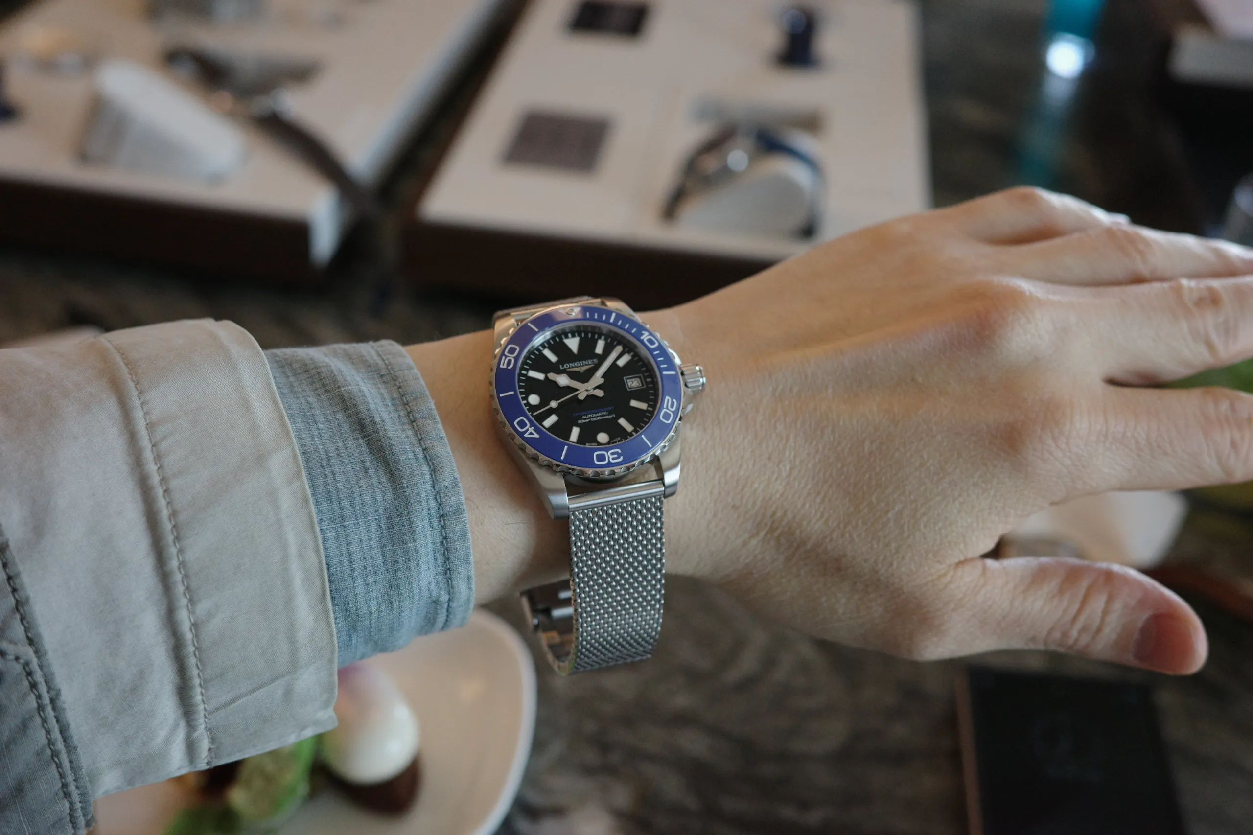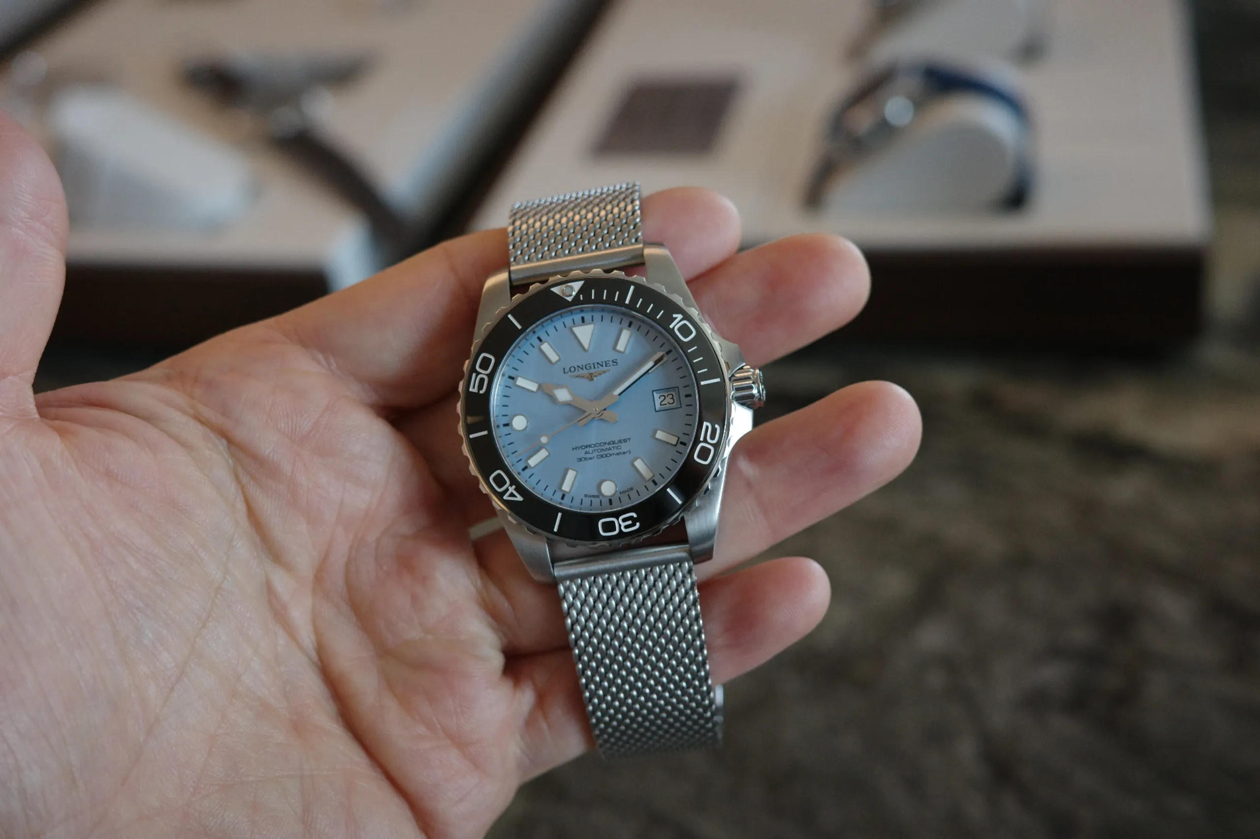 여러 레퍼런스 중에서 또 하나 주목할 모델은 프로스티드 블루 다이얼 모델이다. 메시 브레이슬릿은 블랙 세라믹, 일반 브레이슬릿은 루미너스 블루(론진 블루) 세라믹을 적용해 차별화한 점도 흥미로웠다.