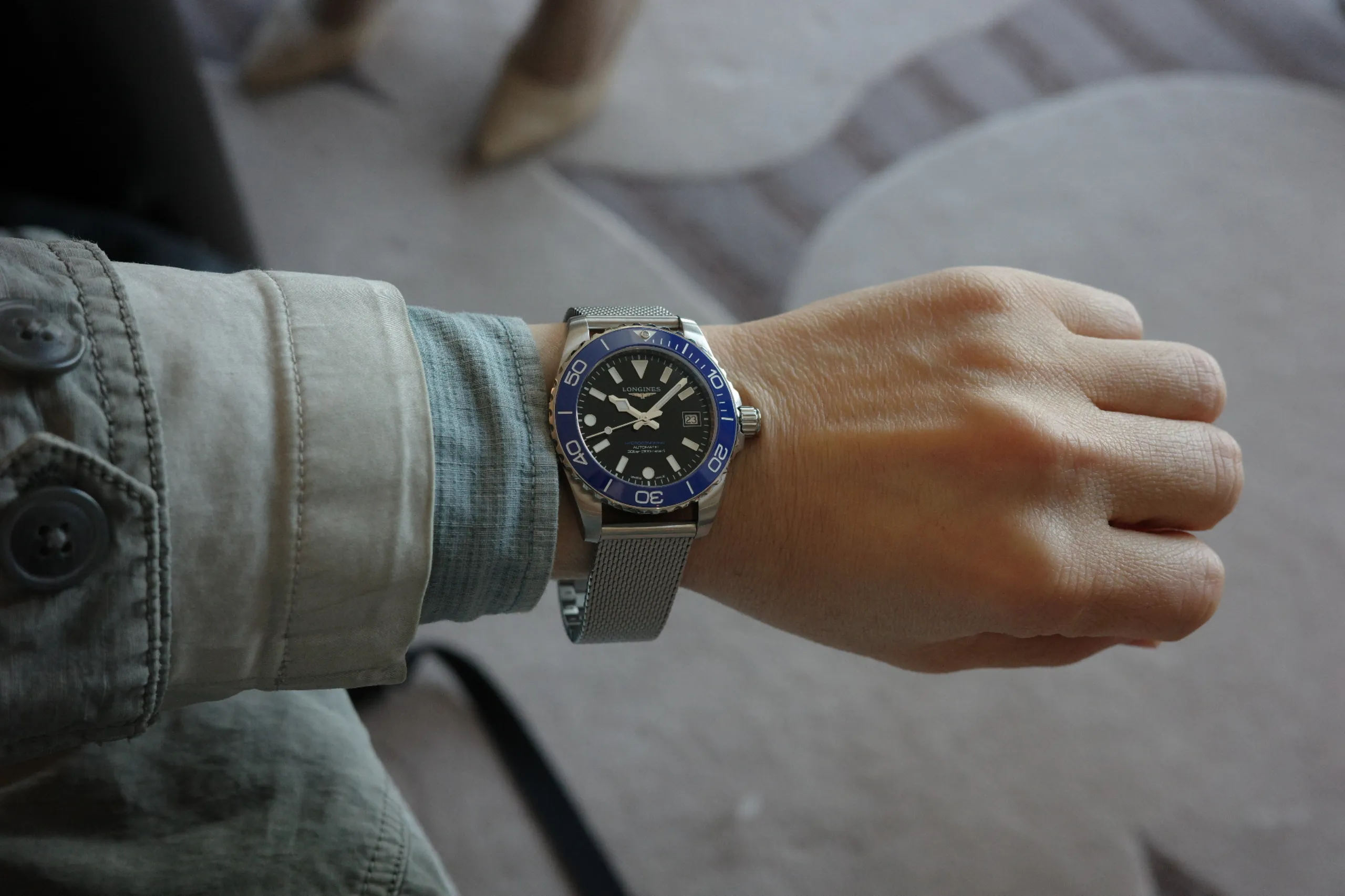 클로카는 지난 3월 25일 론진 2026년 신제품 공개 행사에 참석해 신형 하이드로콘퀘스트를 미리 만나봤다. 이번 제품은 케이스, 다이얼, 브레이슬릿 등 여러 부분에서 변화를 느낄 수 있었다. 얼굴은 기존 GMT 모델의 디자인을 이어받았다. 12시 방향에 역 삼각형 인덱스를, 6시와 9시 정방향에 도트 인덱스를 넣고, 나머지 방향에는 바 인덱스를 넣었다. 일반적인 다이버 워치와는 아예 상반된 배치인데, 꽤 신선하다. 바 인덱스가 메인이라서 메시 브레이슬릿과 조합하니 빈티지 다이버 워치의 분위기도 살짝 느껴진다.