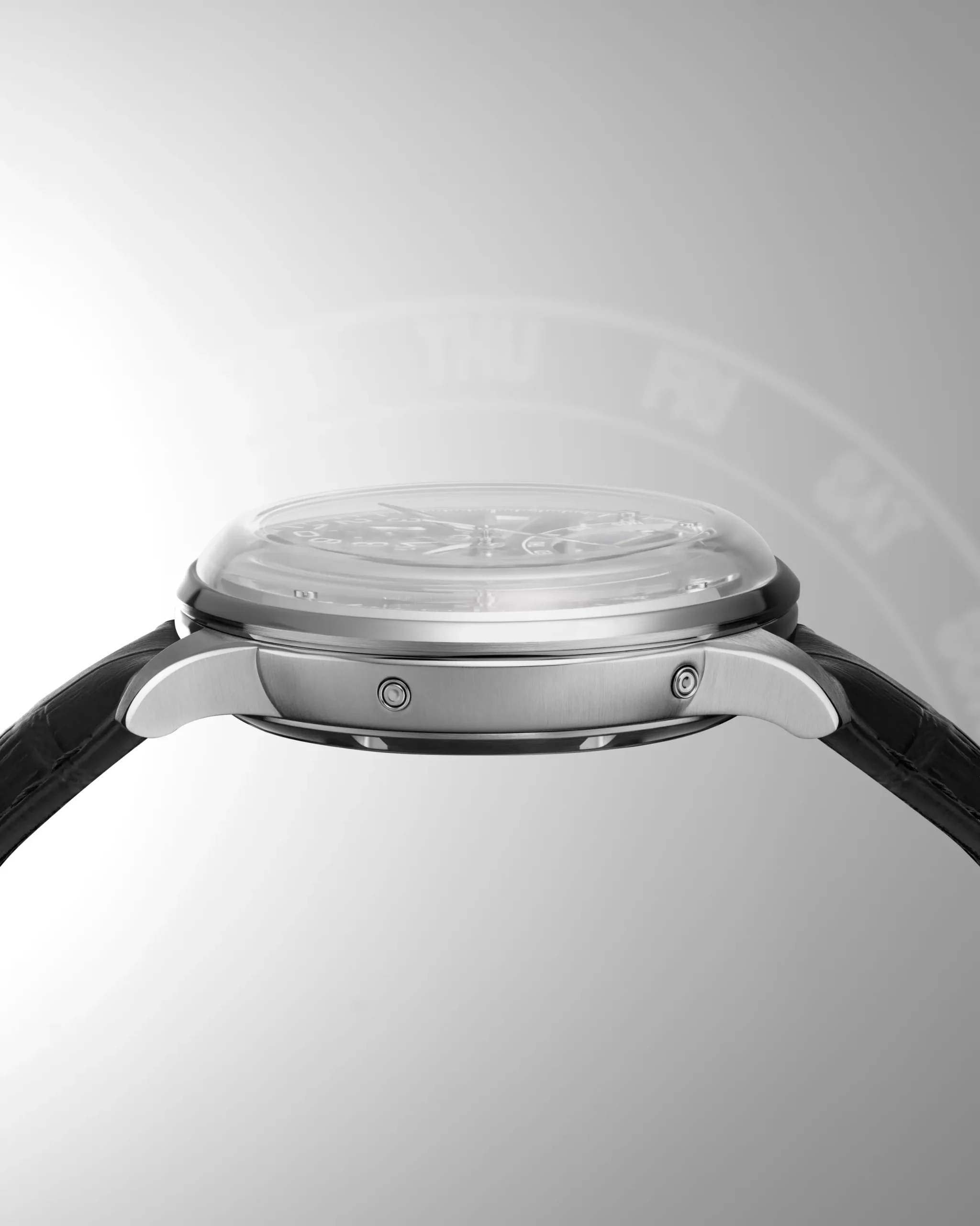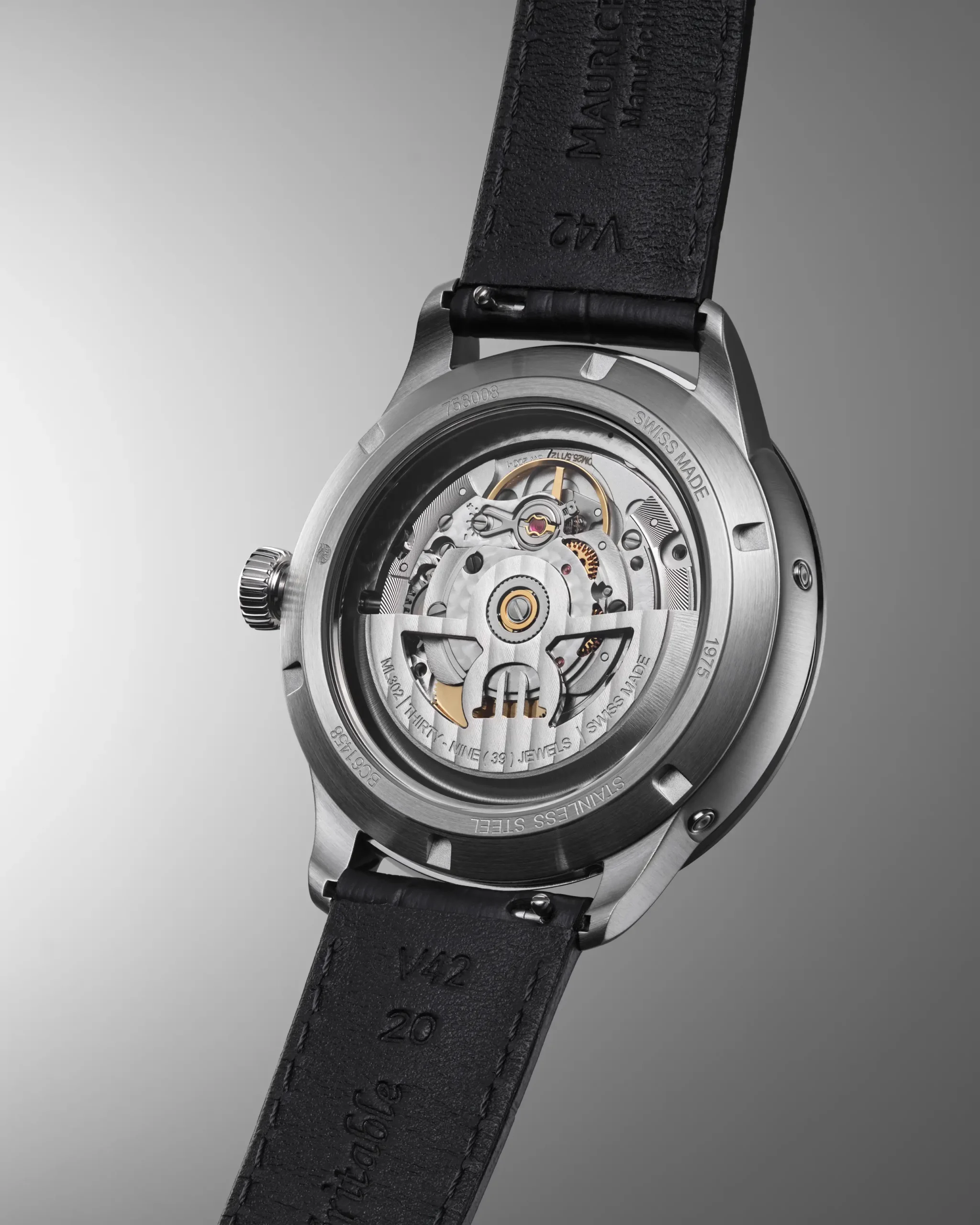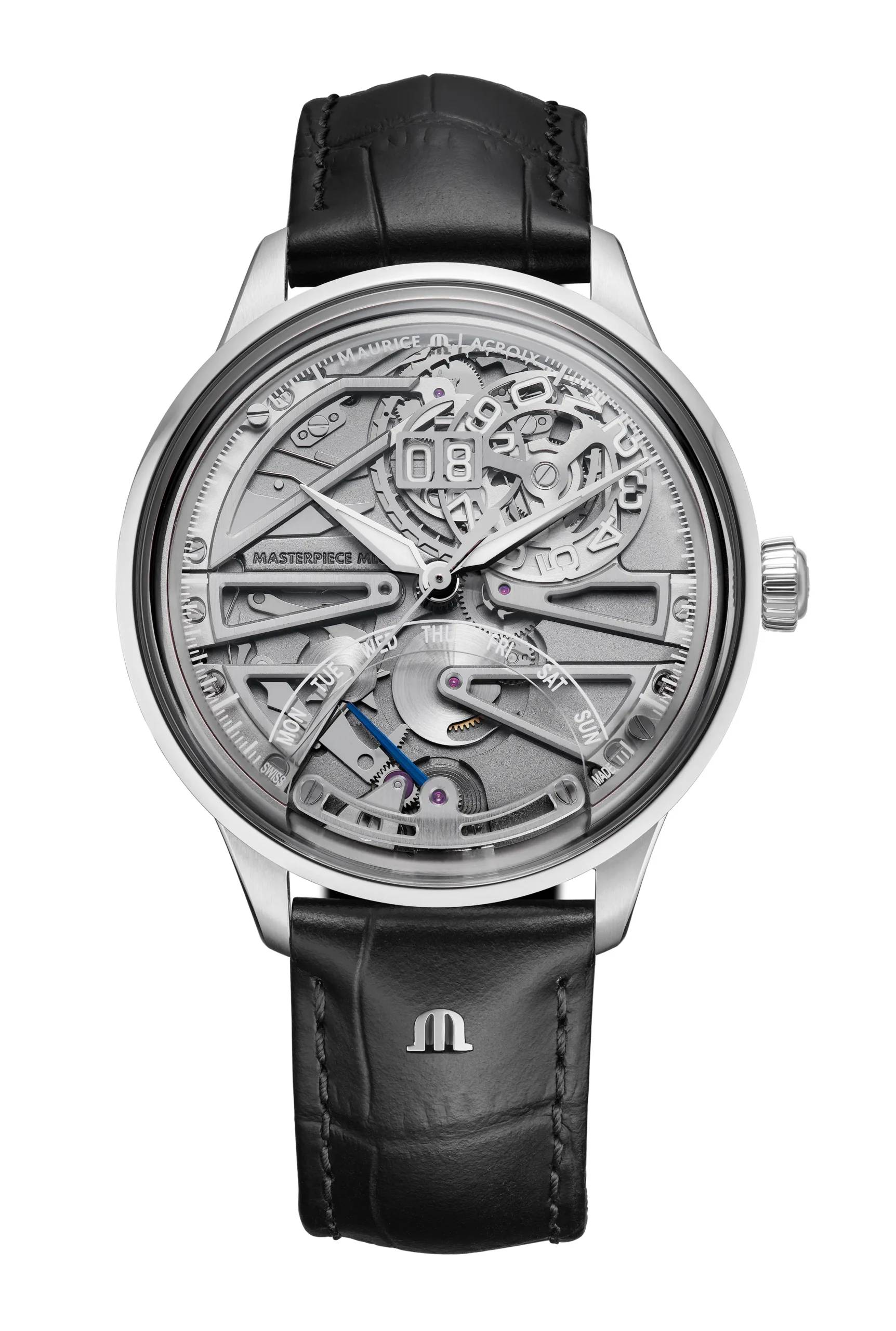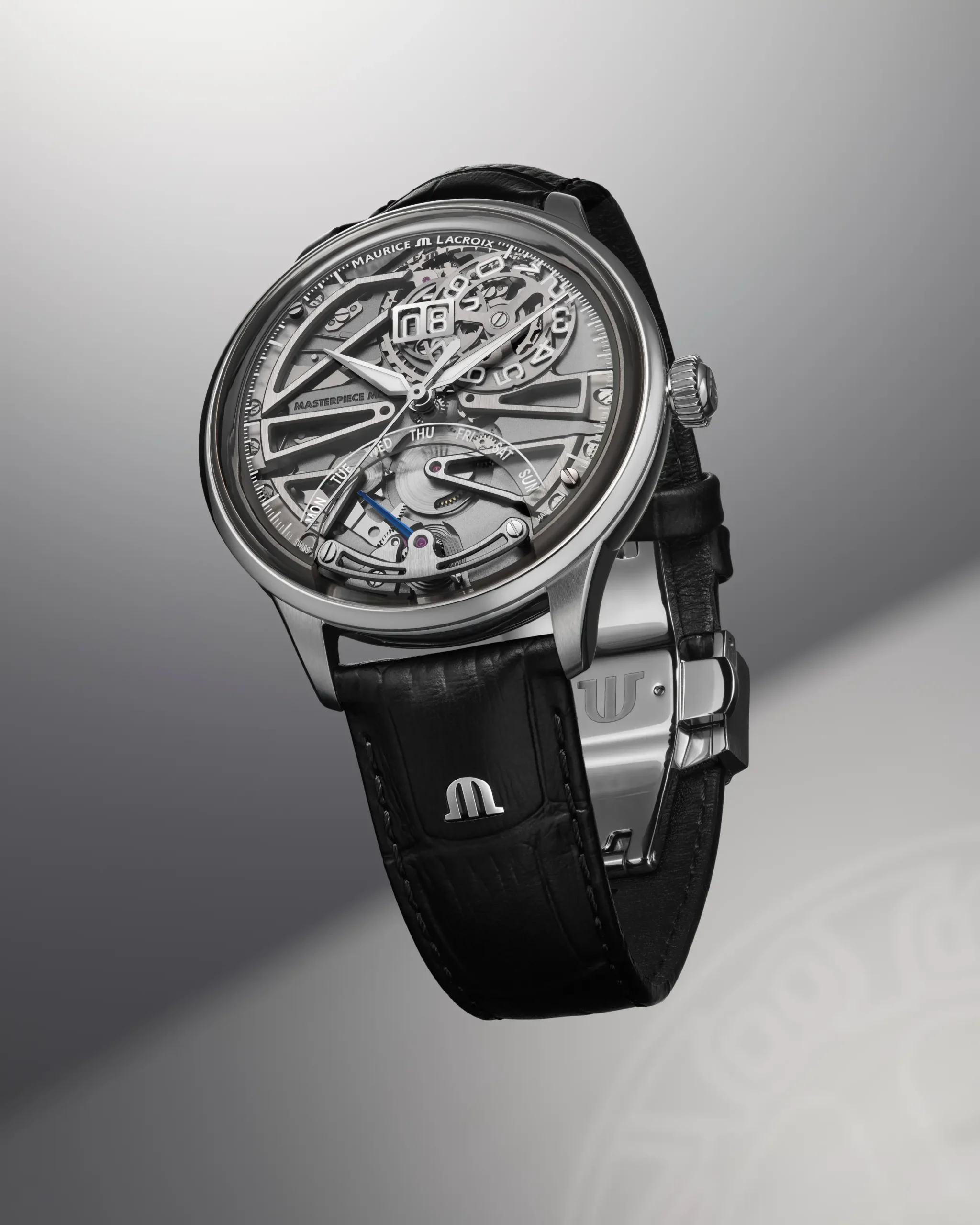 브러시드와 폴리시드 가공을 교차 적용한 스테인리스 스틸 케이스의 지름은 42mm, 두께는 12.75mm다. 사파이어 크리스털 글라스백을 통해 무브먼트를 드러낸다. 케이스 우측 측면에는 캘린더 정보를 조정하기 위한 커렉터를 설치했다. 구매 시 함께 제공되는 도구를 이용해 가볍게 눌러주면 된다. 방수는 50m다. 악어 가죽 패턴을 입힌 검은색 소가죽 스트랩에는 모리스 라크로와의 로고를 부착해 멋을 부렸다. 사용자가 직접 스프링 바를 조작할 수 있어서 스트랩 교체가 용이하다. 스테인리스 스틸 폴딩 버클을 연결해 편하게 착용할 수 있다.