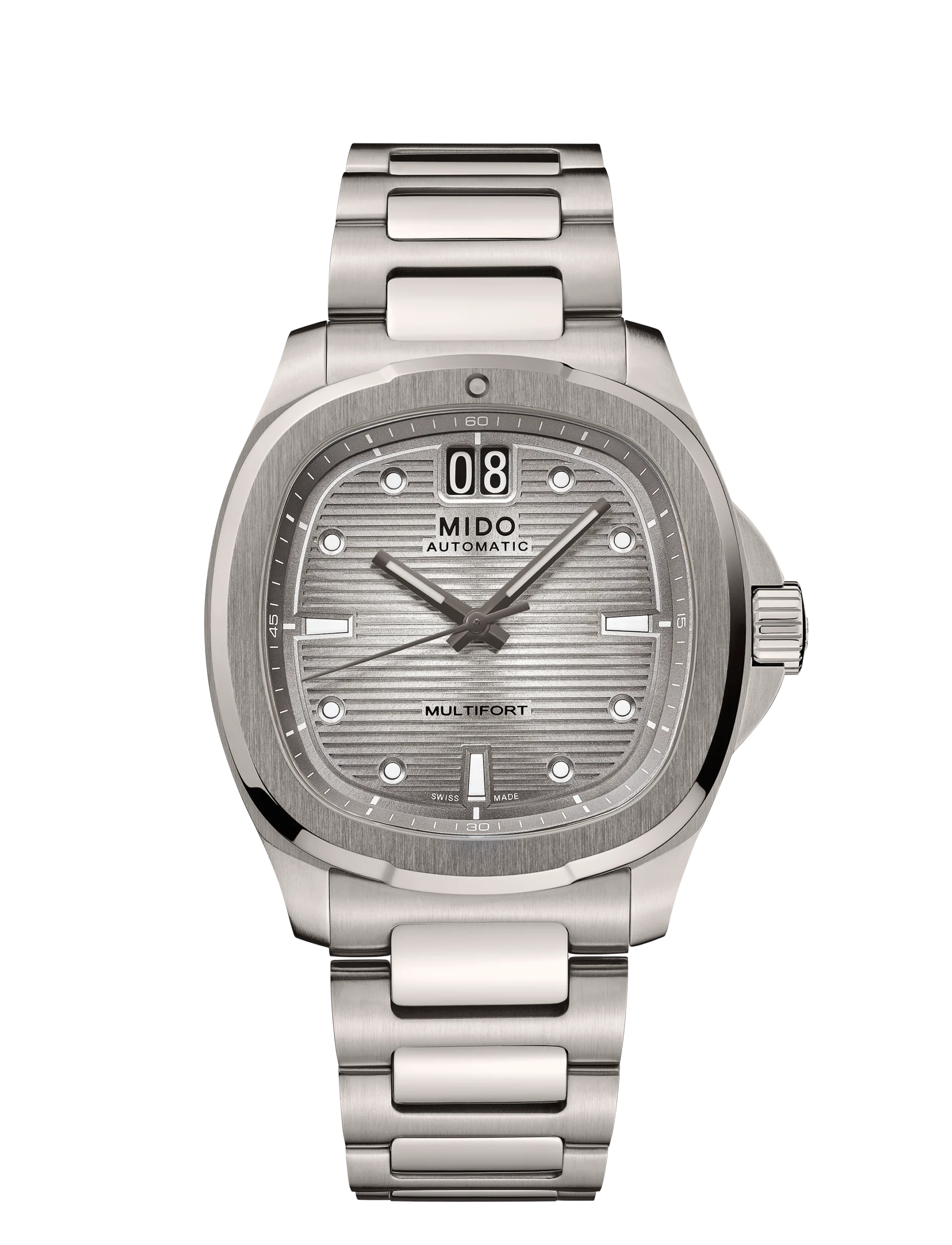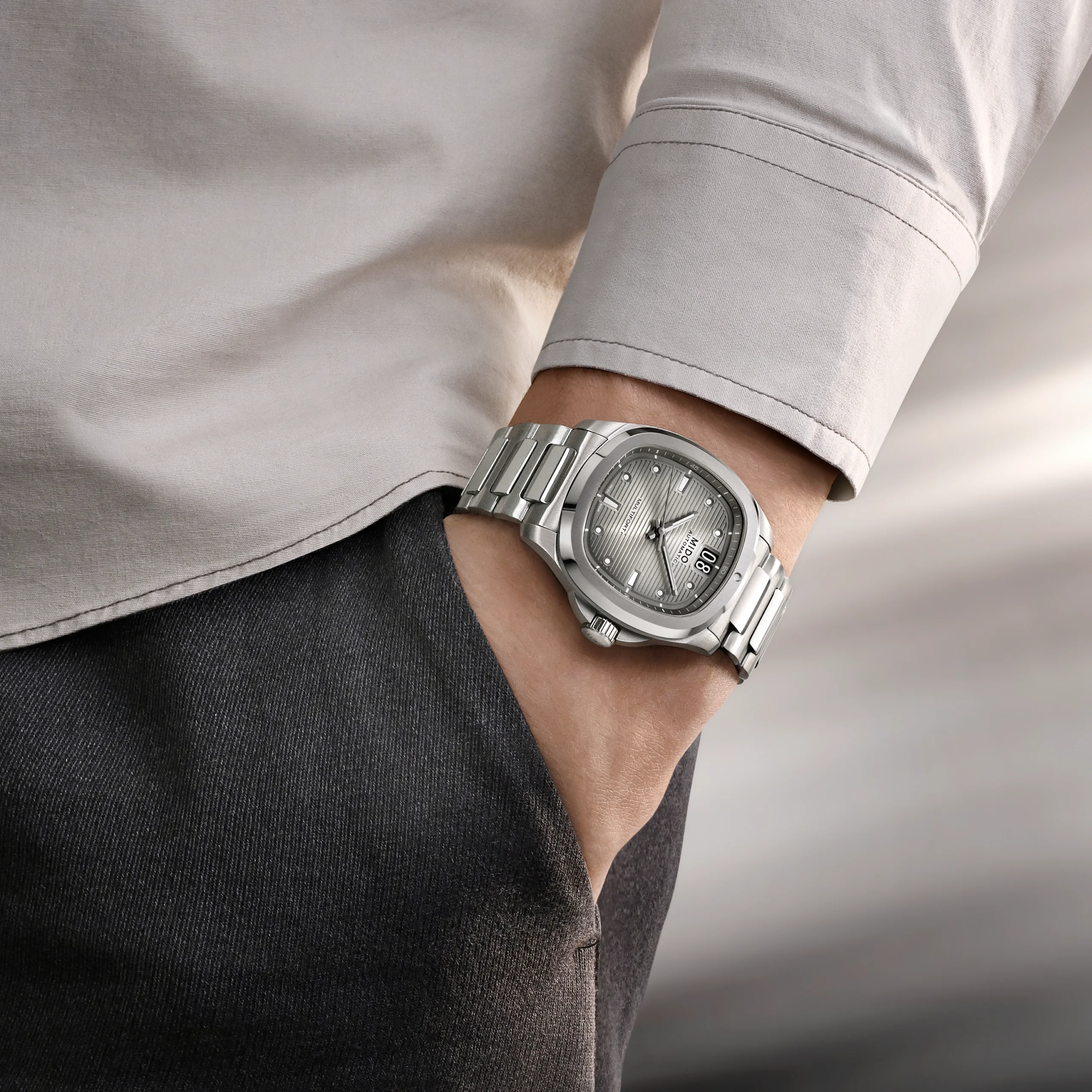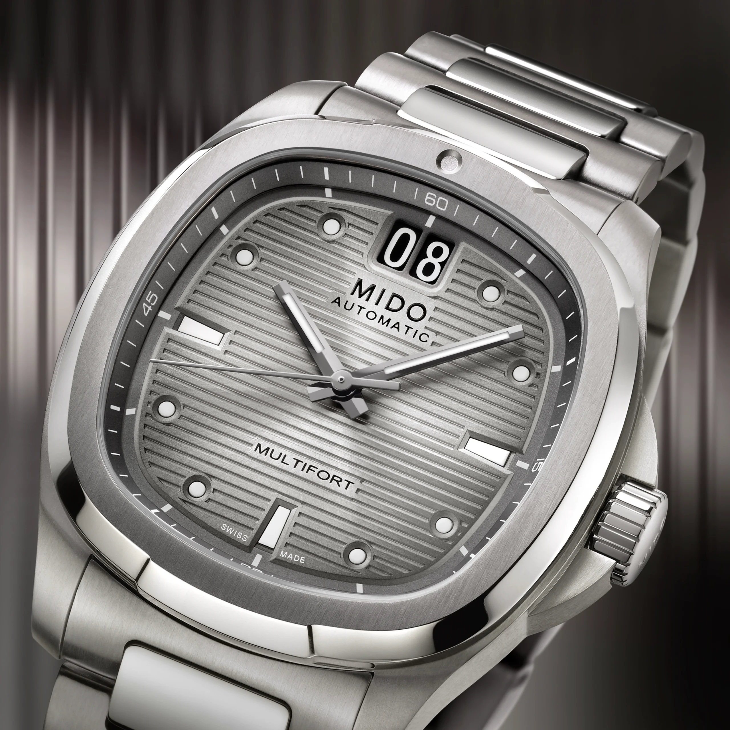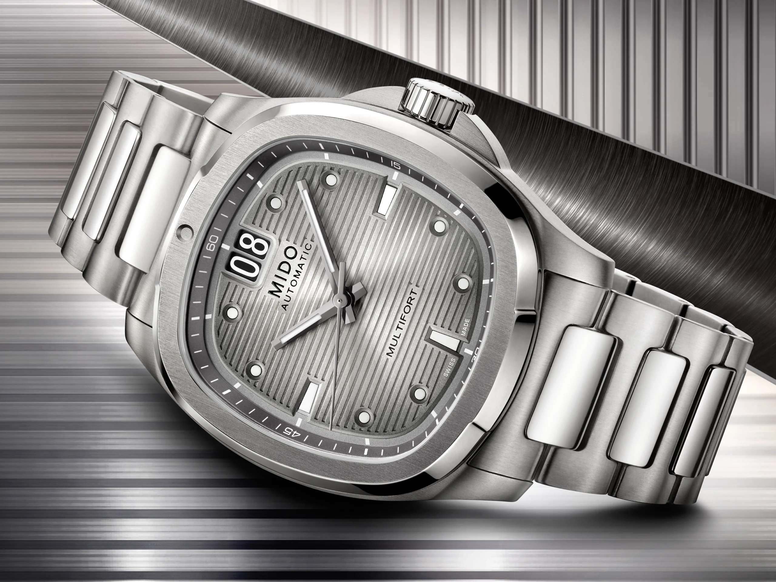 미도의 최신 컬렉션 멀티포트 TV 시리즈는 1970년대에 유행한 브라운관 TV를 옮겨 놓은 듯한 독특한 실루엣을 현대적인 감성으로 재해석해 인기를 얻고 있다. 얼마 전 새로운 기능인 크로노그래프 버전을 공개한 데 이어, 이번에는 기존 빅데이트 모델의 티타늄 버전을 선보이며 컬렉션을 다시 한번 확장했다.