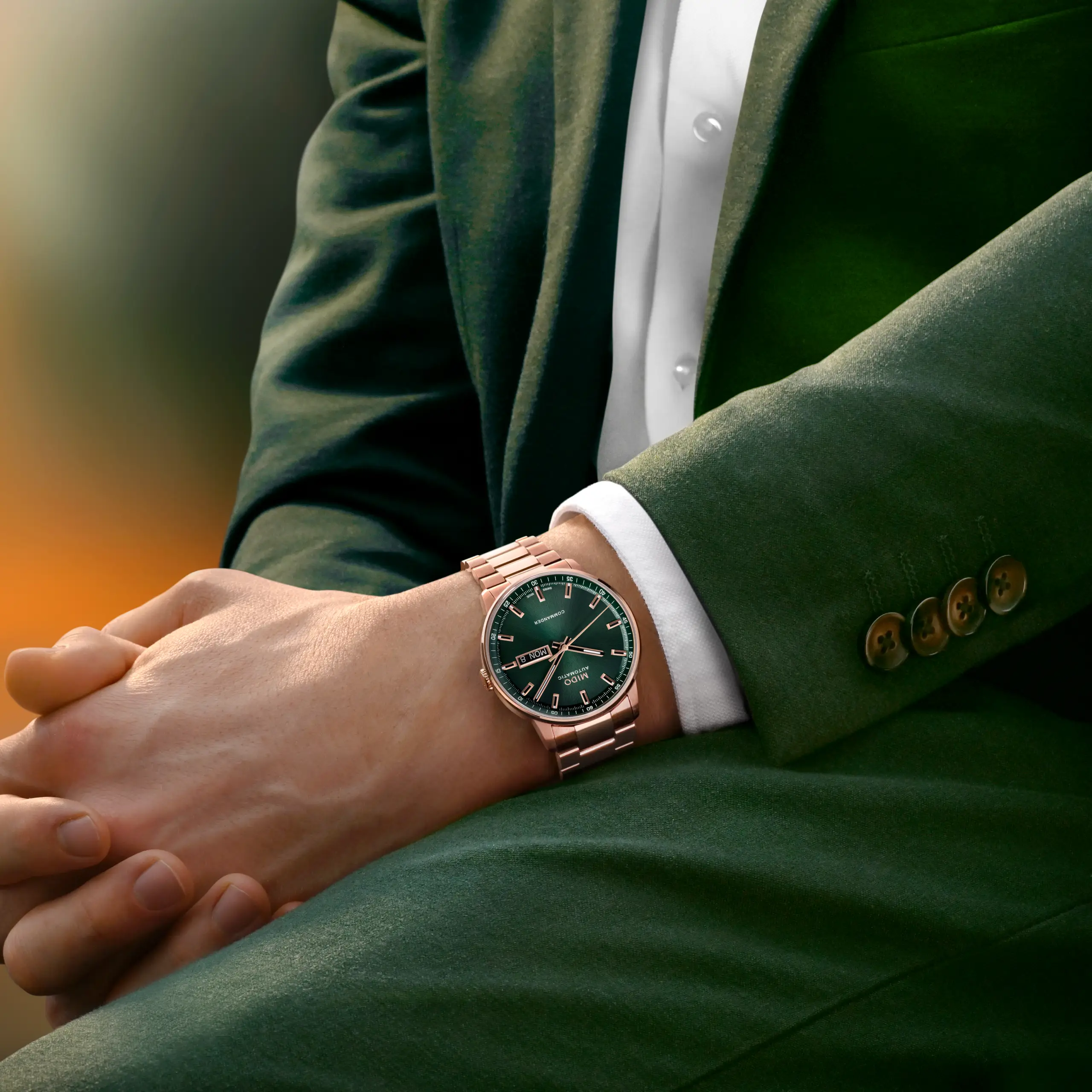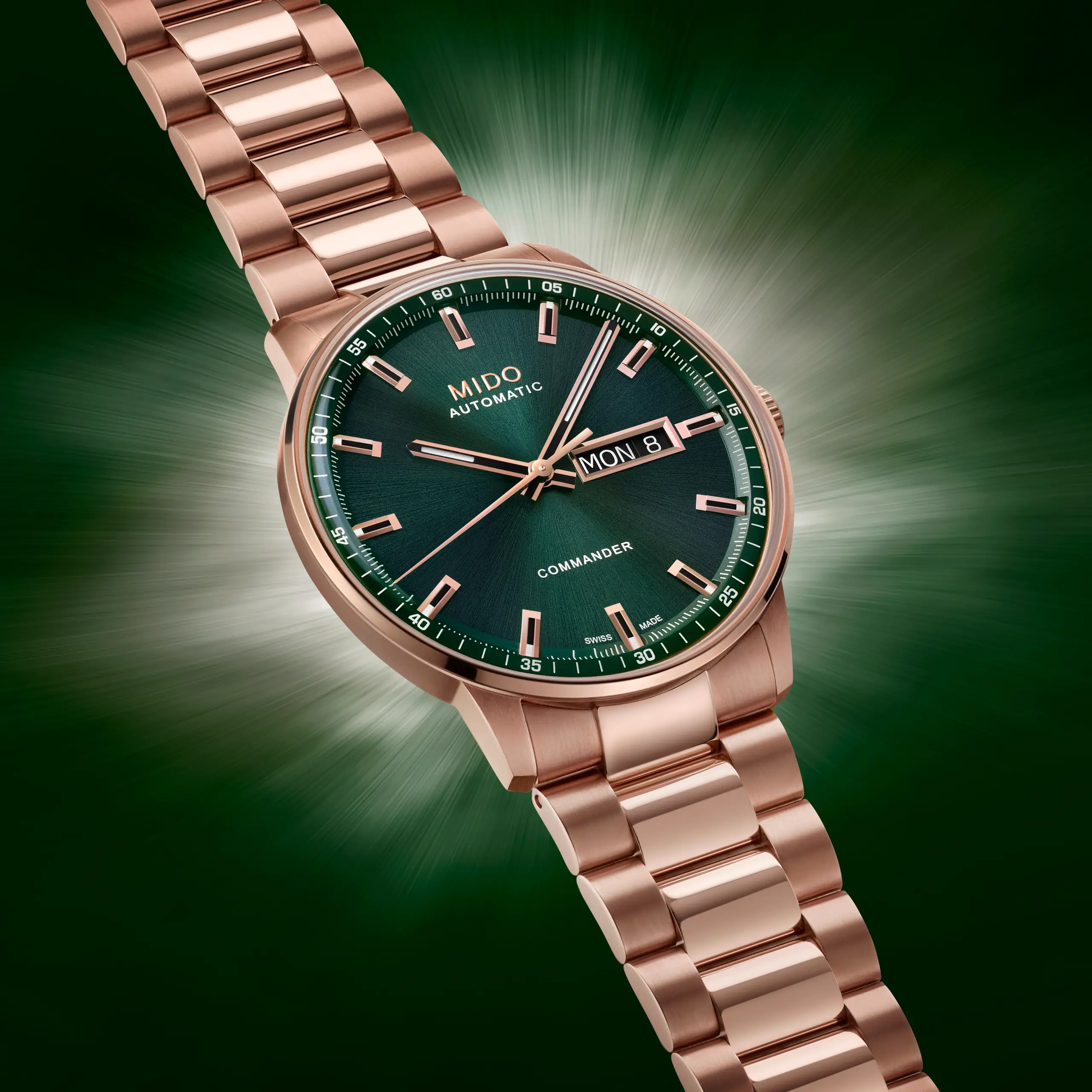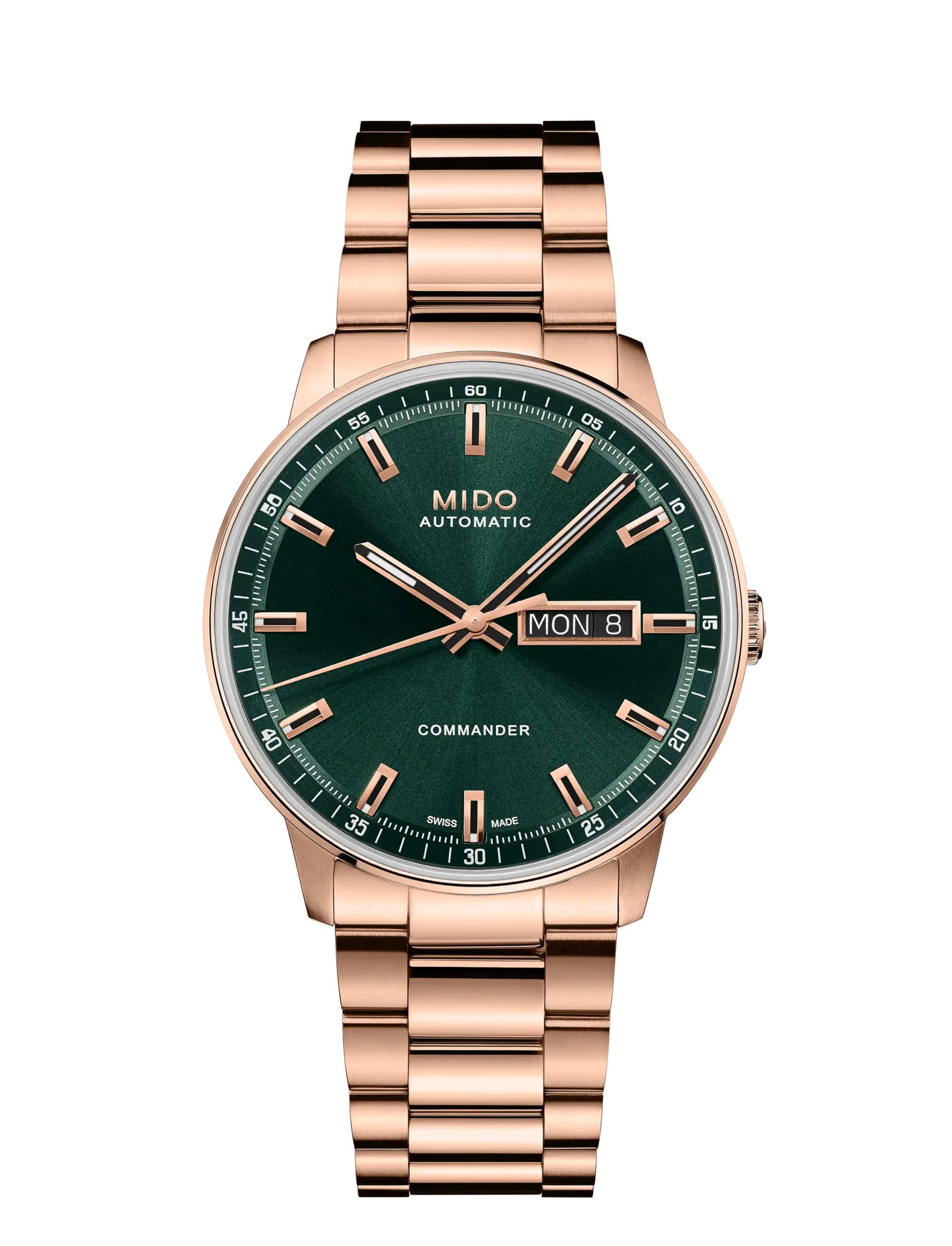 미도 ‘커맨더 다투데이’는 다크 그린 다이얼과 로즈 골드 PVD 코팅 스테인리스 스틸 케이스를 조합한 버전 외에 다크 블루, 실버 화이트, 그레이 다이얼을 갖춘 스테인리스 스틸 케이스 모델 3종도 함께 구성된다. 기사의 주인공인 다크 그린 다이얼 버전은 로즈 골드 PVD 코팅을 적용한 케이스 일체형 구조의 스테인리스 스틸 브레이슬릿을 갖췄으며, 새틴 브러시드와 폴리시드 마감을 혼용했다.
