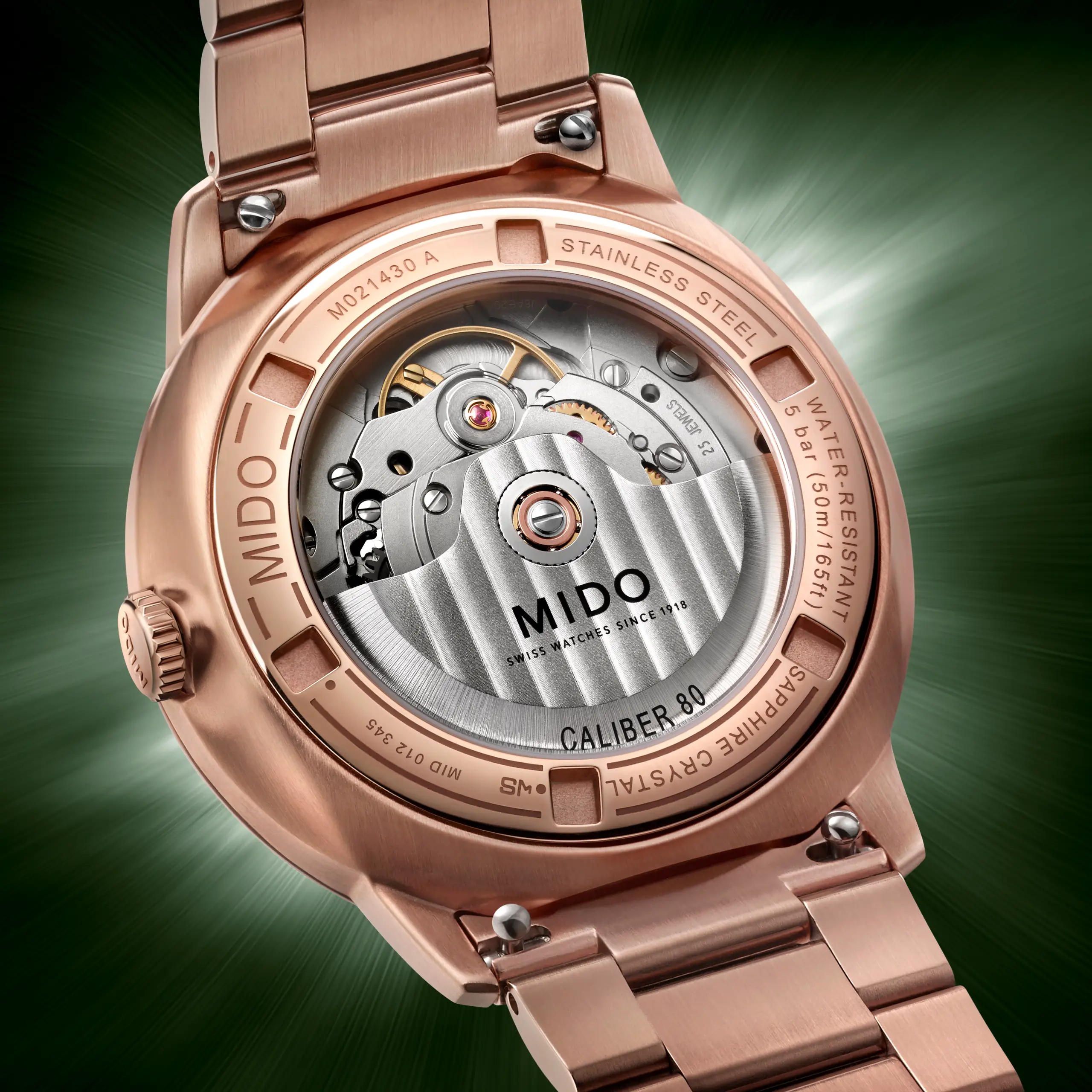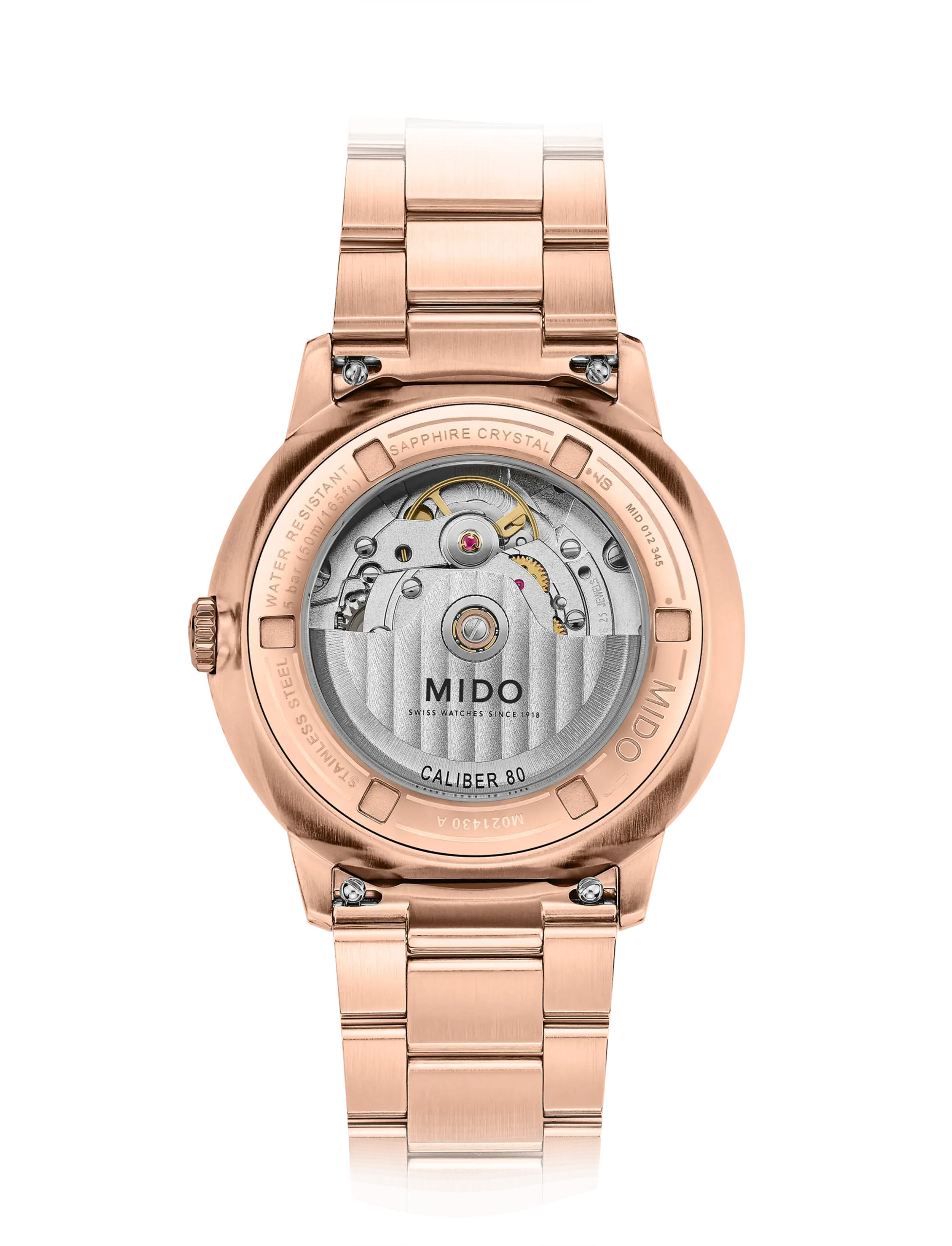 무브먼트는 ETA C07.621을 베이스로 한 칼리버 80을 탑재했다. 니바크론 밸런스 스프링을 갖춰 항자성이 뛰어날 뿐만 아니라 외부 충격과 온도 변화에도 안정적이다. 로터에는 미도 로고와 제네바 스트라이프 패턴을 정교하게 새겼다. 시간당 진동수는 21,600vph(3Hz), 파워리저브는 80시간이다.
