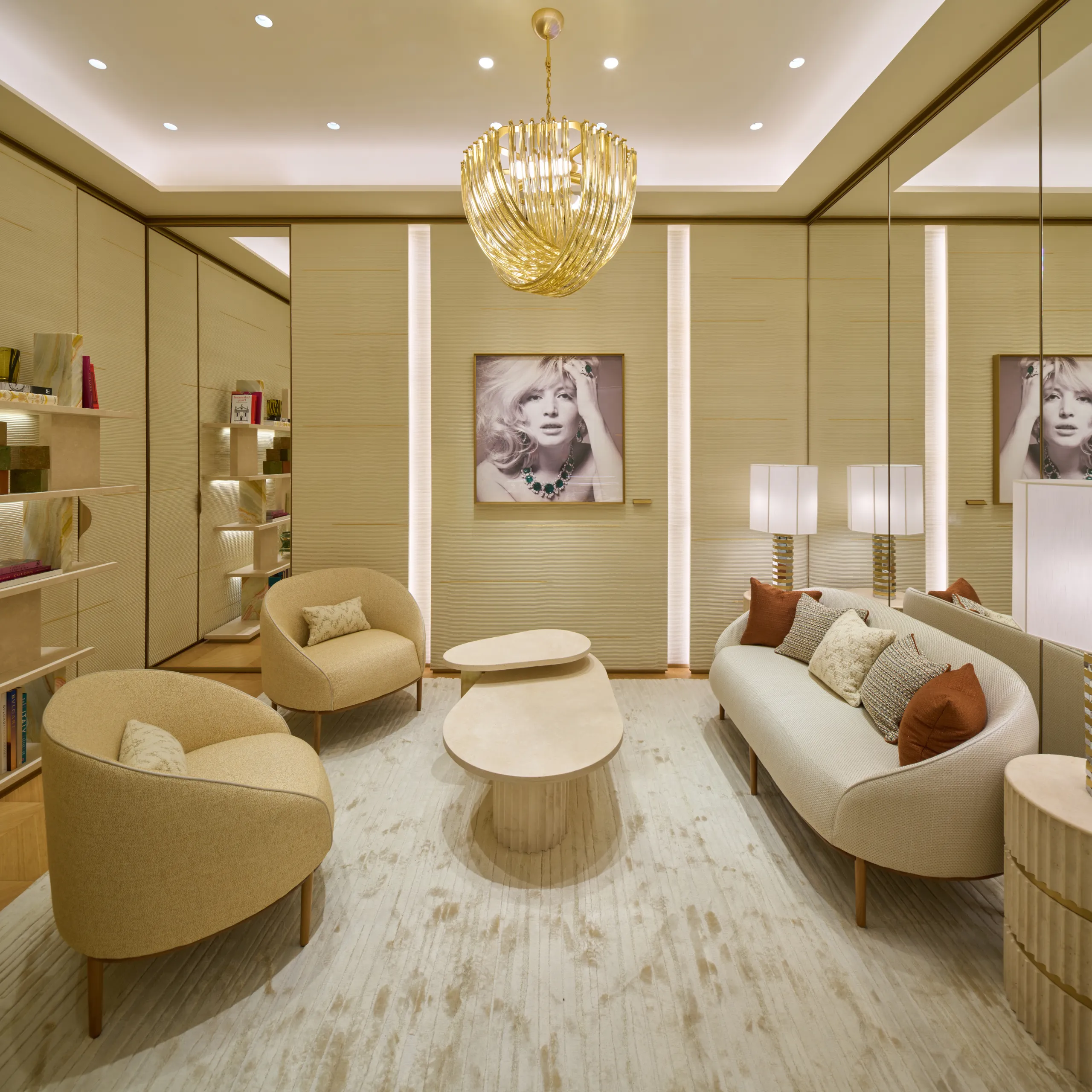 벽면에는 로마 건축 기법인 오푸스 레티쿨라툼(Opus Reticulatum) 패턴을 현대적으로 재해석한 마감을, 바닥에는 칼디아(Caldia) 마블과 금속 인레이로 완성한 콘도티(Condotti) 패턴을 적용해 불가리의 로만 헤리티지를 상징적으로 담아냈다. 여기에 앤디 워홀(Andy Warhol)의 아트워크를 더해 예술적 감성을 더했다. 부티크 안쪽에 마련한 VIC룸은 1940년대 비미니 브레이슬릿과 로마 테르미니 역의 기둥에서 영감을 받은 테이블 램프 등 상징적인 오브제를 통해 불가리의 문화와 디자인 혁신을 조명한다.