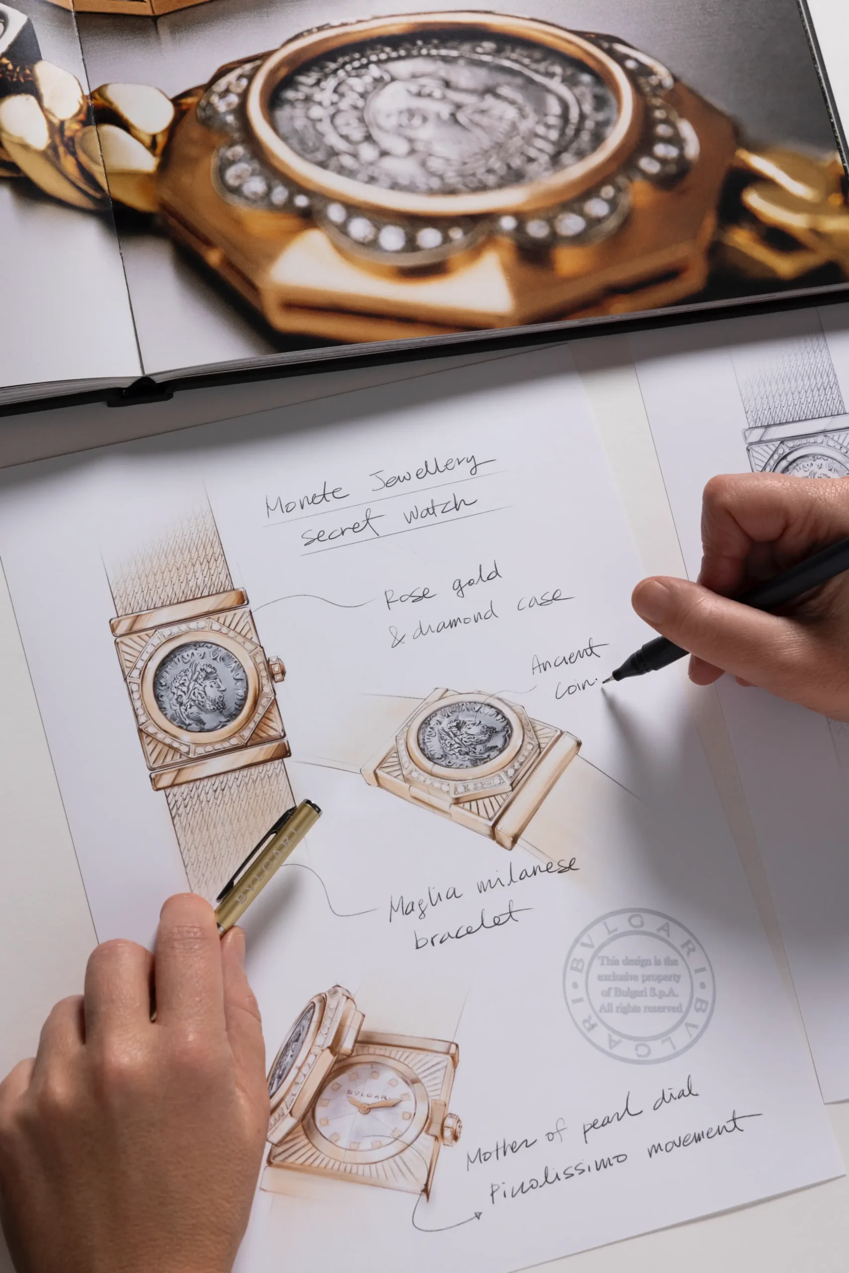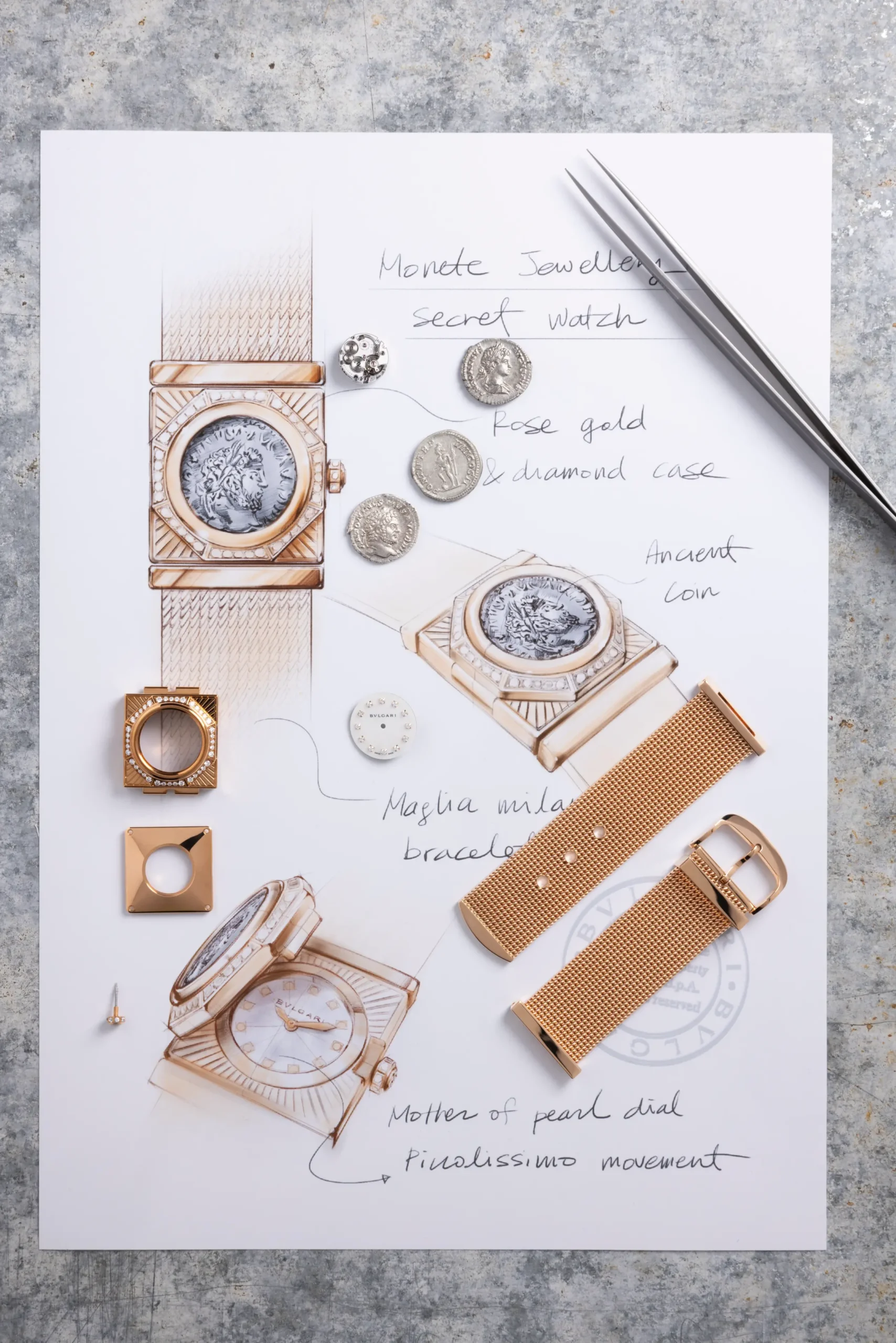마글리아 밀라네즈 모네떼(Maglia Milanese Monete) 시크릿 워치는 불가리가 1960년대 중반 처음 선보인 모네떼 컬렉션을 현대적으로 재해석한 모델이다. 첫인상부터 범상치 않다. 시크릿 워치 커버에는 카라칼라 황제(198-217 AD)를 묘사한 진귀한 고대 코인을 장식했다. 동전은 로즈 골드 원형 라인으로 감쌌고, 그 주변으로 다이아몬드를장식했다. 로즈 골드 소재의 커버를 열면 숨겨져 있던 영롱한 다이얼이 모습을 드러낸다. 화이트 자개 다이얼 위에는 12개의 다이아몬드 인덱스를 세팅했으며, 로즈 골드 도금 핸즈로 시간을 표시한다.