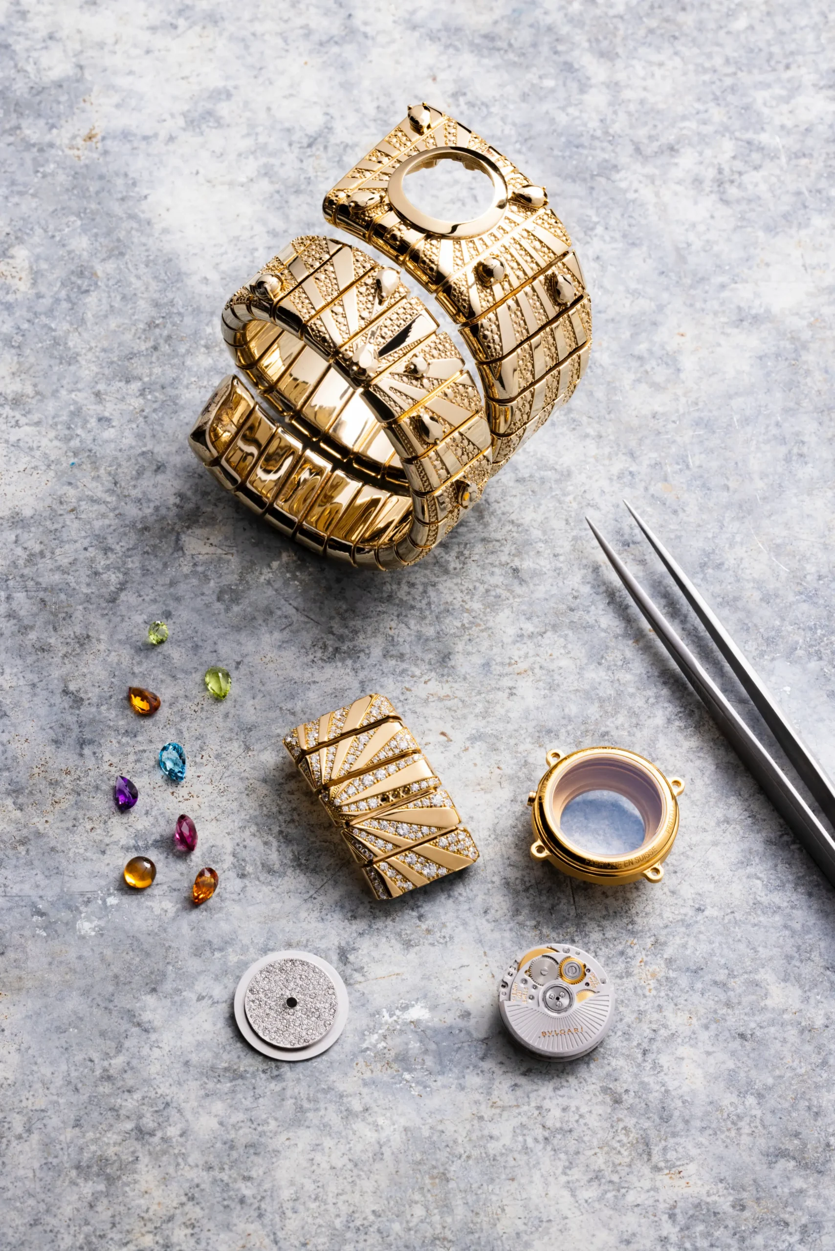 투보가스 망셰트는 불가리의 1974년 아카이브 모델에서 영감을 받았으며, 손목을 유연하게 감싸는 조형적인 형태가 특징이다. 참고로 산업 디자인에서 영감을 받은 투보가스 기법은 1940년대 불가리 최초로 세르펜티 브레이슬릿에 적용한 것으로, 가스 파이프의 금속 코일 구조를 닮은 데서 이름을 얻었다.