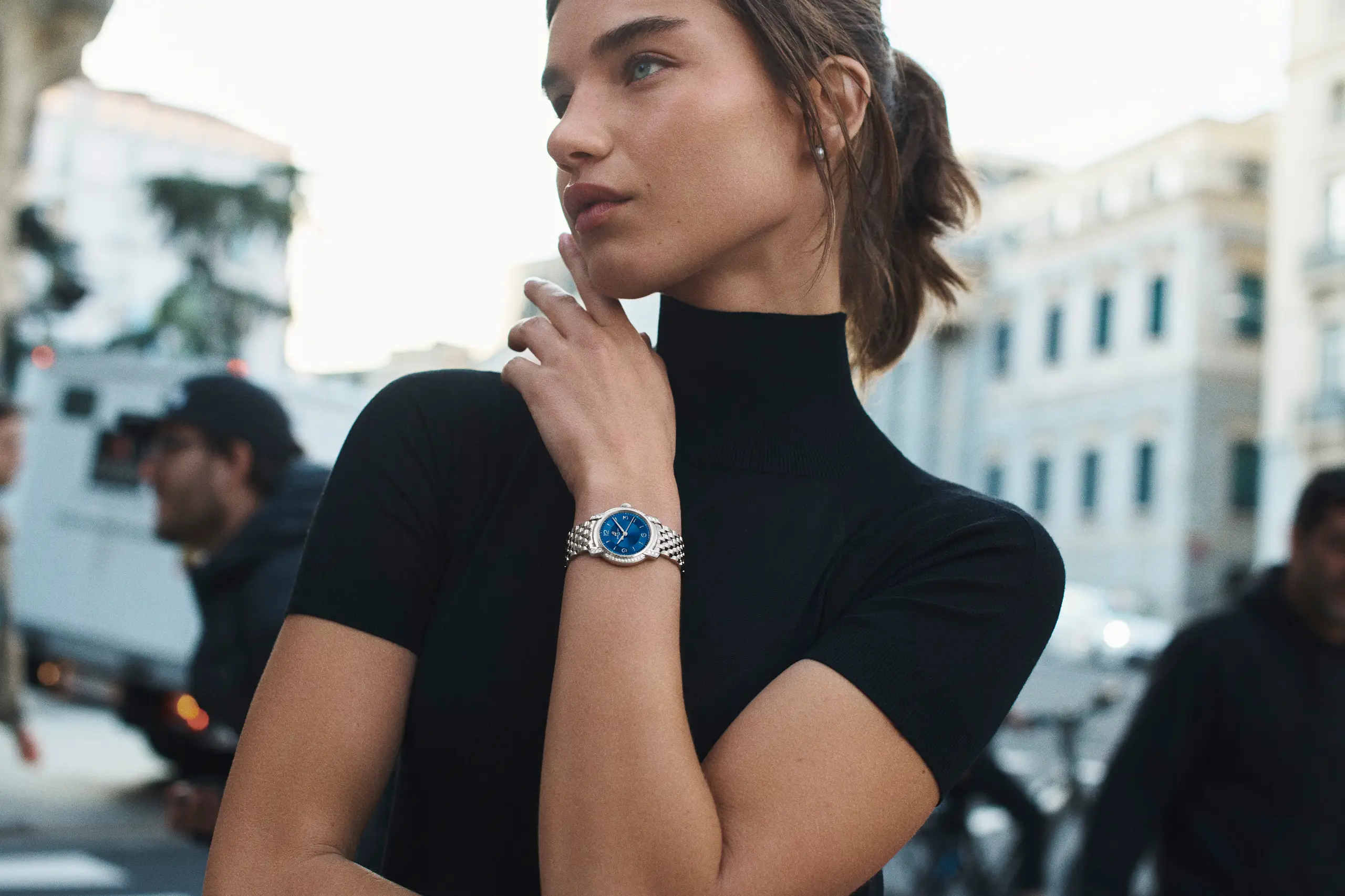 지름 32mm 모델은 블루, 블랙, 자개 다이얼 베리에이션을 갖췄다. 알파벳 V 형태로 가공한 7열 스테인리스 스틸 쉐브론 브레이슬릿은 남성용 모델에서 볼 수 있는 사선 처리한 브레이슬릿과 비슷하면서도 다른 느낌을 선사한다. 32mm 모델에는 COSC 인증을 받은 슈퍼 쿼츠 칼리버 77을 탑재했다. 32mm 모델 역시 36mm 모델과 마찬가지로 베젤과 러그에 다이아몬드를 세팅했다. 단, 자개 다이얼 모델은 다이아몬드 세팅을 하지 않았다. 다이얼 디자인은 36mm 모델과 동일하다. 중앙과 플린지는 새틴 솔레일 마감으로, 인덱스 주변은 원형 브러시드 마감으로 처리했다. 미니멀한 아라비아 숫자 인덱스와 마름모형 바늘도 같다.