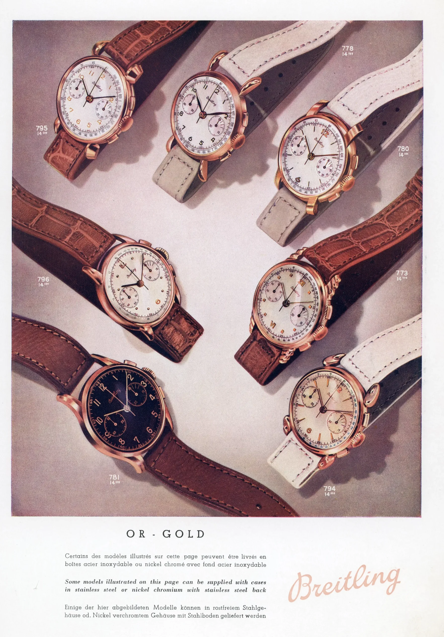 1940년대에 윌리 브라이틀링은 고급 소재와 우아한 디테일을 더한 프리미에르 라인을 선보이며 크로노그래프를 단순한 도구에서 스타일을 표현하는 아이템으로 격상시켰다. 그 중에는 여성을 위해 특별히 디자인한 최초의 크로노그래프도 있었다. 1960년대에는 스파이 영화 <패덤(Pathom)>에서 라켈 웰치가 착용하여 주목을 받았다(주: 패덤의 한국 제목은 레드 로즈 특공대).