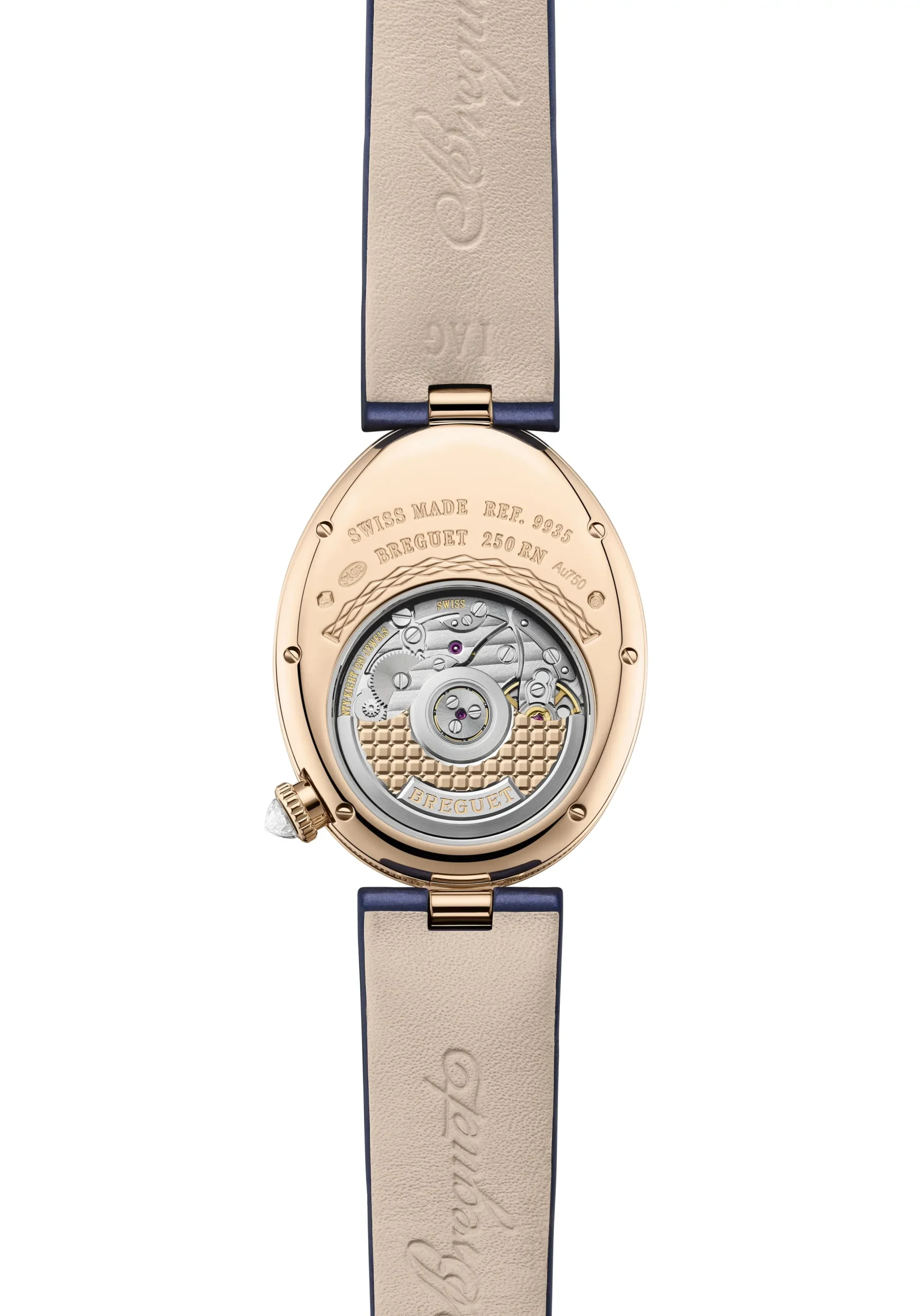 레인 드 네이플 9935는 모델에 따라 네이비 블루 앨리게이터 악어 가죽 스트랩 또는 브레게 골드로 제작한 브레이슬릿을 장착했다. 골드 브레이슬릿은 실제로 착용했을 때 대단히 편안한 착용감을 느낄 수 있다. 폴딩 버클은 이음새가 드러나지 않아 매끄러운 디자인을 가진다.