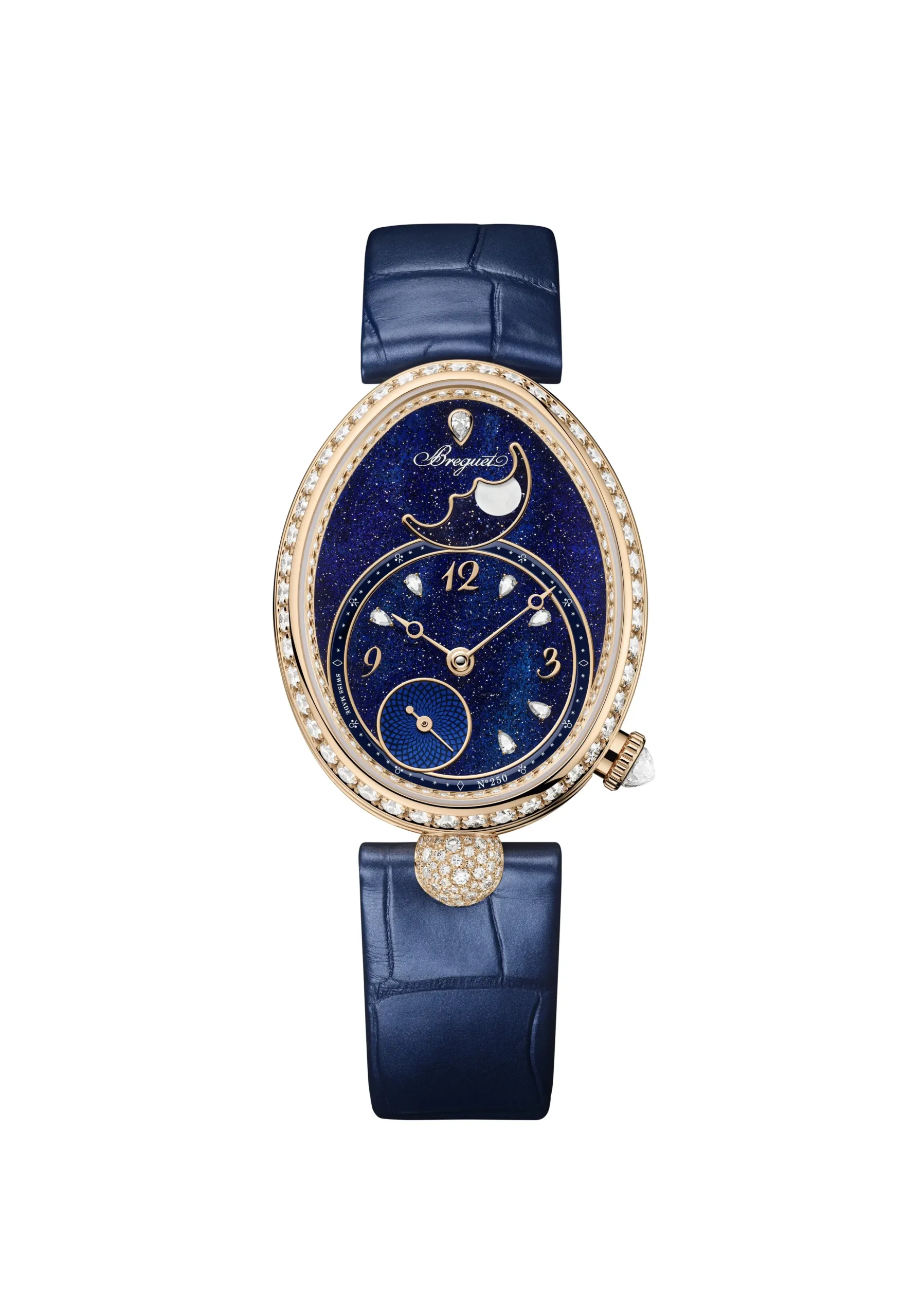 다이얼은 세 가지로 나뉜다. 첫 번째는 아벤추린 다이얼이다. 브레게는 자연스러운 광채를 내뿜는 아벤추린 다이얼에 깊이를 더하기 위해 아벤추린 글라스 아래에 얇은 타이티한 자개판을 깔았다. 덕분에 아벤추린 다이얼의 몽환적인 분위기와 자개의 부드러움이 더해져 어디에서도 보기 힘든 독특한 풍경을 만들어낸다. 살짝 위로 솟은 달은 자개로 제작했다. 이 역시 레인 드 네이플 컬렉션에서 처음 시도하는 것이다. 달에는 브레게 특유의 비밀 서명이 숨어 있다. 남은 두 개는 자개 다이얼과 1,387개의 다이아몬드와 1개의 블루 사파이어로 꾸민 풀 파베 다이얼이다. 열처리한 파란색 브레게 핸즈와 블루 사파이어가 화려한 색의 대비를 보여준다.