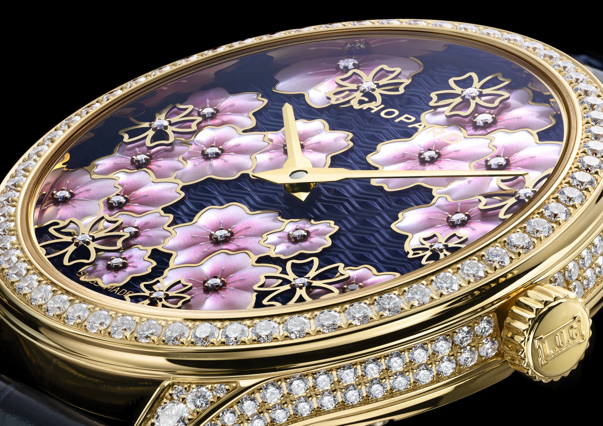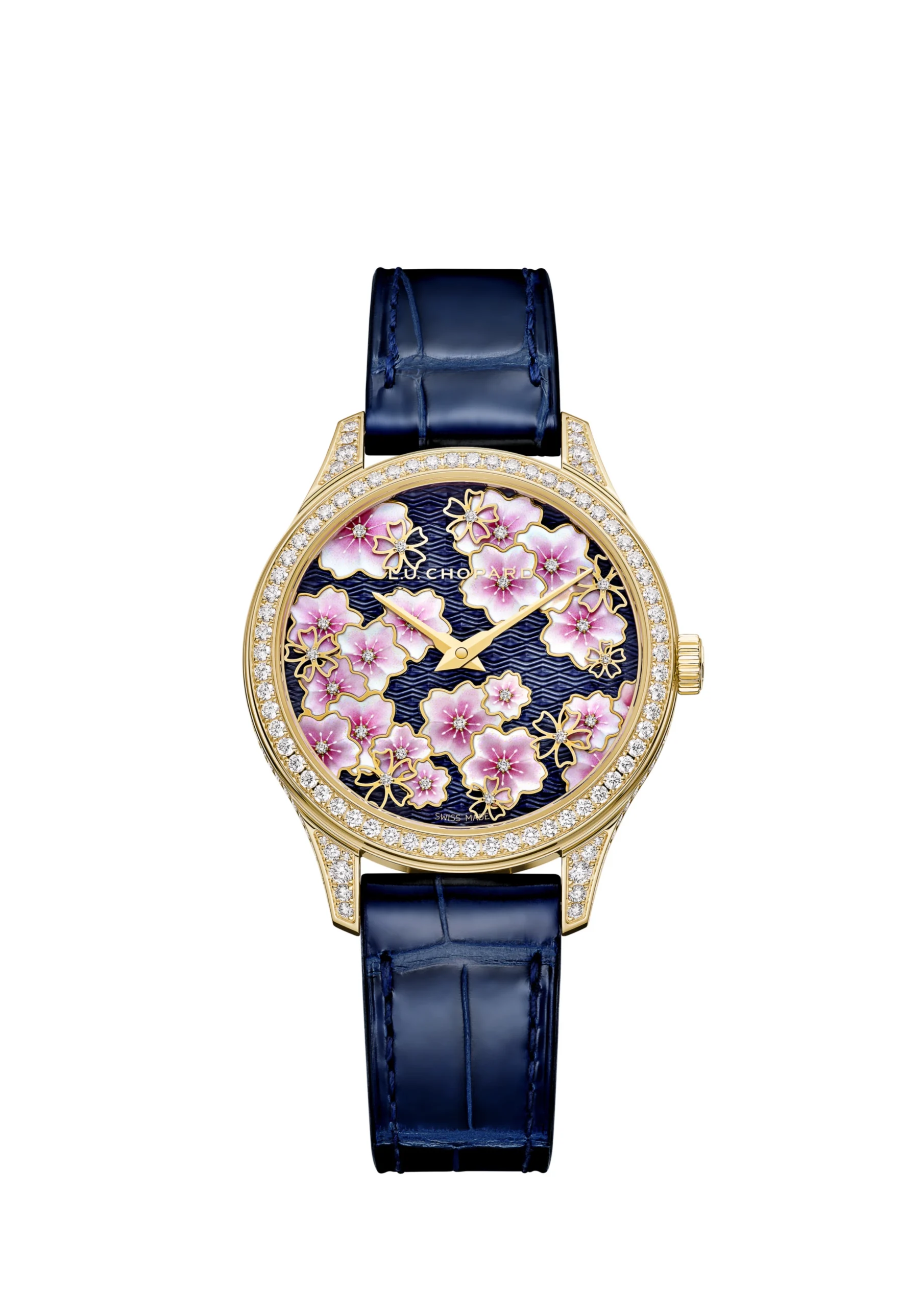 내부에는 플뢰리장(Fleurisanne) 인그레이빙으로 장식된 L.U.C 96.23-L 무브먼트가 탑재되어 있다. 화이트 골드 브리지 위에는 세밀하게 조각된 벚꽃 문양이 자리하며, 조각 후 섬세한 금도금(gilding)을 더한 뒤, 꽃 주변 표면을 한 점 한 점 찍어내며 대비를 만들어낸다. 그 결과, 꽃잎만이 금빛으로 남아있는 이중 톤의 예술적 무브먼트가 완성되었다. 초박형 구조임에도 골드 마이크로 로터가 두 개의 배럴을 효율적으로 감으면서 65시간의 파워리저브를 제공한다. 이 칼리버 덕분에 L.U.C XP 사쿠라 바이 나이트는 직경 35mm, 두께 7.70mm의 완벽한 비율을 갖출 수 있었다. 역시 8피스 한정 생산된다.