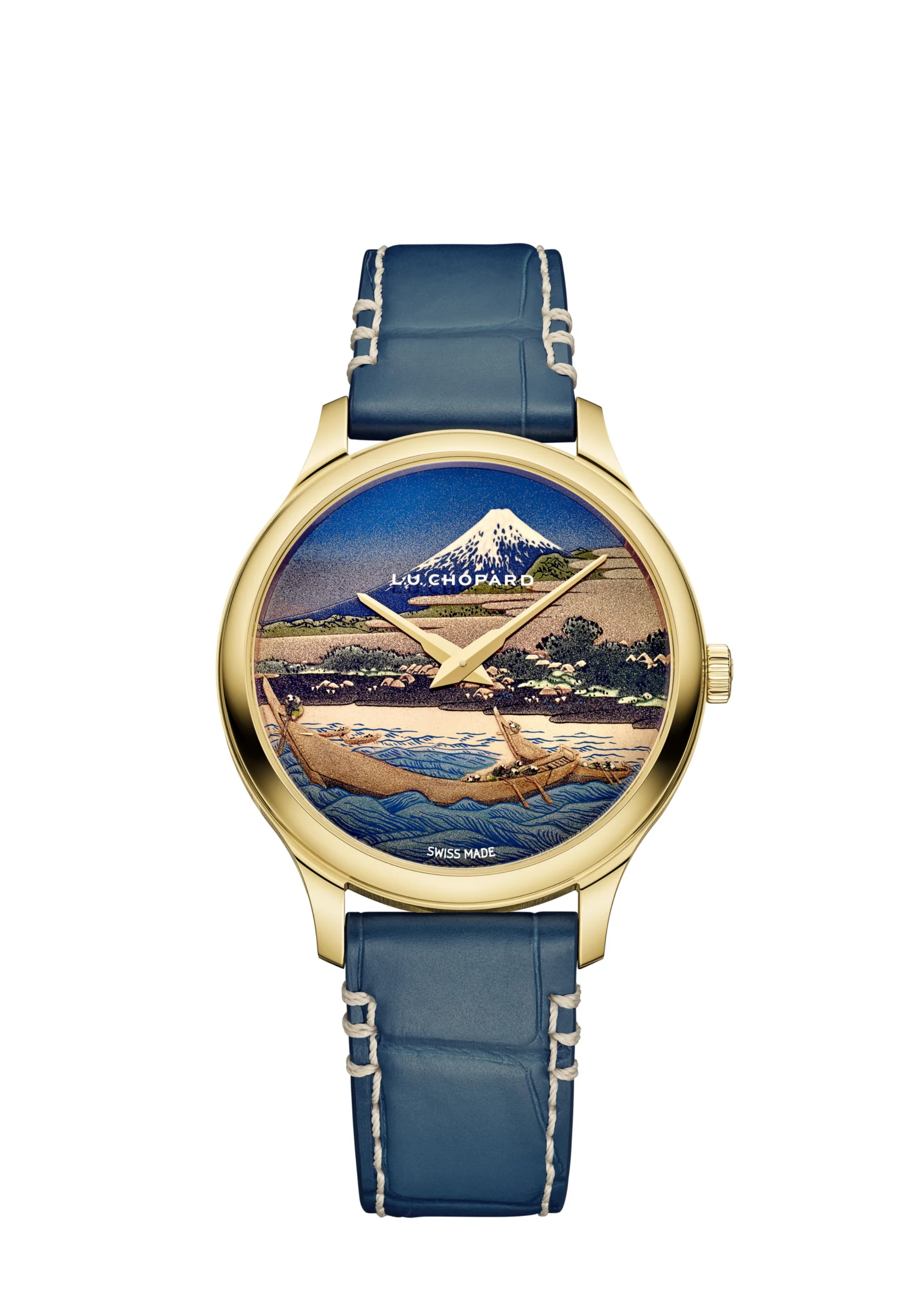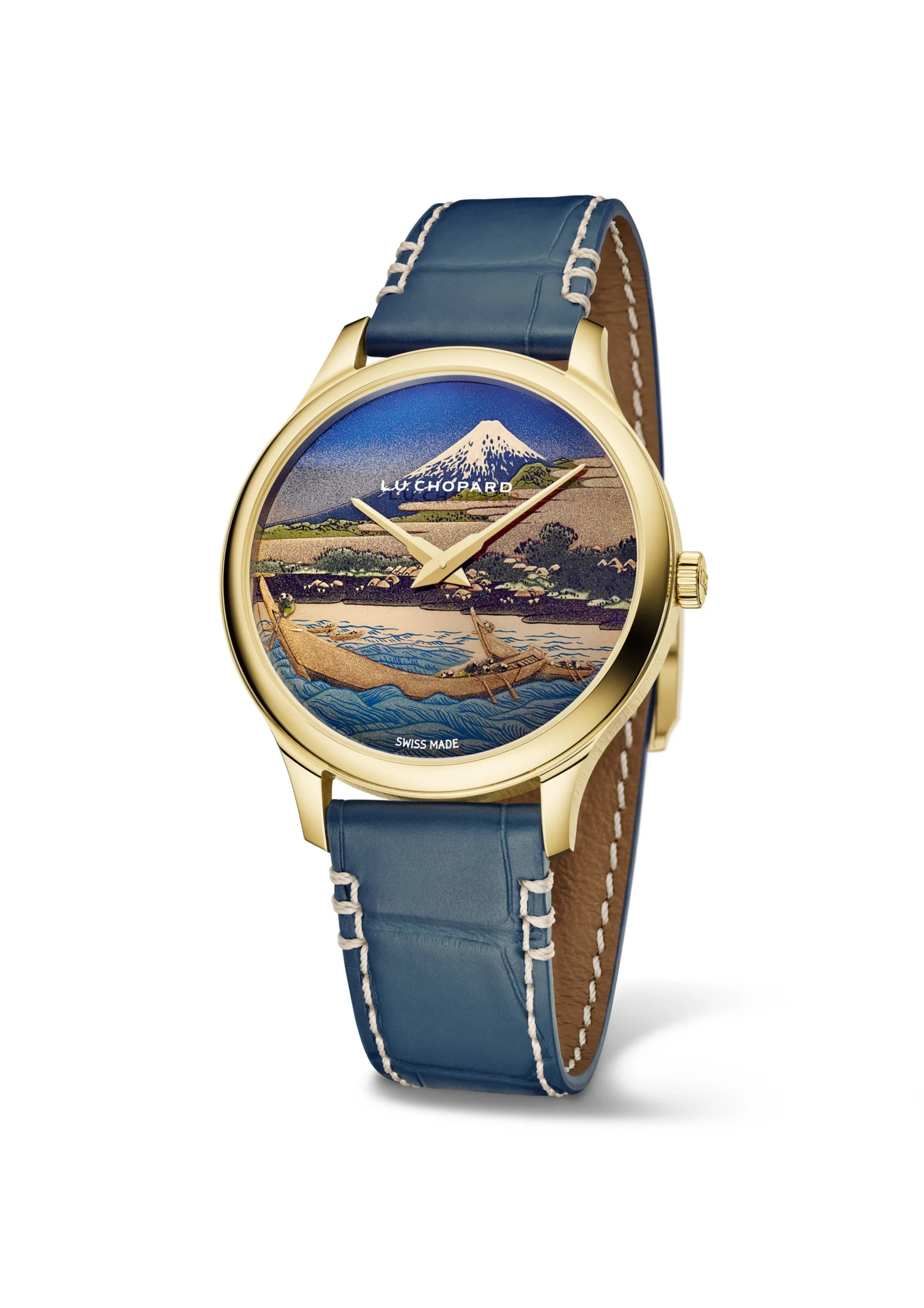 일본의 거장 판화가 가쓰시카 호쿠사이(1760-1849)의 대표작을 모티프로 한 작품으로, 후지산의 장엄한 모습을 섬세하게 담아냈다. 가쓰시카 호쿠사이가 창작한 〈후지산의 36경〉 연작은 대담한 구도와 빛, 계절, 시점의 변화를 통해 일본의 본질을 포착하며 우키요에 예술의 경계를 확장했다. 그 중에서도 ‘타고 만(Tago Bay)’은 역동적인 바다 풍경을 담고 있는데, 바로 이 작품이 이번 L.U.C XP 우루시 우키요에 다이얼의 모티프가 되었다.