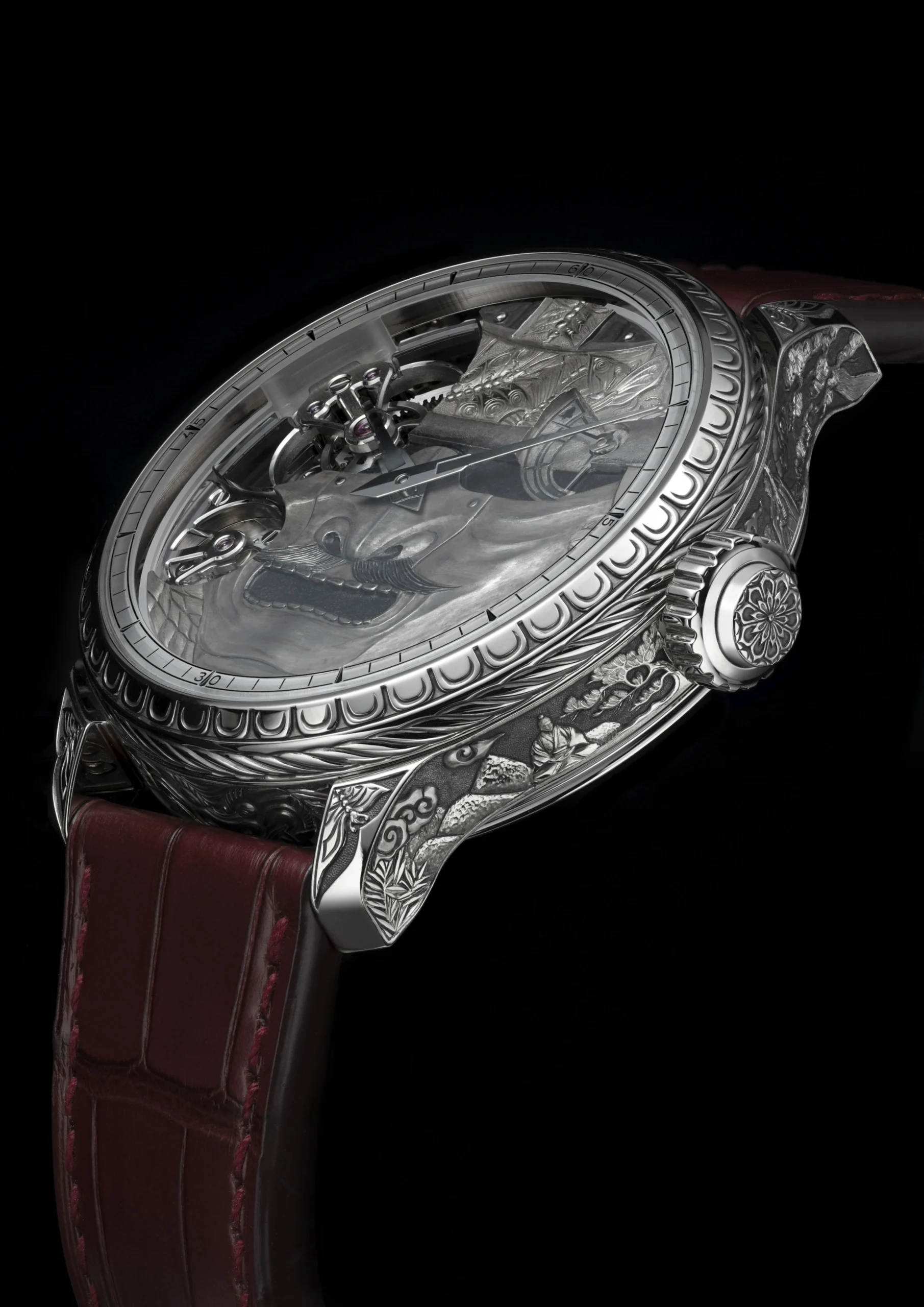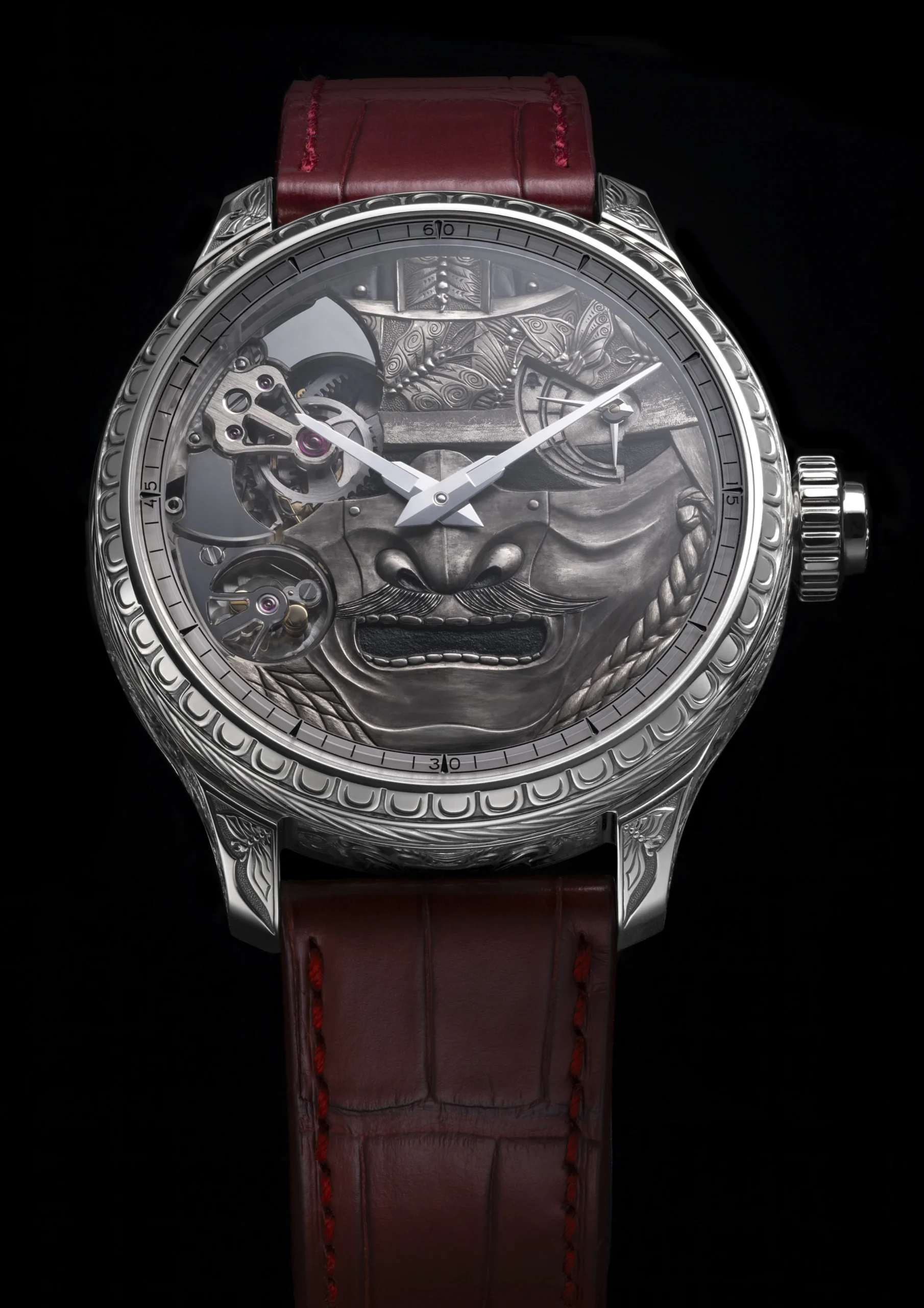 - 화이트 골드 다이얼에 사무라이 마스크 모티프 핸드 인그레이빙