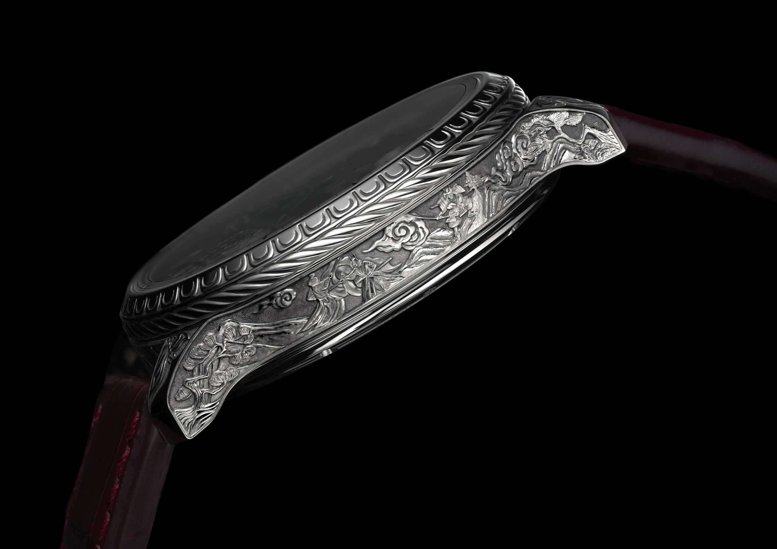 케이스 밴드에는 전투 장면과 명상적 순간을 부조로 조각해, 무도(武道)의 규율과 영적 탐구의 이중성을 표현했다. 러그 사이에는 일본 요괴 오니(鬼)를 정교하게 새겼고, 베젤에는 전통 갑옷의 끈 장식(오도시)과 고대 마스크에서 영감을 얻은 문양을 더해 시각적 완성도를 높였다. 무브먼트에는 파도 문양과 신전의 수호사자인 코마이누(狛犬)가 새겨져 있으며, 크라운에는 명예·용기·힘을 상징하는 모란 문양이 장식되어 있다. 이 모든 디테일은 일본 미학과 정신성에 대한 헌사이자 시간을 예술로 새겨낸 작업이다.