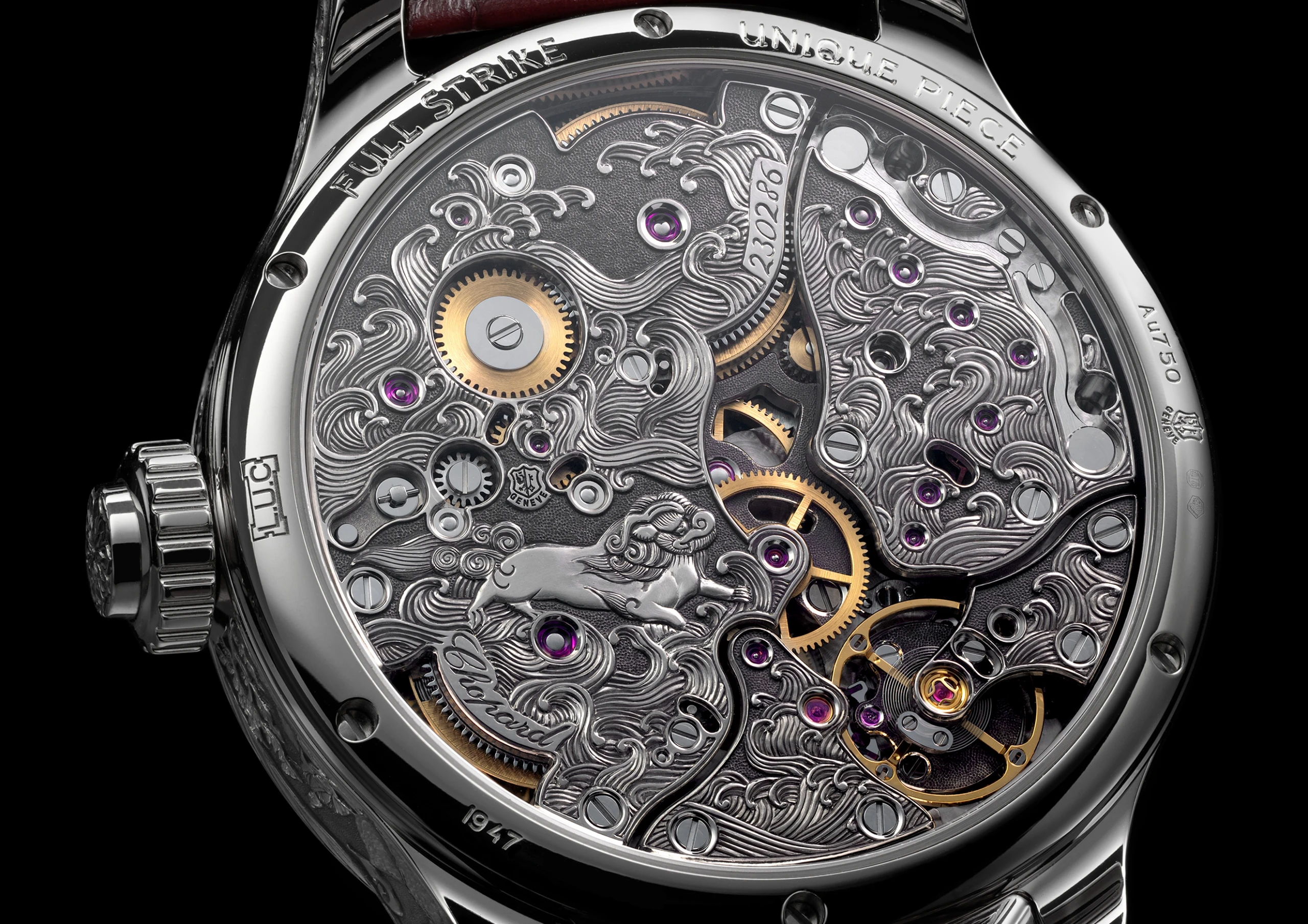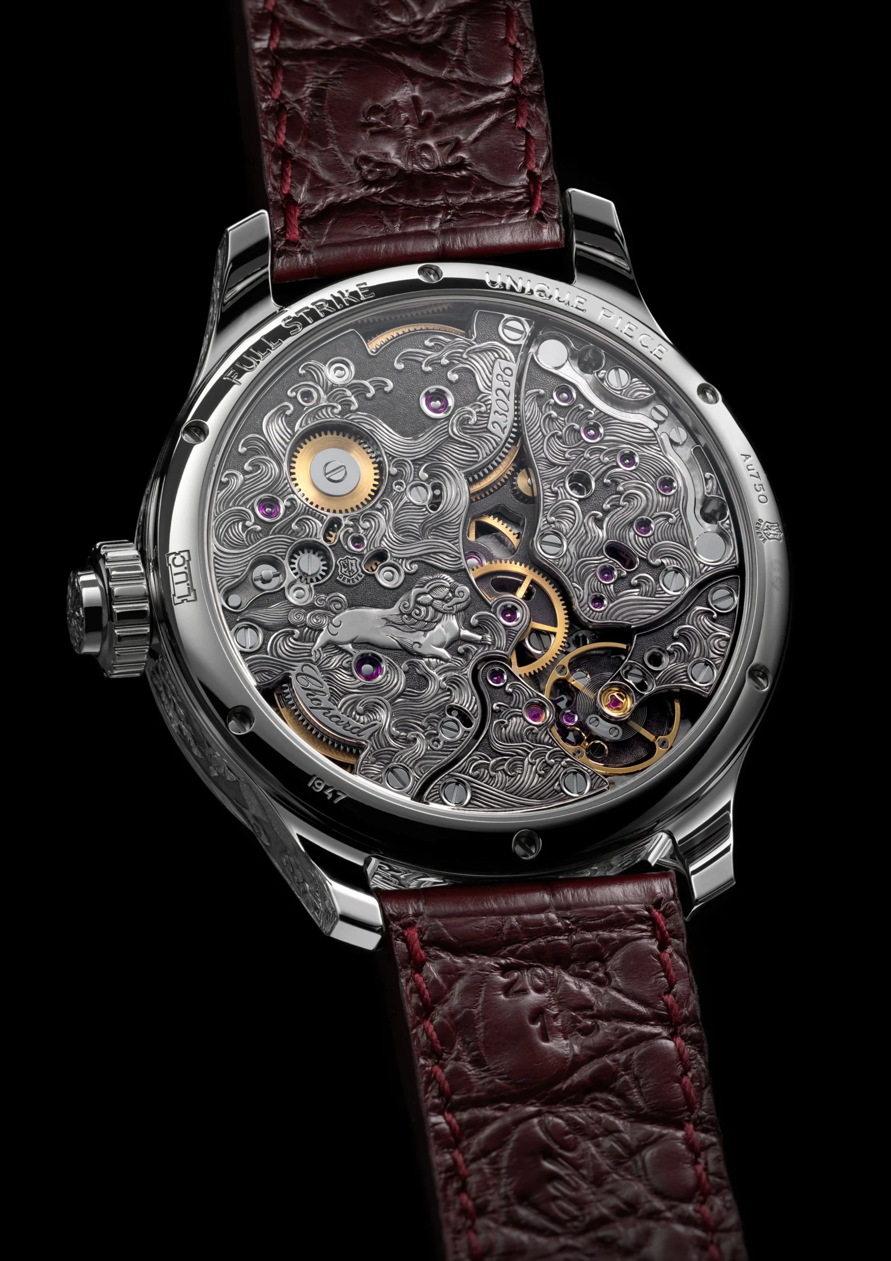 아울러 푸셔 분리 장치(pusher disengagement system)를 적용해 차임이 울리고 있는 동안 푸셔를 누르더라도 작동 메커니즘과 분리되어 시계를 안전하게 보호한다. 별도의 배럴을 장착하여 최대 12회의 완전한 타임 스트라이크를 구현할 수 있으며, 에너지가 부족할 경우에는 타격이 시작되지 않아 불완전한 울림을 방지한다. 또한 일정한 강도로 매 타격을 유지하도록 설계되었으며, 시침, 쿼터, 분침의 울림 간 불필요한 정적을 제거하여 연속적이고 유려한 사운드를 들려준다. 2시 방향의 인디케이터로 타격 메커니즘의 파워리저브와 시계의 60시간 파워리저브를 함께 표시한다.