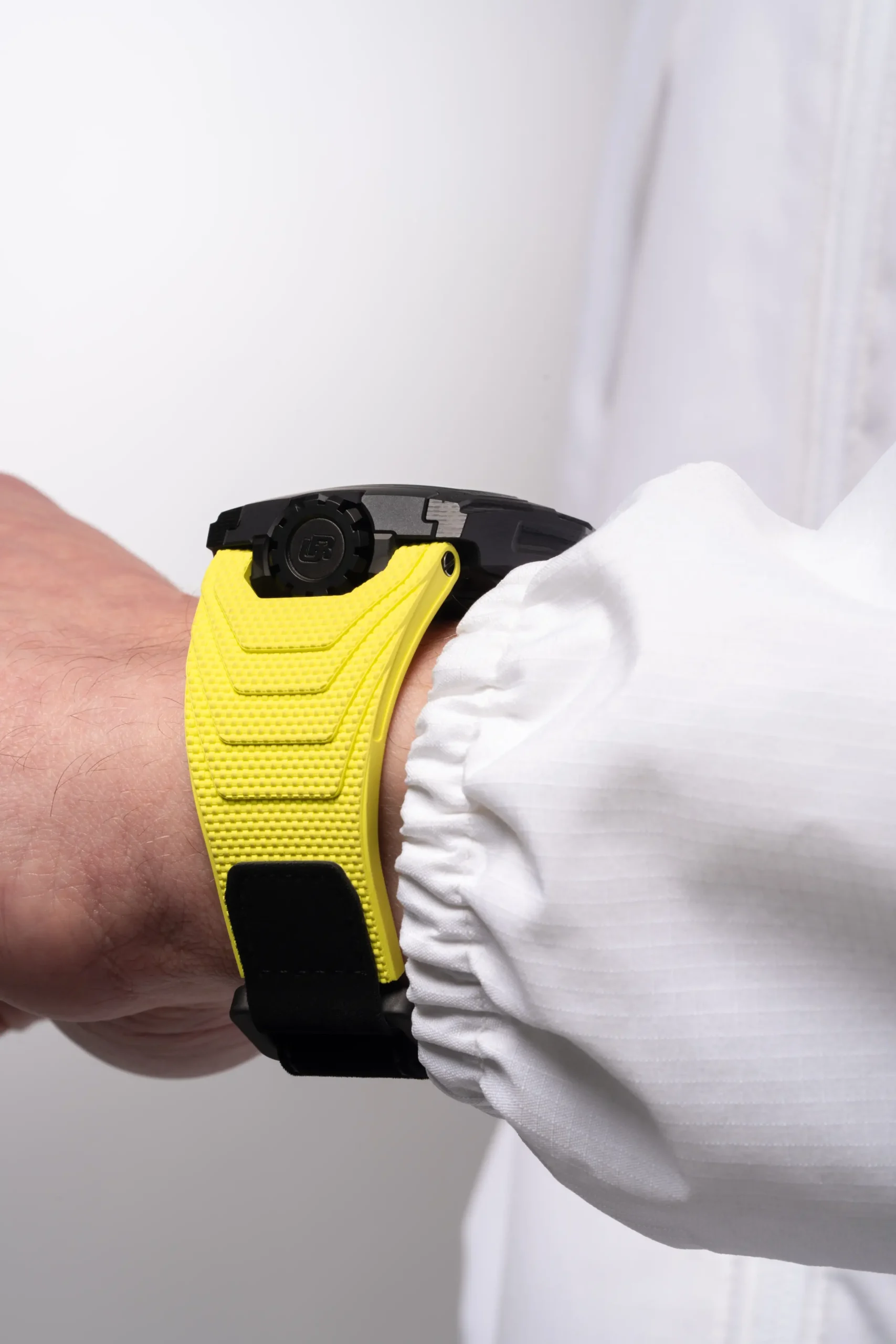 노란색 러버 스트랩은 벨크로 방식으로 간편하게 착용하고 풀 수 있다.