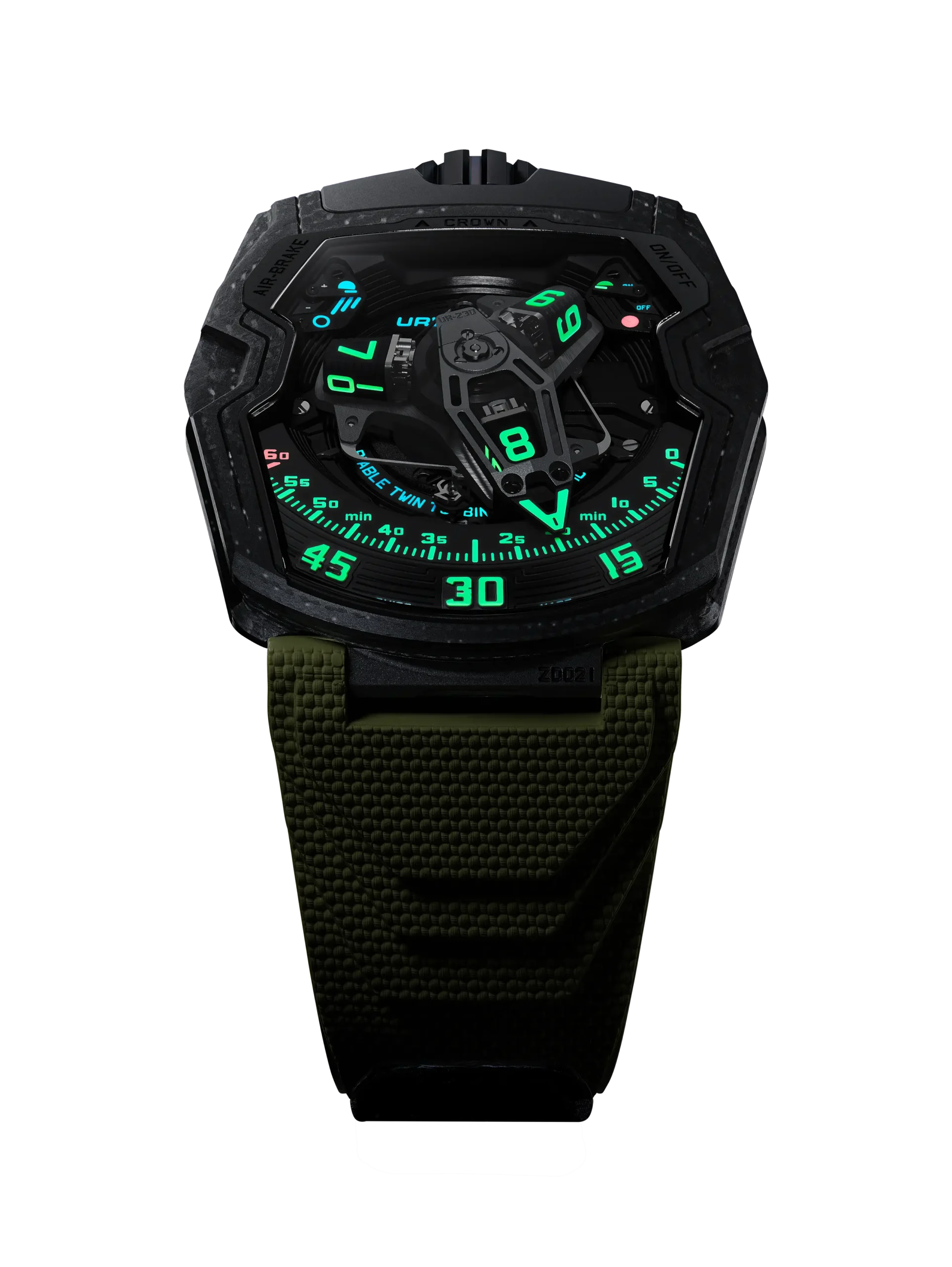 새틀라이트 디스플레이를 레트로그레이드와 접목시킨 메커니즘은 우르베르크의 시그니처나 다름없다. 이 메커니즘의 기원은 2005년에 출시한 오푸스 5와 2012년에 출시한 UR-210에서 찾을 수 있다. 원더링 아워, 3D 레트로그레이드 분침, 3개의 큐브로 이루어진 새틀라이트 디스플레이가 하나로 통합되어 있다. 4개의 면으로 이루어진 큐브는 60분 동안 120° 회전한다. 오픈워크 처리한 3D 레트로그레이드 분침은 새틀라이트 디스플레이를 따라 0부터 60까지 이동한다. 60분에 도달하면 3D 레트로그레이드 분침은 0으로 회귀해 다음 큐브와 새로운 여정을 시작한다. 야광색 슈퍼루미노바로 칠한 인덱스는 강렬한 색의 대비를 이루며 뛰어난 가독성을 제공한다.