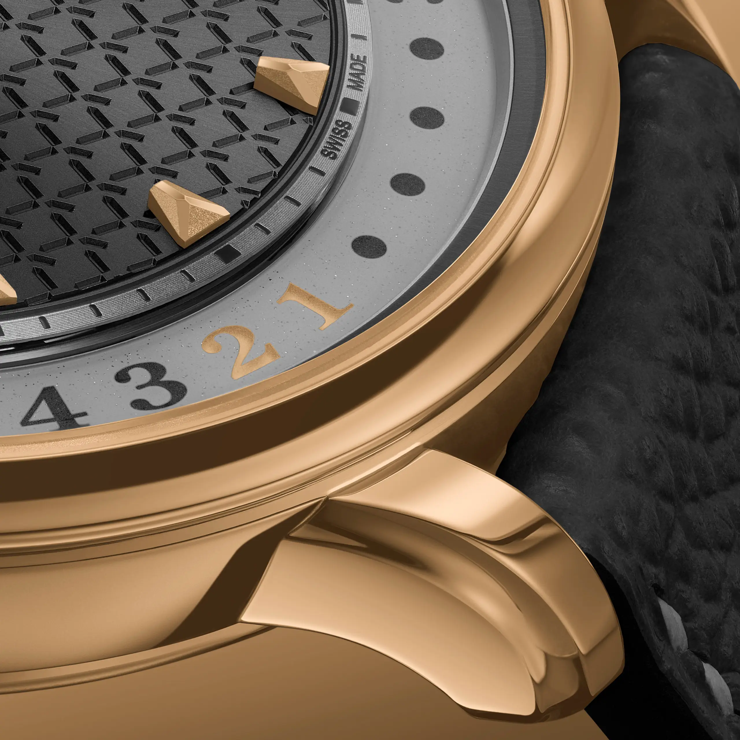 안트라사이트 컬러의 도마뱀 가죽 스트랩과 로즈 골드 핀 버클을 매칭했다.