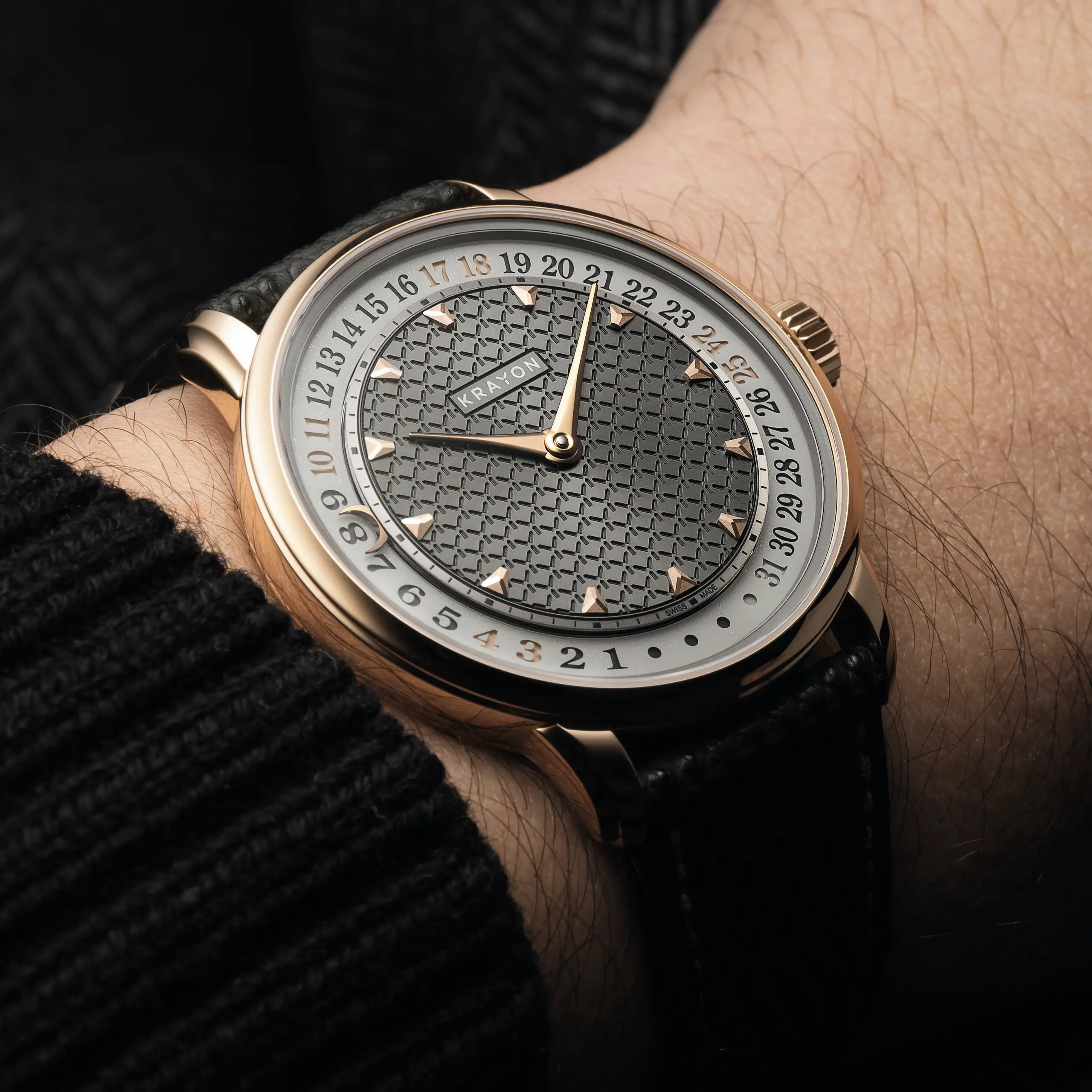 사용자는 다이얼에서 한 달을 통째로 확인할 수 있다. 오늘이 몇일인지, 다가올 주는 어떻게 구성되는지를 한 눈에 파악할 수 있다. 이를 통해 단순한 시간 측정을 넘어 마치 다이어리의 한 페이지 같은 느낌을 전달한다. 다이얼은 크게 시간을 표시하는 중앙부와 날짜를 표시하는 외곽으로 나뉜다. 시침과 분침은 12개의 아플리케 인덱스와 함께 시간을 알려준다. 로즈 골드와 강렬한 대비를 이루는 안트라사이트 그레이 선버스트 다이얼은 크래용의 시그니처인 알파벳 Y 형태의 기요셰 패턴으로 장식했다.